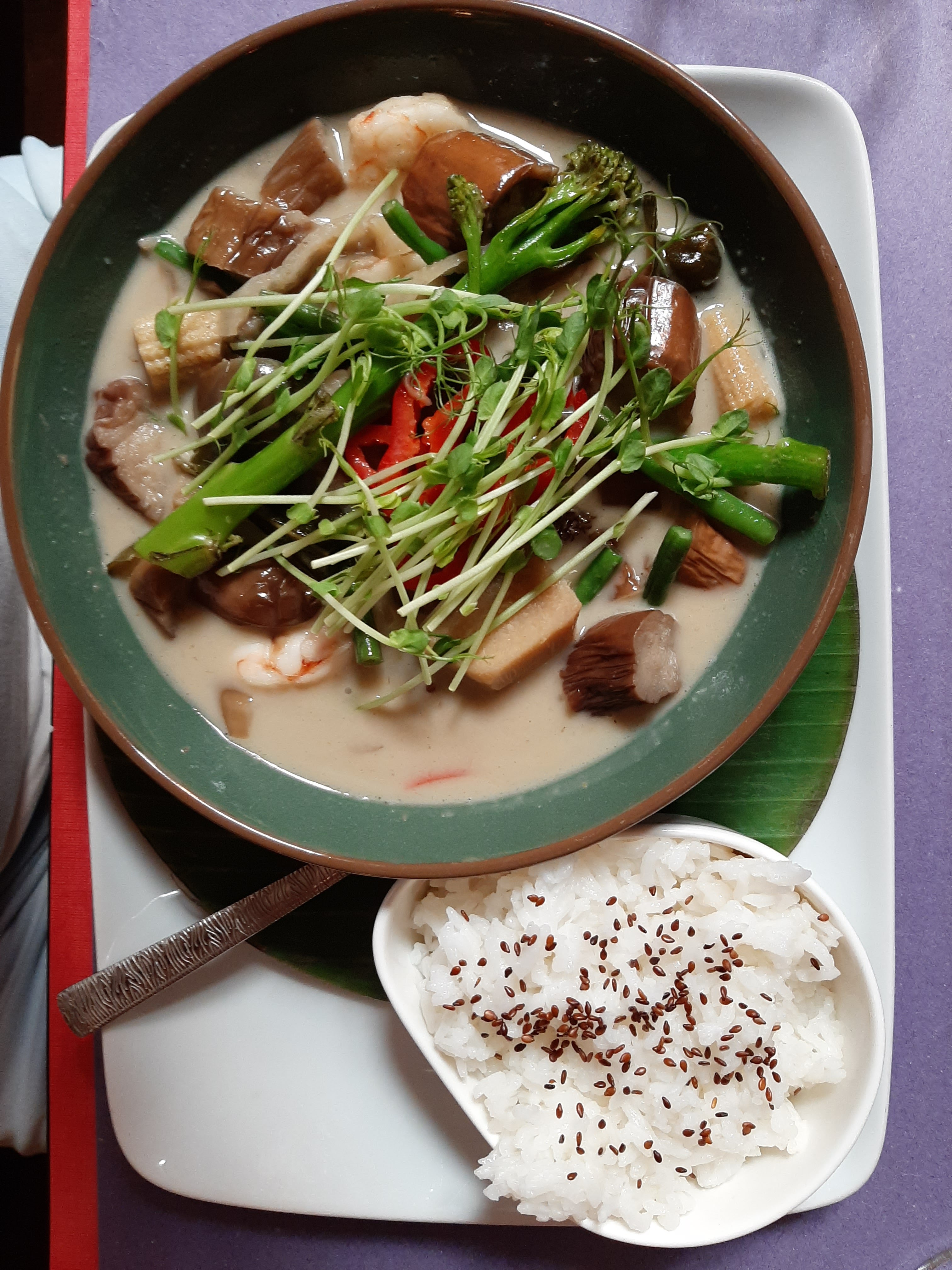 Décoration atypique qui vaut d'y aller Assiette de charcuterie top ainsi que les crevettes au curry vert, dessert au chocolat moyen, au chocolat au lait alors qu'un chocolat noir irait mieux, Le restaurateur au lieu de prendre en compte l'avis et de donner des explications sympas répond d'une manière beaucoup trop explosive. Avec des ! !! !!! Pas cool 😧