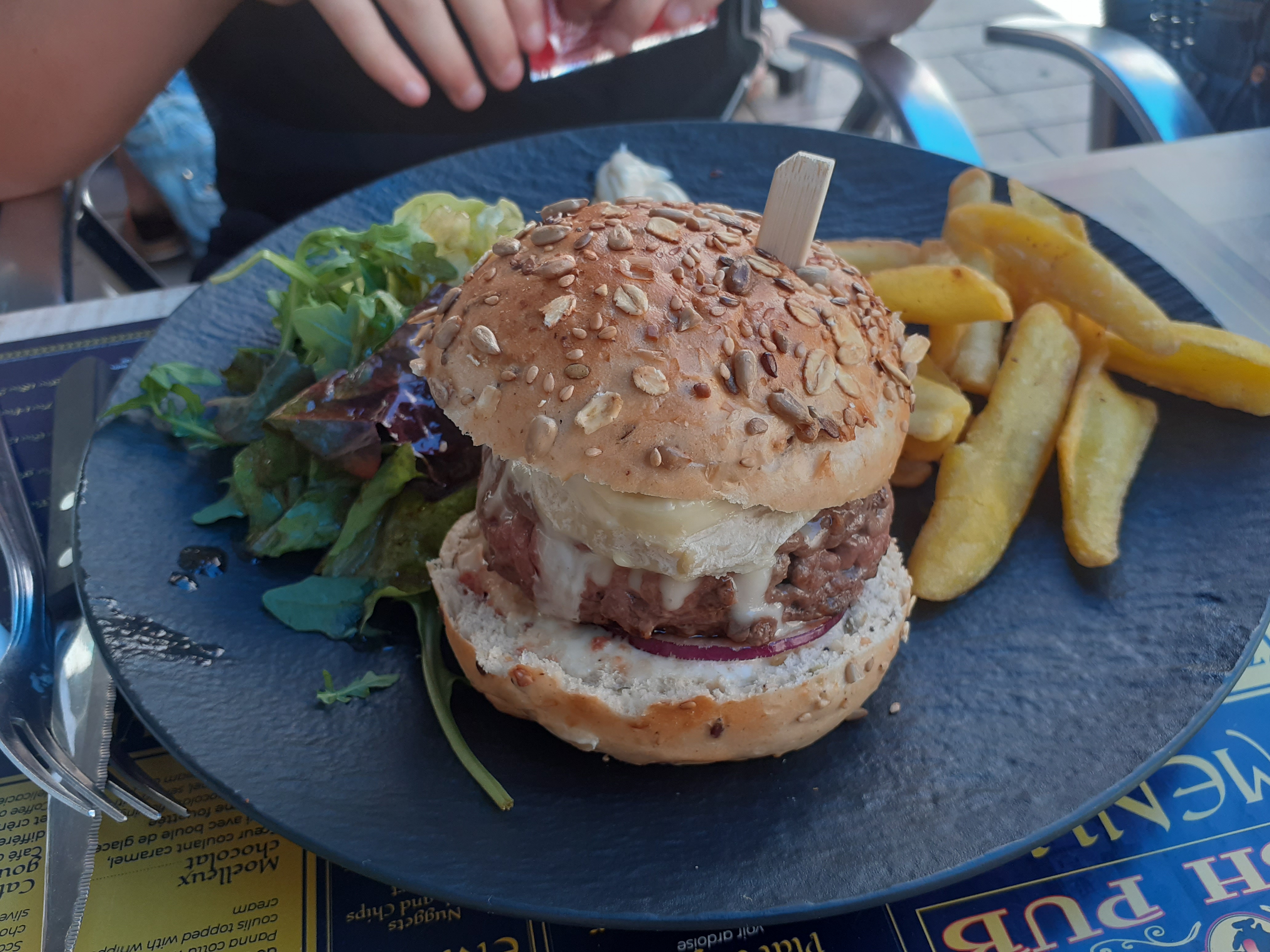 Grand pub avec billard, très bien décoré, bon accueil, grande terrasse au calme sans circulation, service efficace. Burgers excellents et très copieux