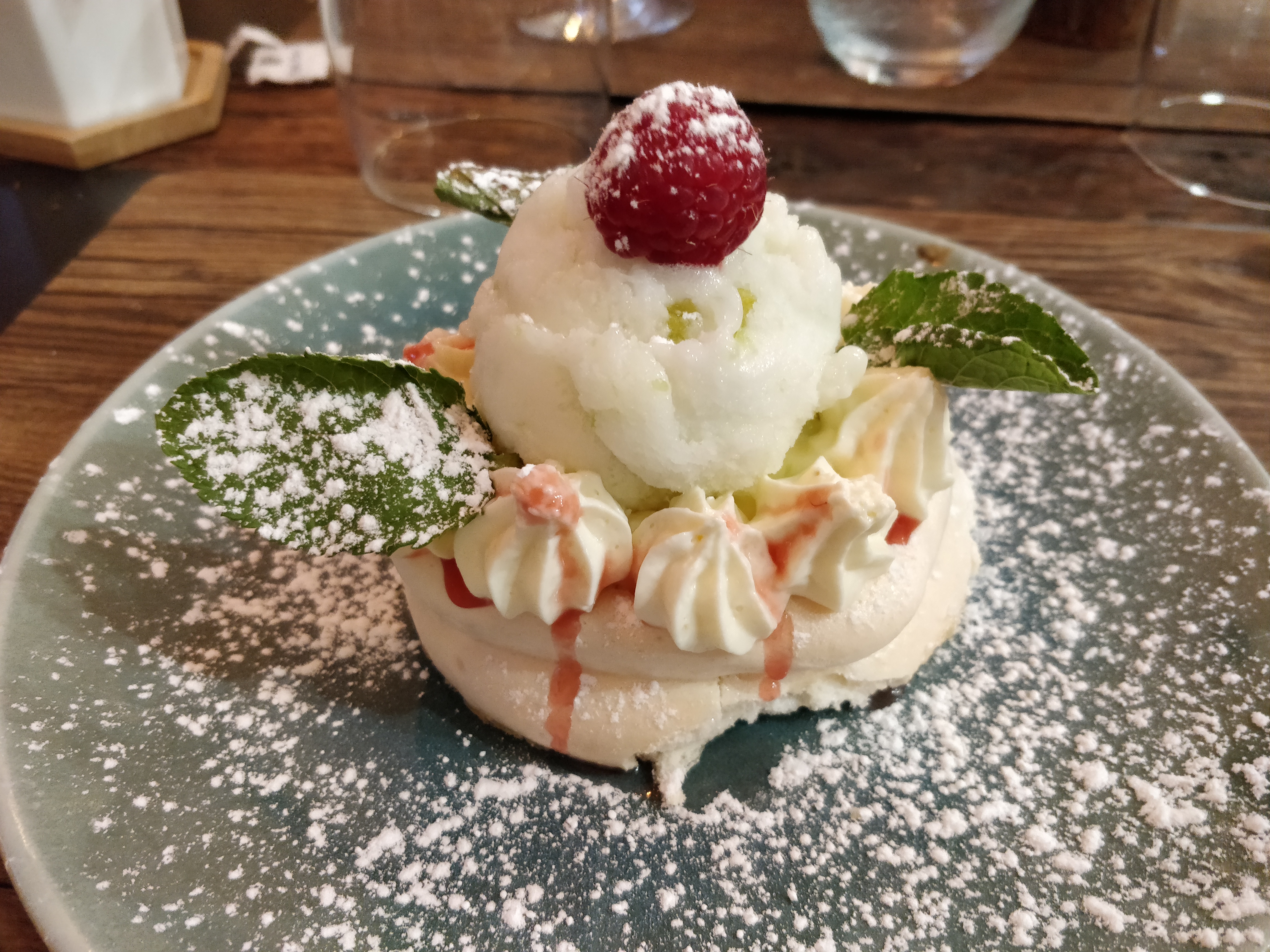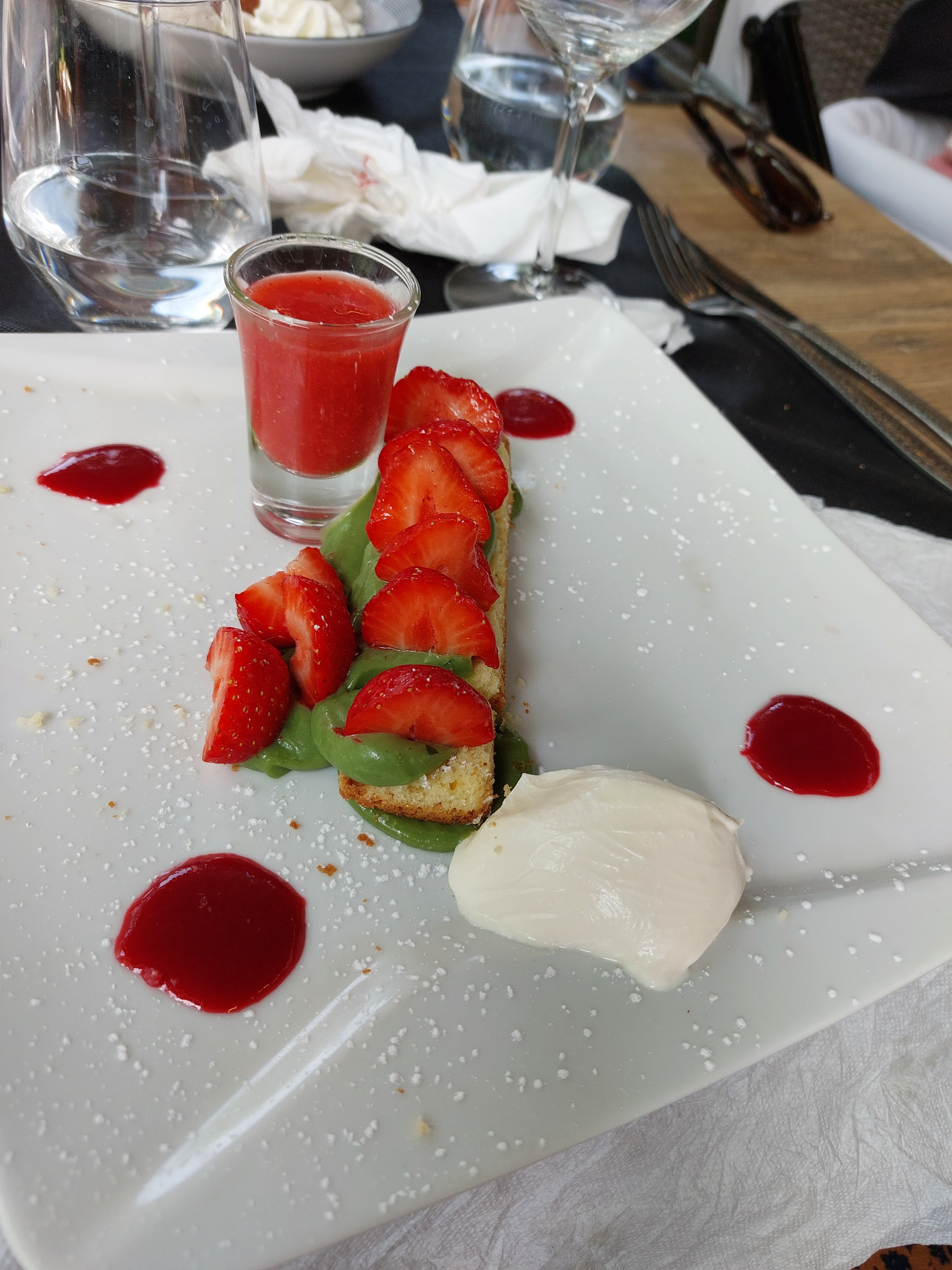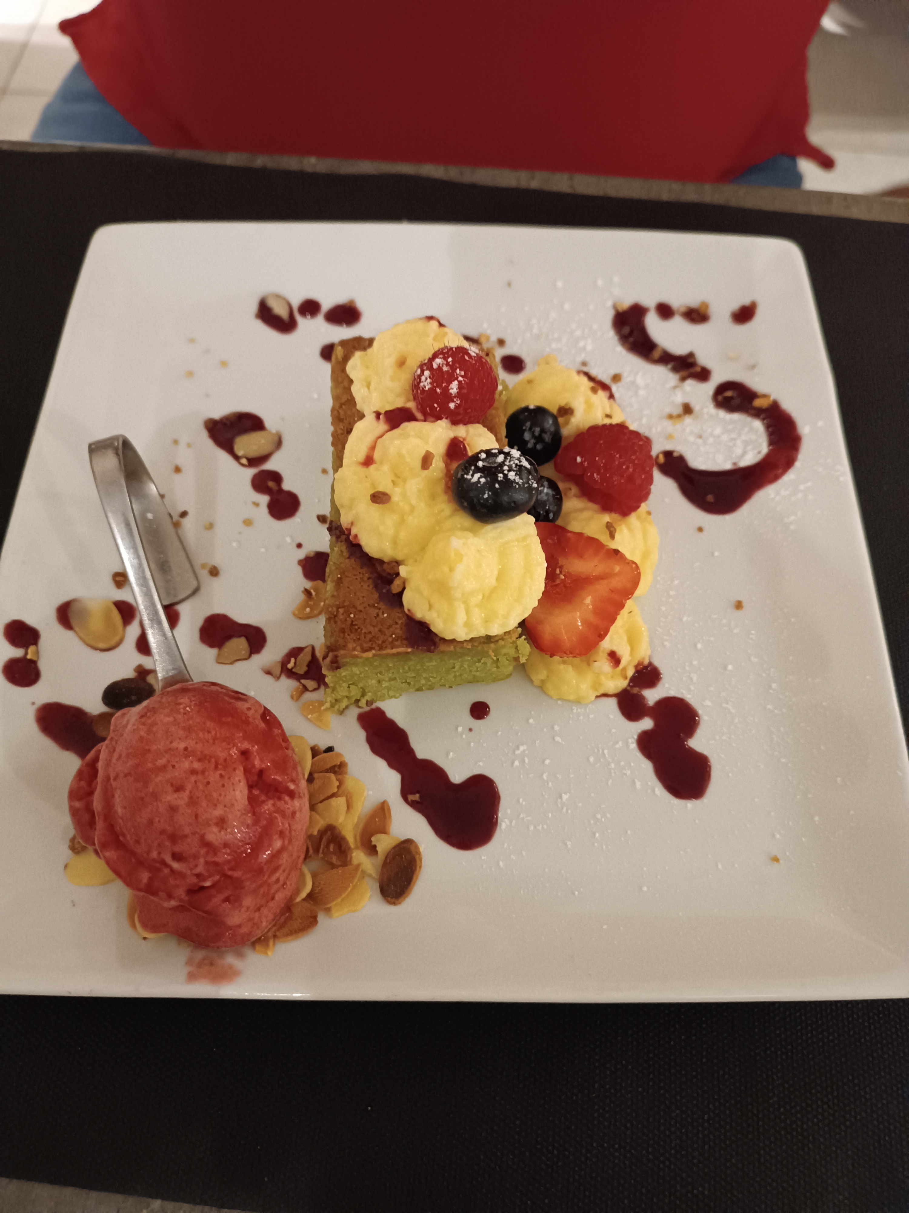 Cadre très agréable malgré les moustiques en fin de soirée. Serveuse très prévenante. Belle présentation des plats. Un peu cher par rapport à la qualité. Un soucis sur le coulis de framboise qui était tourné (mauvais gout)dans le dôme myrtilles framboise.