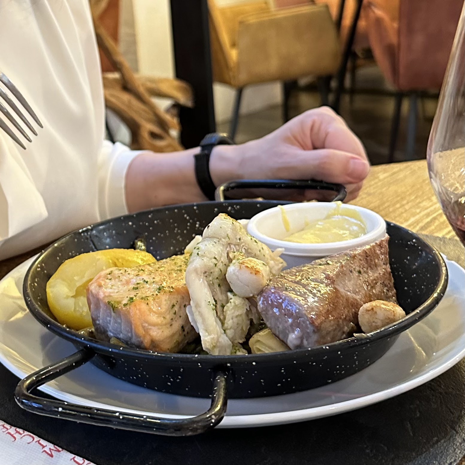 Les assiettes sont plaisantes et délicieuses, la carte est variée! On y mange très bien! Gros point négatif cependant, nous avions réservé une table pour 20 personnes, l’un d’entre nous avait une chaise de dehors alors que nous avions tous des fauteuils, la serveuse a refusé de nous la changé! Avec un non catégorique.. Aberrant sachant qu’on y lache quand même un bon billet.!!!! Puis à l’addition grosse erreur, qui nous a presque rajouté 60€ supplémentaire. Bref on y a bien mangé mais pour le reste on y reviendra plus