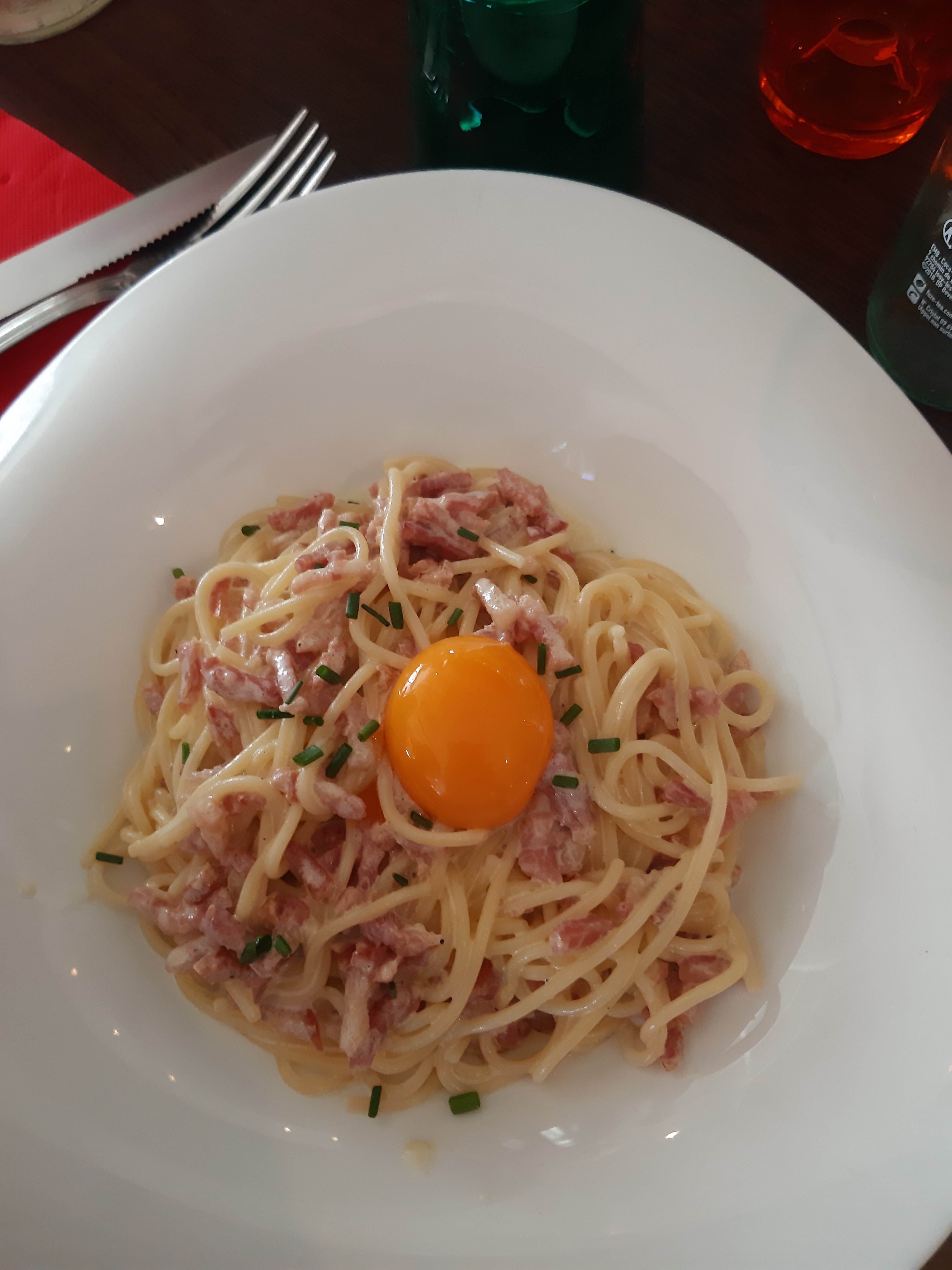 Nous avons pris des pizzas et des pates à la carbonara. Les pizzas étaient bonnes et les pates carbonara excellente
