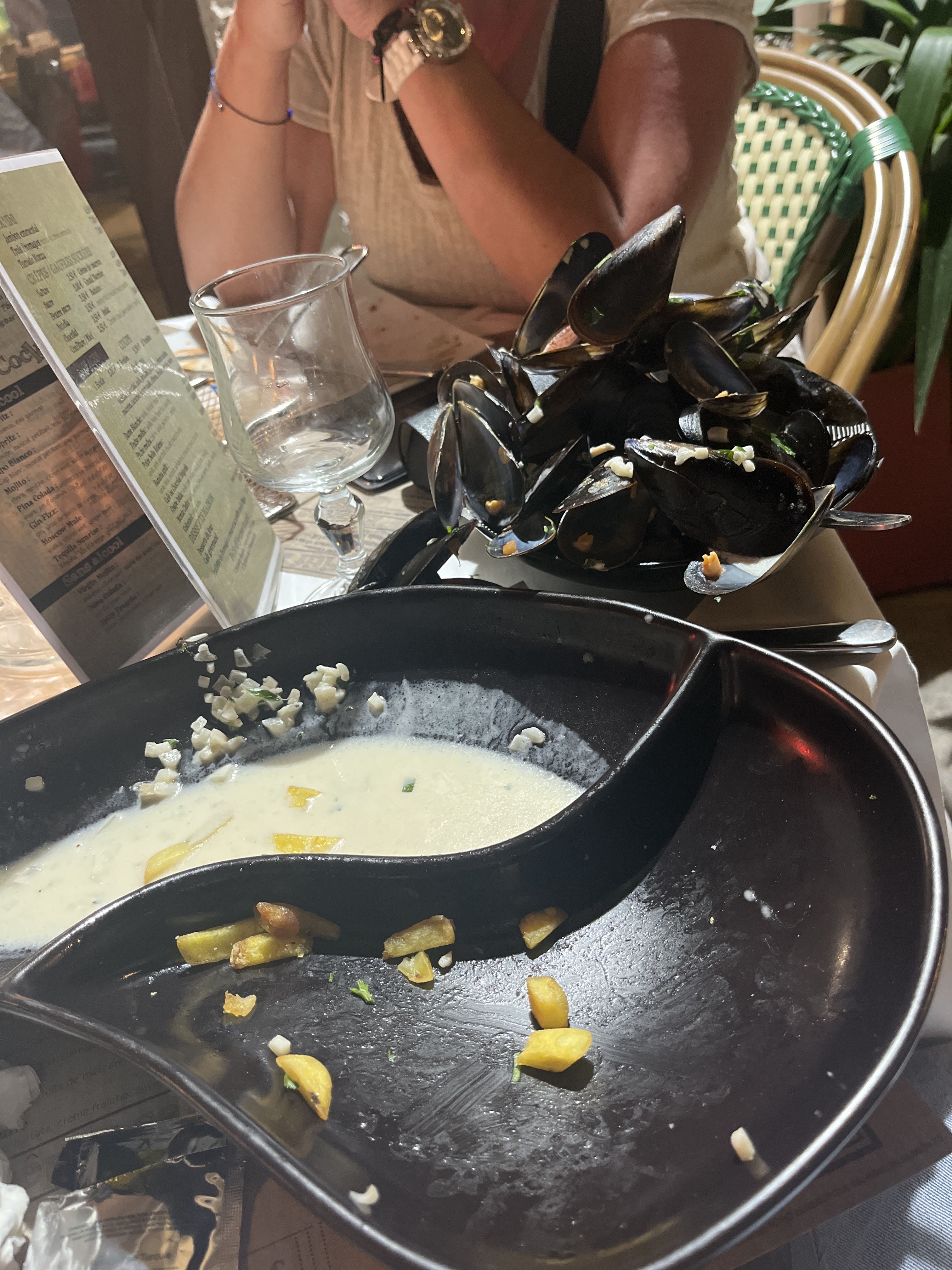 Moules frites froides et servies dans le meme plats avec un gout de pas frais malgre le fait qu'elles aient ete soit disant livré le matin meme. Nous demandons l'addition qui n'arrive pas donc nous nous deplacons au comptoir ou je recois de nombreuses reflexions pour avoir renvoyé les moules en cuisine. L' une des serveuses en cuisine pestifere dans sa barbe devant moi et est agressive en me suggerant ironiquement si on aime pas les moules on ne prend pas des moules Je suis extremement decue du service et de la qualité des plats. Cependant un des serveurs et la manager sont restés professionnels contrairement au reste du personnel. Je ne recommande pas ce restaurant aux personnes qui aiment l'amabilité et la bonne nourriture.