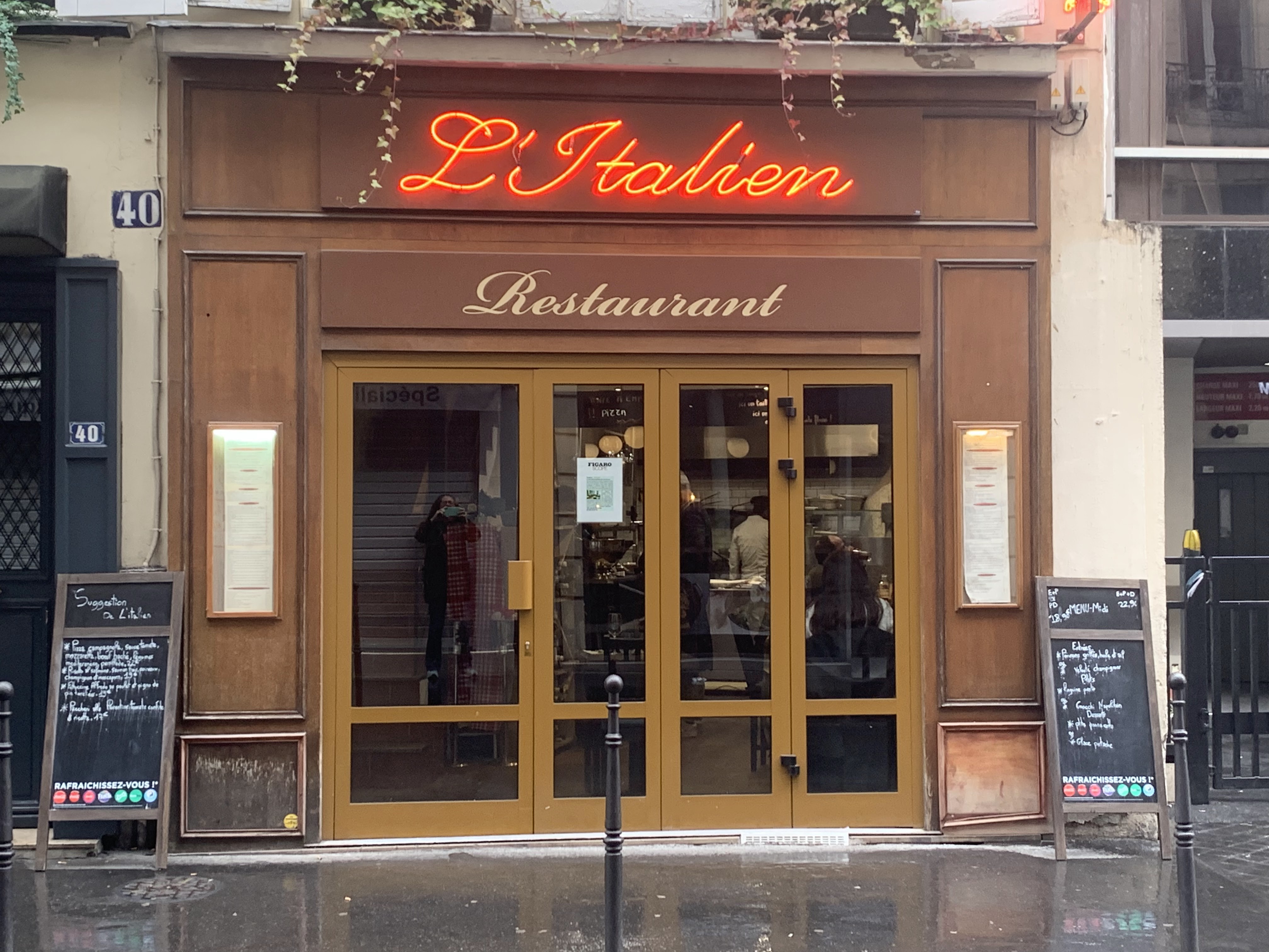 NE PRENEZ JAMAIS LE MENU ! Enthousiaste à l'idée de venir dans ce restaurant si bien noté, ce fut la douche froide par la suite... Nos amis ont pris des pizzas qu'ils ont trouvé bonnes et nous avons pris le menu. Un menu, dans n'importe quel restaurant à Paris, même les plus réputés, c'est un aperçu du menu ou les plats du moment, mais avec la qualité du reste de la carte. Si l'entrée était bonne, le Caccio e pepe un véritable désastre pour un restaurant italien osant s'appeler L'Italien. Le caccio e pepe c'est quoi ? c'est un plat typique italien avec trois ingrédients en plus des pâtes : du poivre noir, du pecorino romano et de l'eau de cuisson des pâtes. Le tout forme un ensemble crémeux, fort à cause du poivre, mais excellent. Sur les 3 plats de caccio e pepe, 2 étaient sans sauce donc secs, le troisième plein d'eau, le tout avec beaucoup d'ail, et quelques pincées de fromages (pecorino ou parmesan, on ne sait pas, mais clairement pas assez pour rattraper cette catastrophe). C'était très fort et sans intérêt, contrairement au plat qu'il devait être. Mais le pire reste à venir. Le dessert a mis extrêmement longtemps à venir pour une simple glace vanille avec une sauce chocolat. On peut penser qu'il s'agit d'une glace artisanale avec un coulis chocolat maison, le tout présenté dans une coupe à glace. Plus le temps passait, plus on voyait les autres tables se faire servir les desserts du menu dans des coupes en plastique venant très certainement de Metro. Effectivement, après 20 min pour retirer un opercule, une assiette avec une coupe en plastique, une pauvre boule vanille sans intérêt à l'intérieur avec un coulis très industriel. Payer 23,90 € un tel menu est une honte, vous trouverez dans n'importe quel autre restaurant un menu du midi à un prix équivalent ou moins cher avec un service de qualité, des plats et produits de qualité. Si vous comptez y aller, nous vous conseillons la carte basique et surtout pas ce menu honteux du midi.