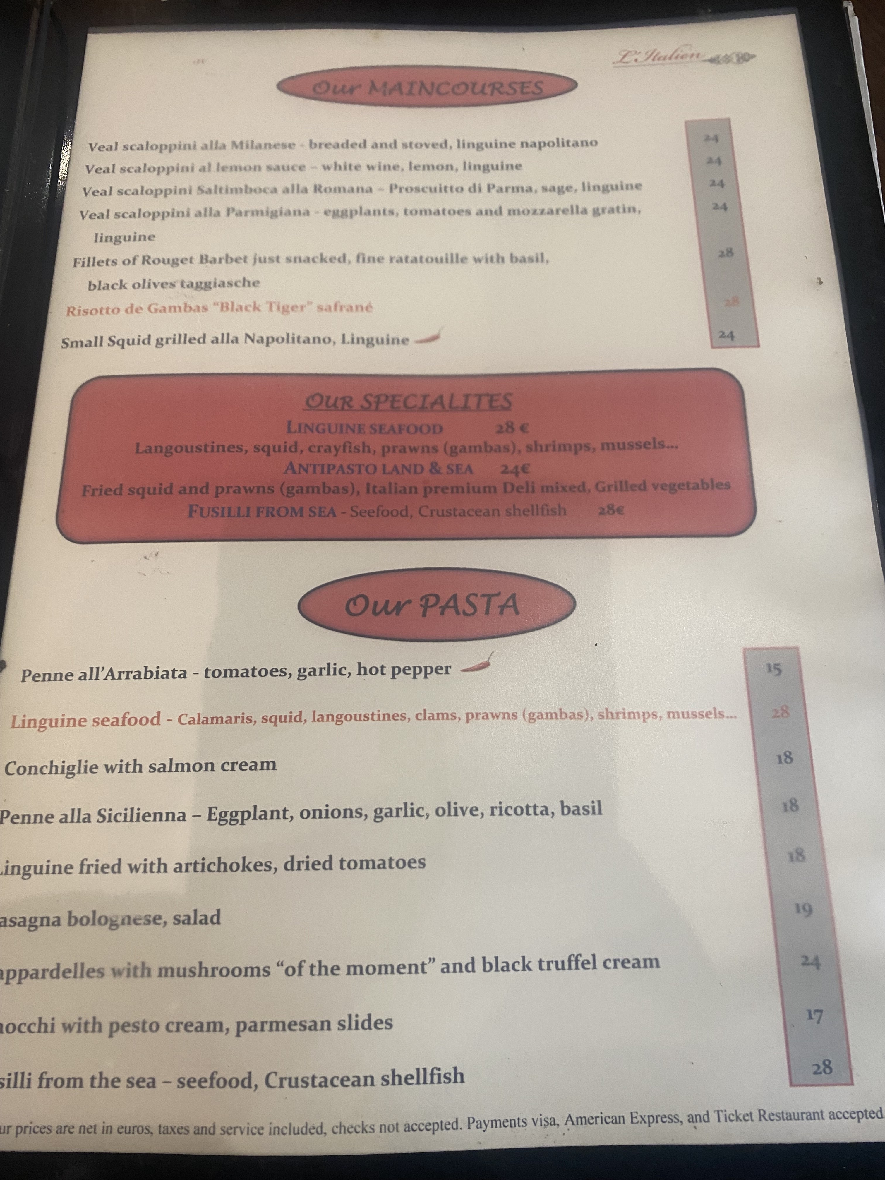 Nous sommes canadiens pour une semaine à Paris. Nous avons soupé (dîner comme disent les français) . Je dois avouer que c'etait savoureux! Mais ce soir, la note baisse à plein : Mon conjoint est allé ce soir, pour commander un plat pour emporter un plat de fettuccinis Alfredo. Sur le menu était inscrit 9 €uros. Le proprio a dit à mon conjoint: Ah! Non, le prix n'est plus bon! C'est maintenant 29 €uros! Ooooh! Quelle audace! Nous sommes touristes pour 1 semaine à Paris ! Soyez avertis les touristes!!!!! Bien entendu, il est reparti en lui disant qu'il n'accepte pas de commander ce plat avec un prix très malhonnête.