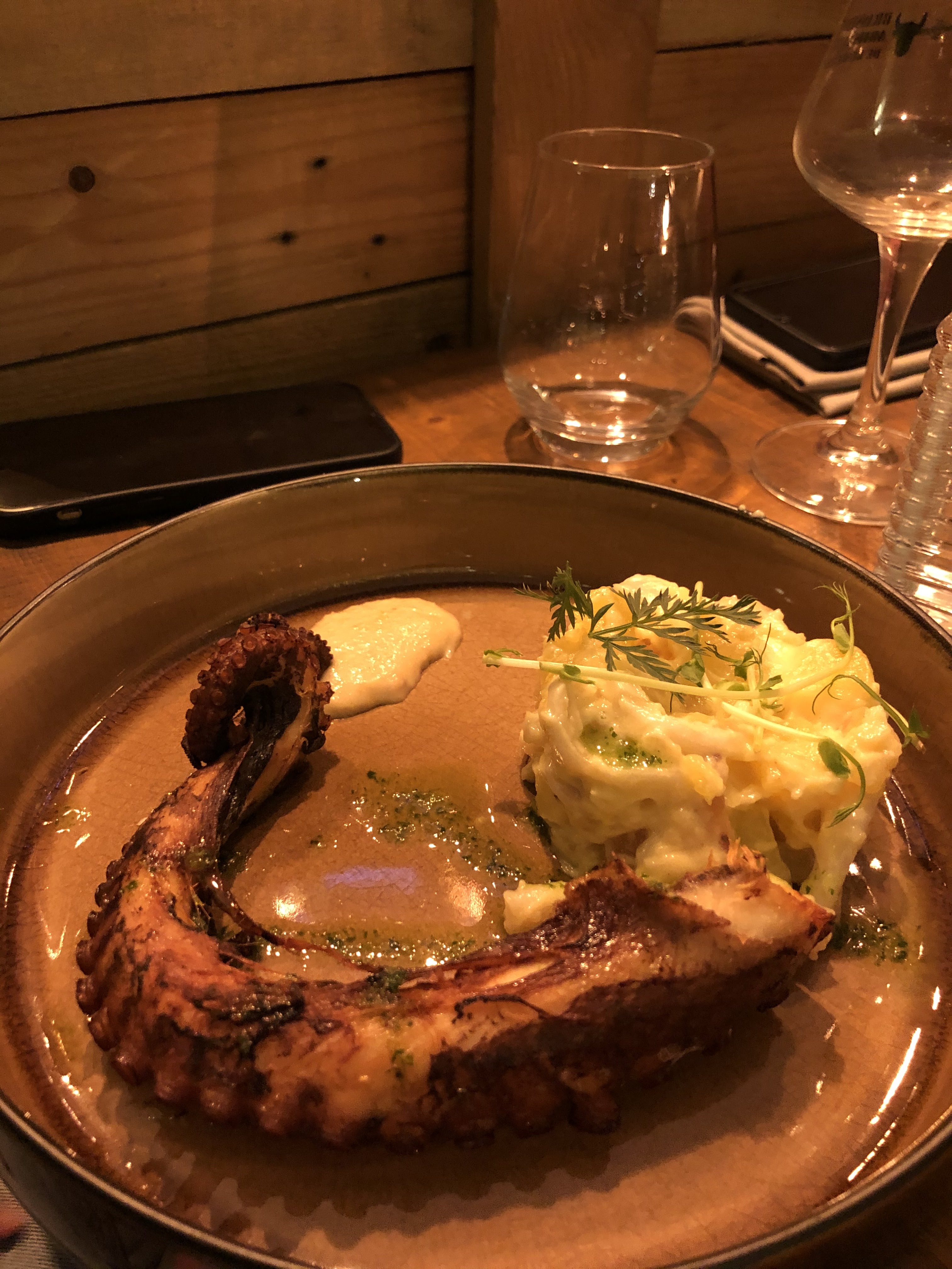 Je recommande !! Une belle découverte, bon accueil, service agréable souriant et rapide avec un beau cadre. Niveau choix de vin nous avions eu de bon conseil par le serveur, également pour la carte des plats. Nous avions pris le plat du jour : Cochon de lait farci et rôti qui était juste incroyable et tellement fondant, le meilleur cochon de lait que j'ai mangé. Et l'autre plat était la saucisse de la ferme de Galician. Et hors photo on a fini sur des tiramisu eu aussi bien bon et savoureux.