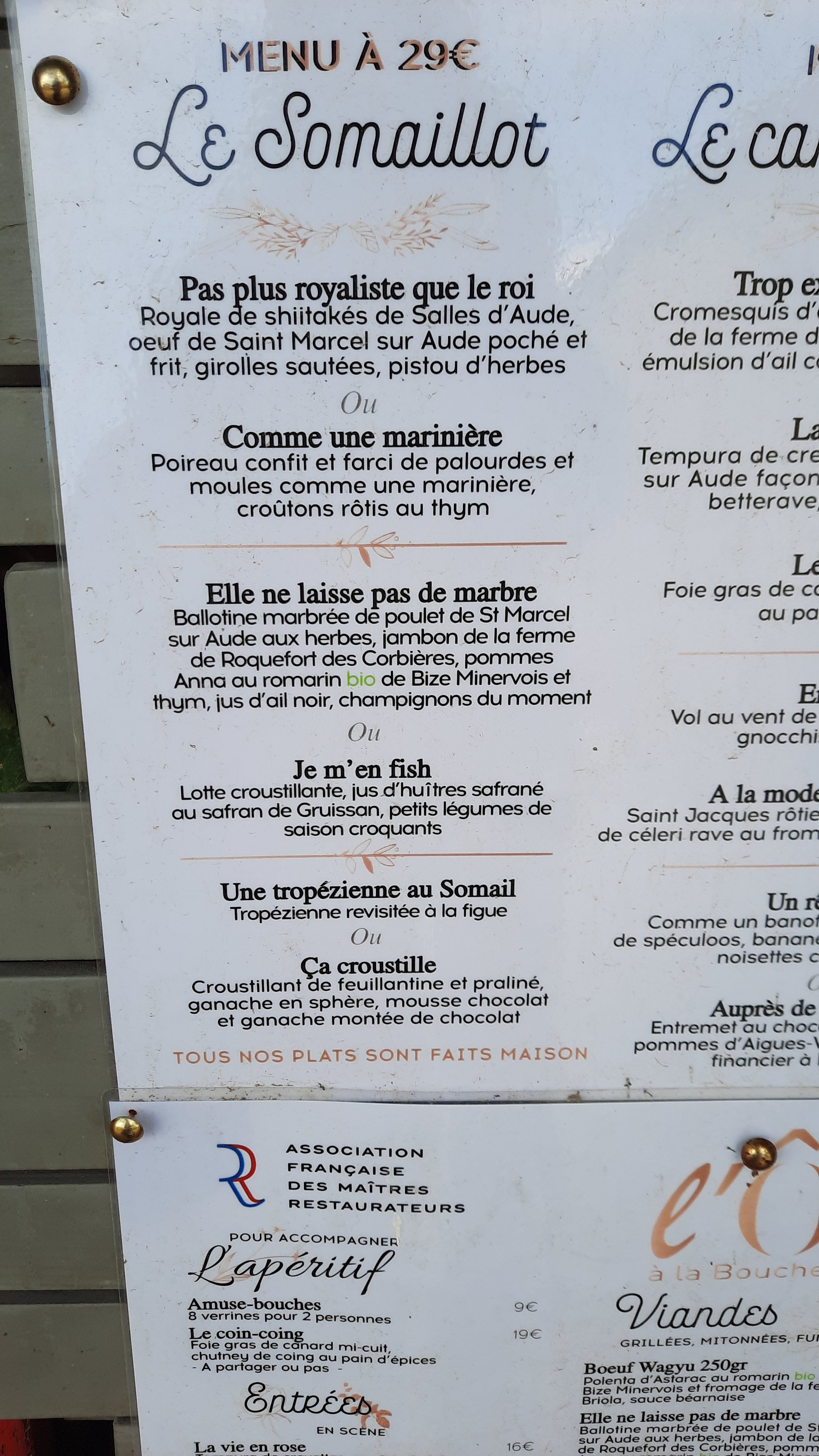 Nous étions de passage au Somail et nous sommes dirigées vers ce restaurant à côté de notre chambre d'hôte. Les plats étaient excellents, la salle est très belle, et le service au top! J'ai oublié de me lever pour la promenade des chiens le lendemain à 7h , je m'en excuse ;) Je reviendrai avec grand plaisir!