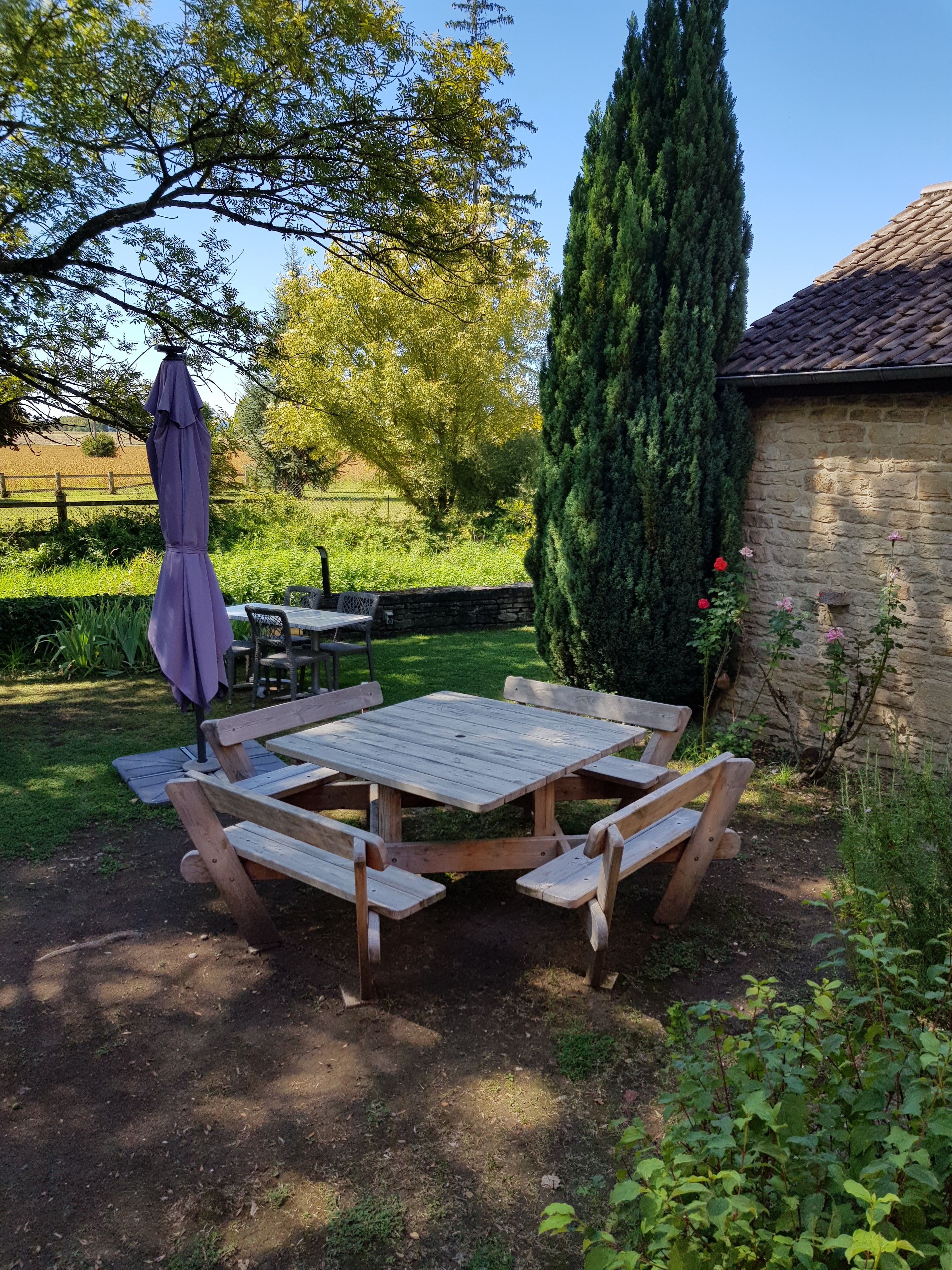Très joli cadre, au bord d'un ruisseau, avec des tables de jardin disséminés. ...un peu comme à la maison Personnel charmant et bon rapport qualité prix.