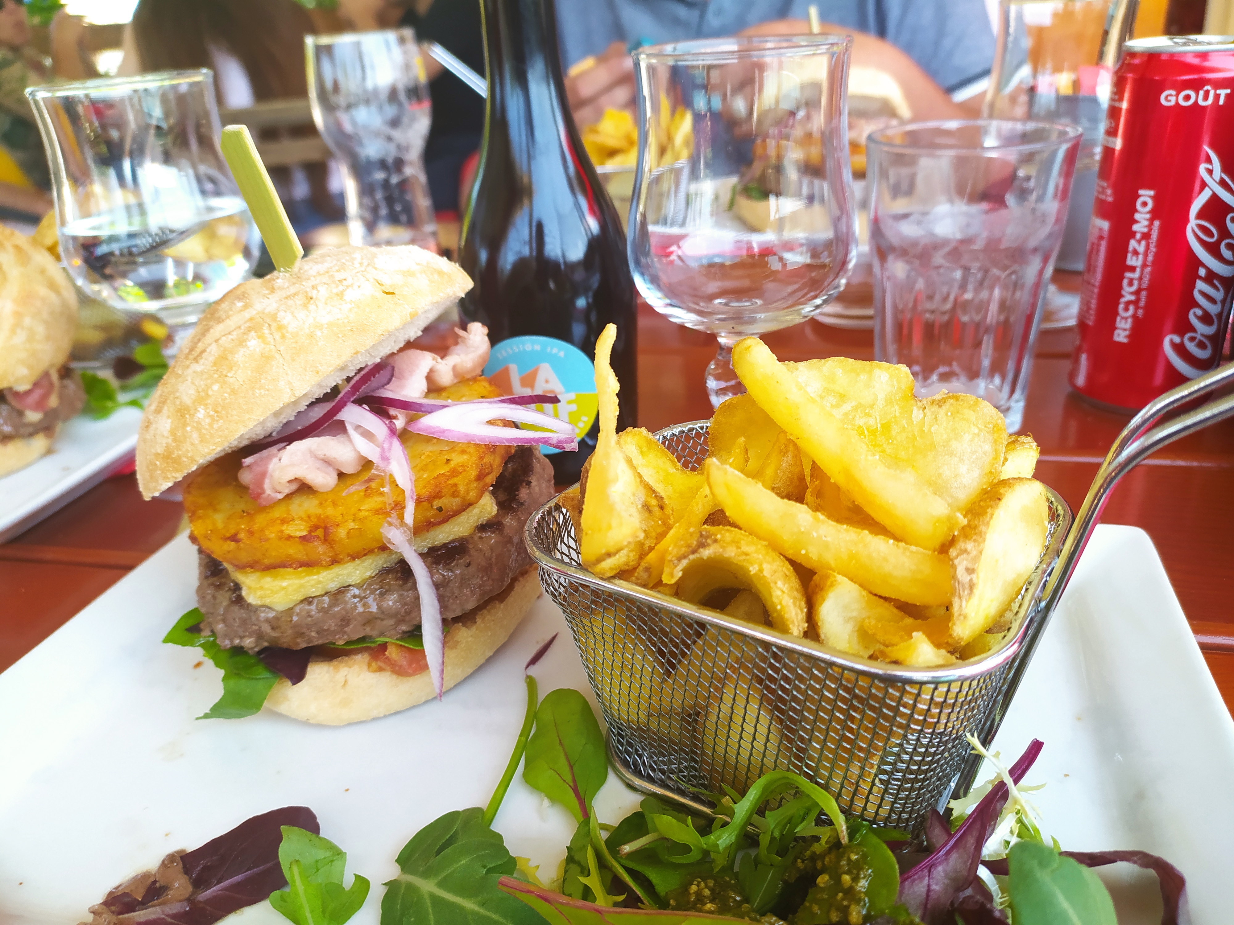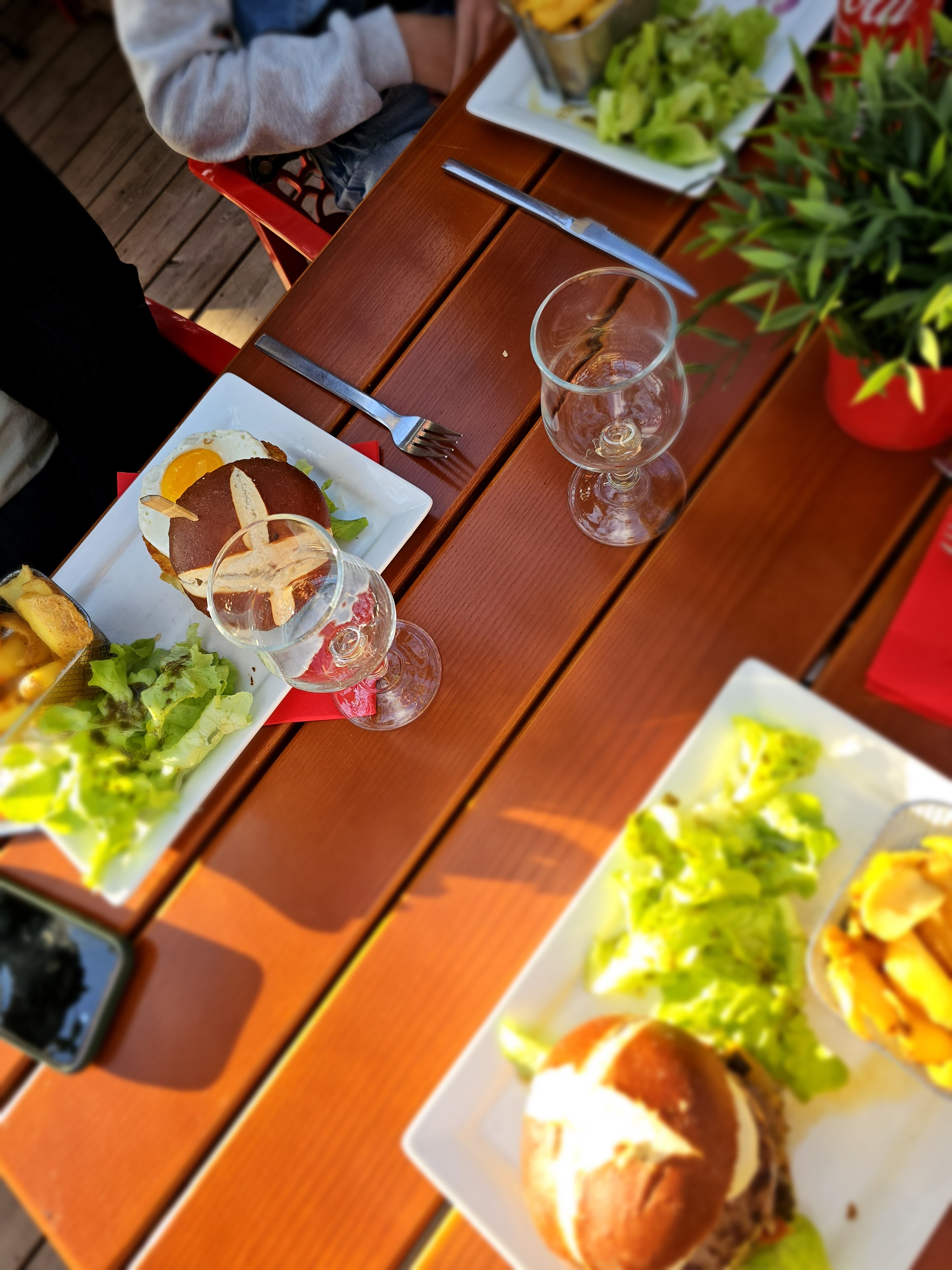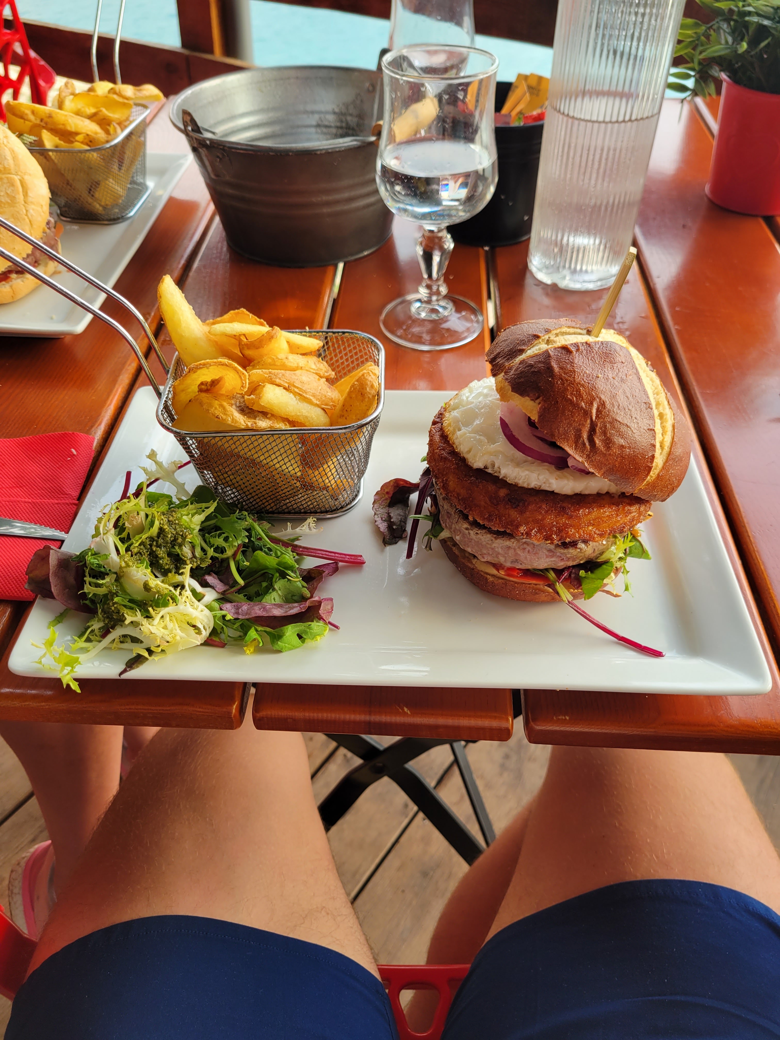 Le soir, servie en terrasse avec une vue magnifique sur le coucher de soleil donnant sur le lac. Les burgers pour balaises, un régal!!
