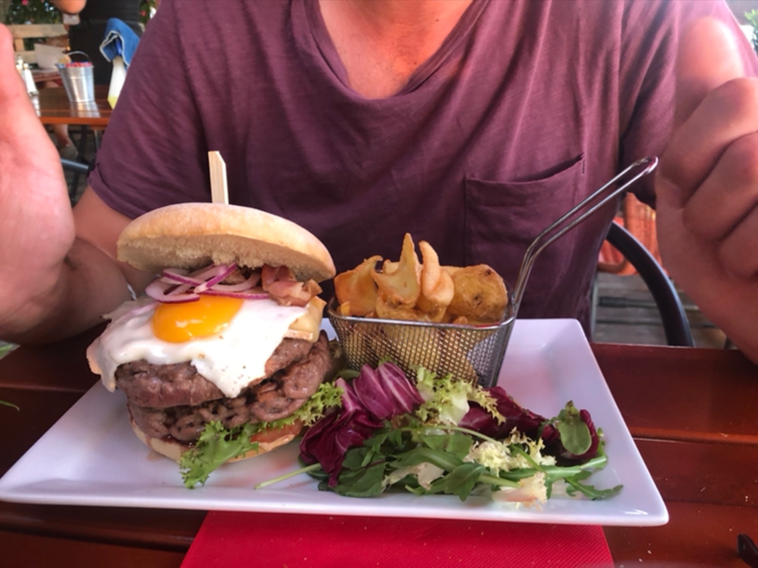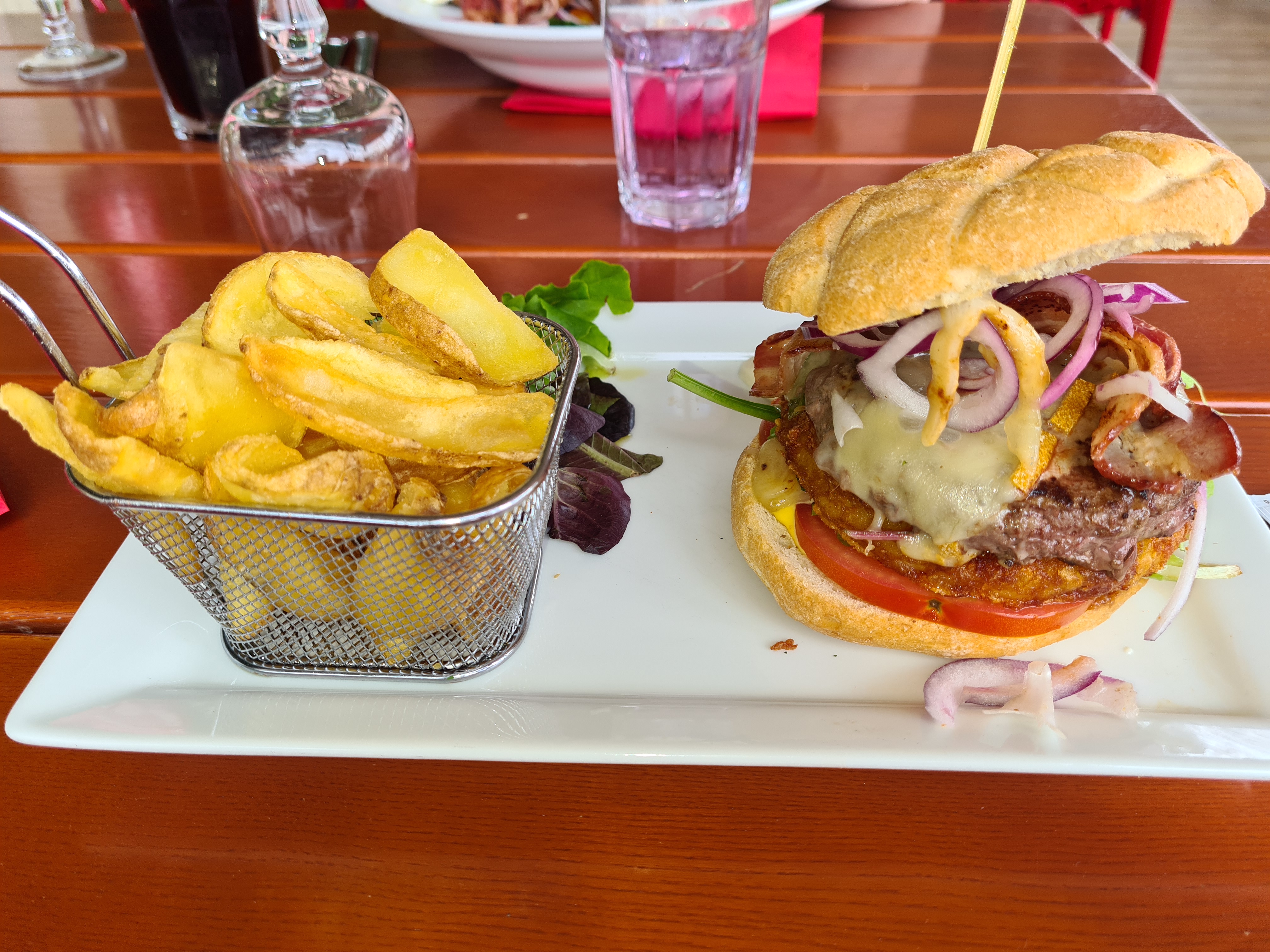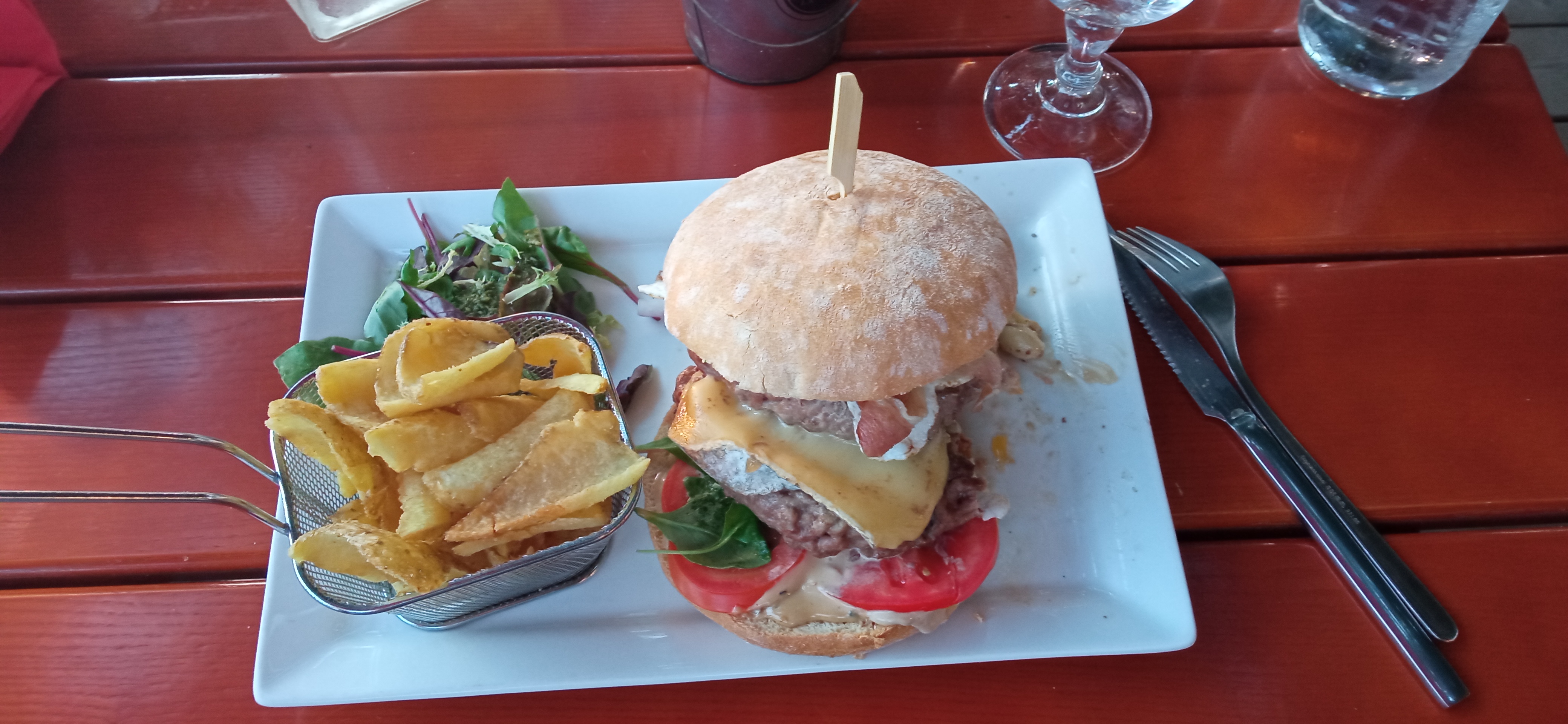 Le soir, servie en terrasse avec une vue magnifique sur le coucher de soleil donnant sur le lac. Les burgers pour balaises, un régal!!