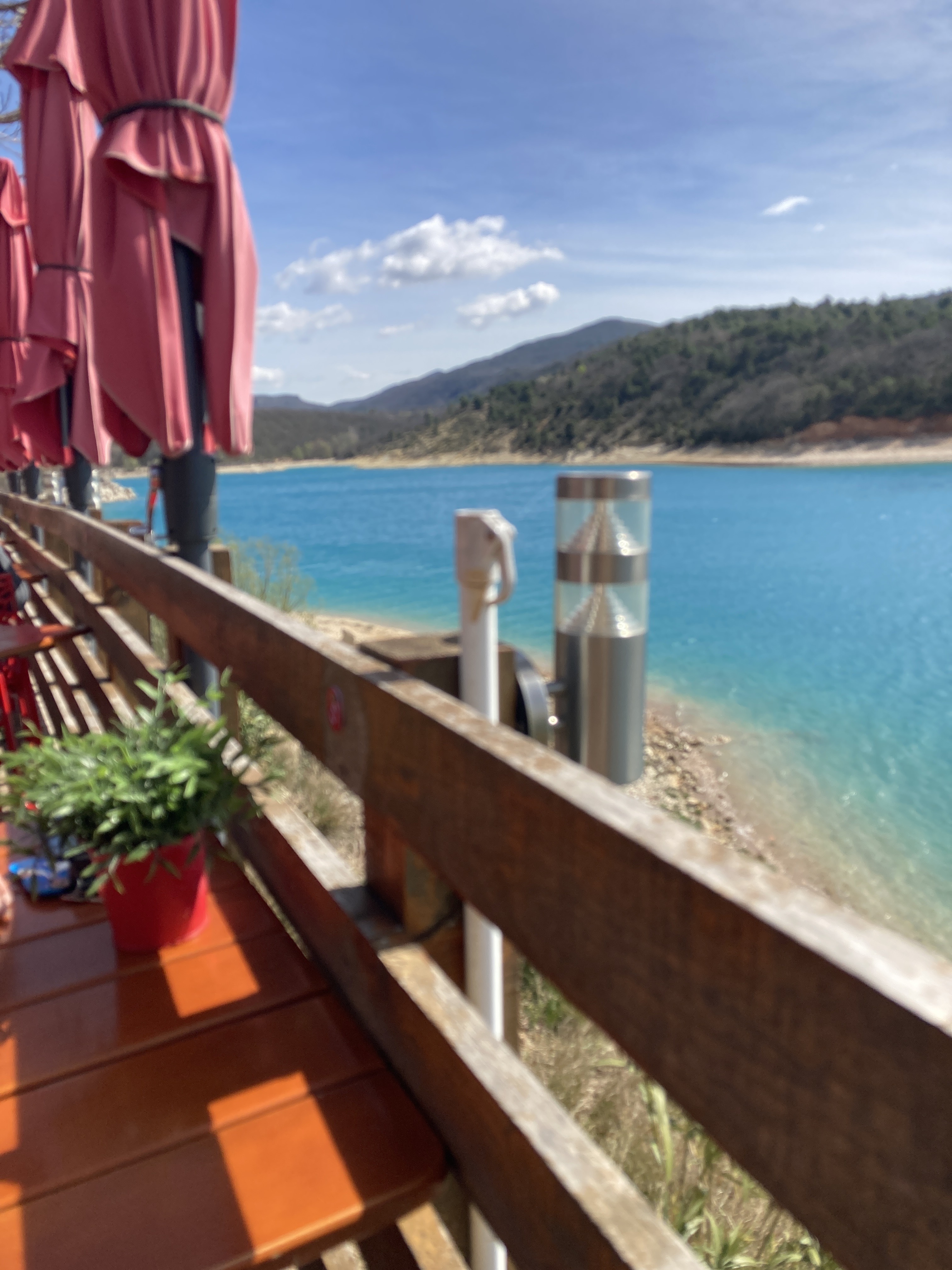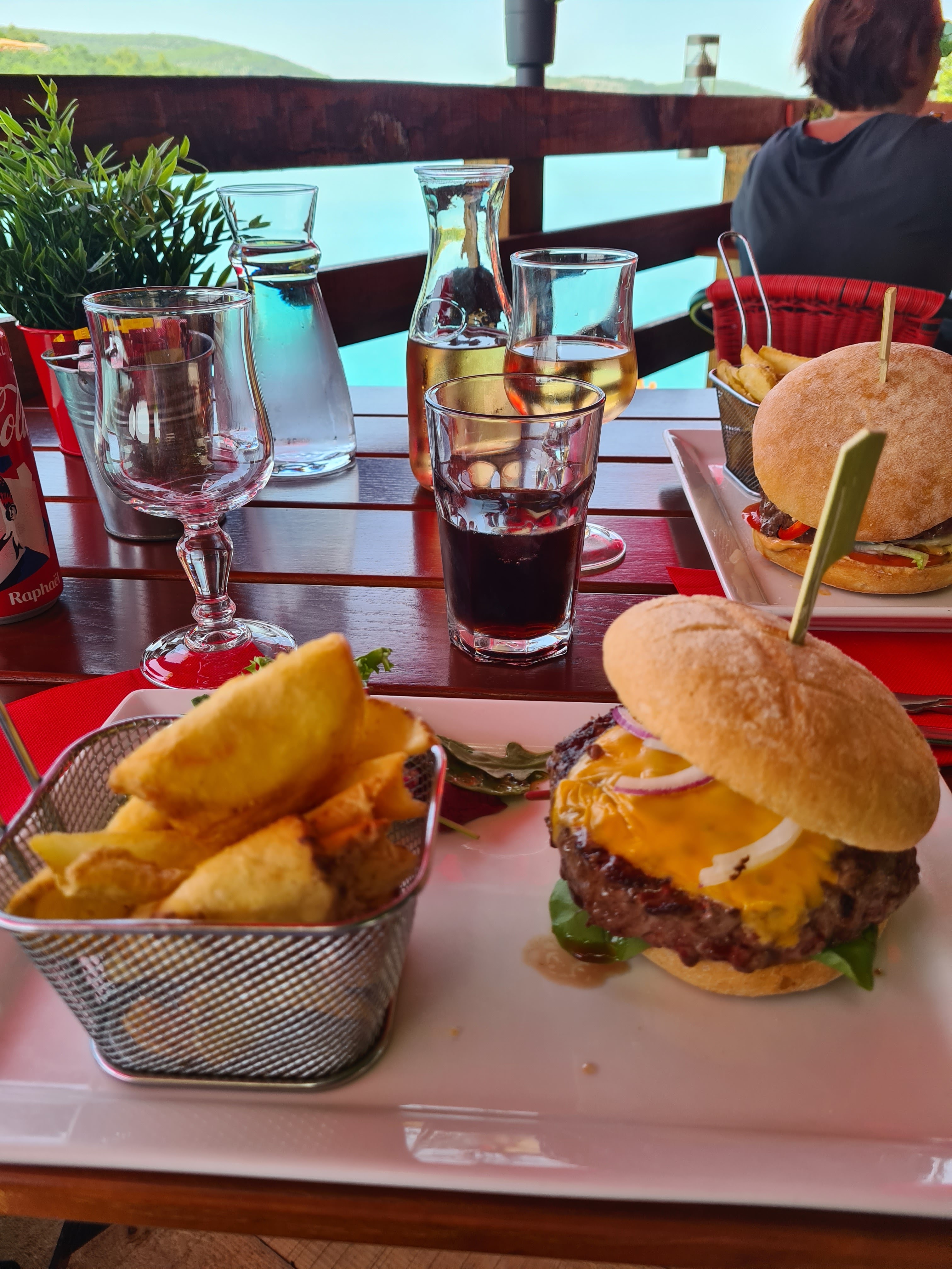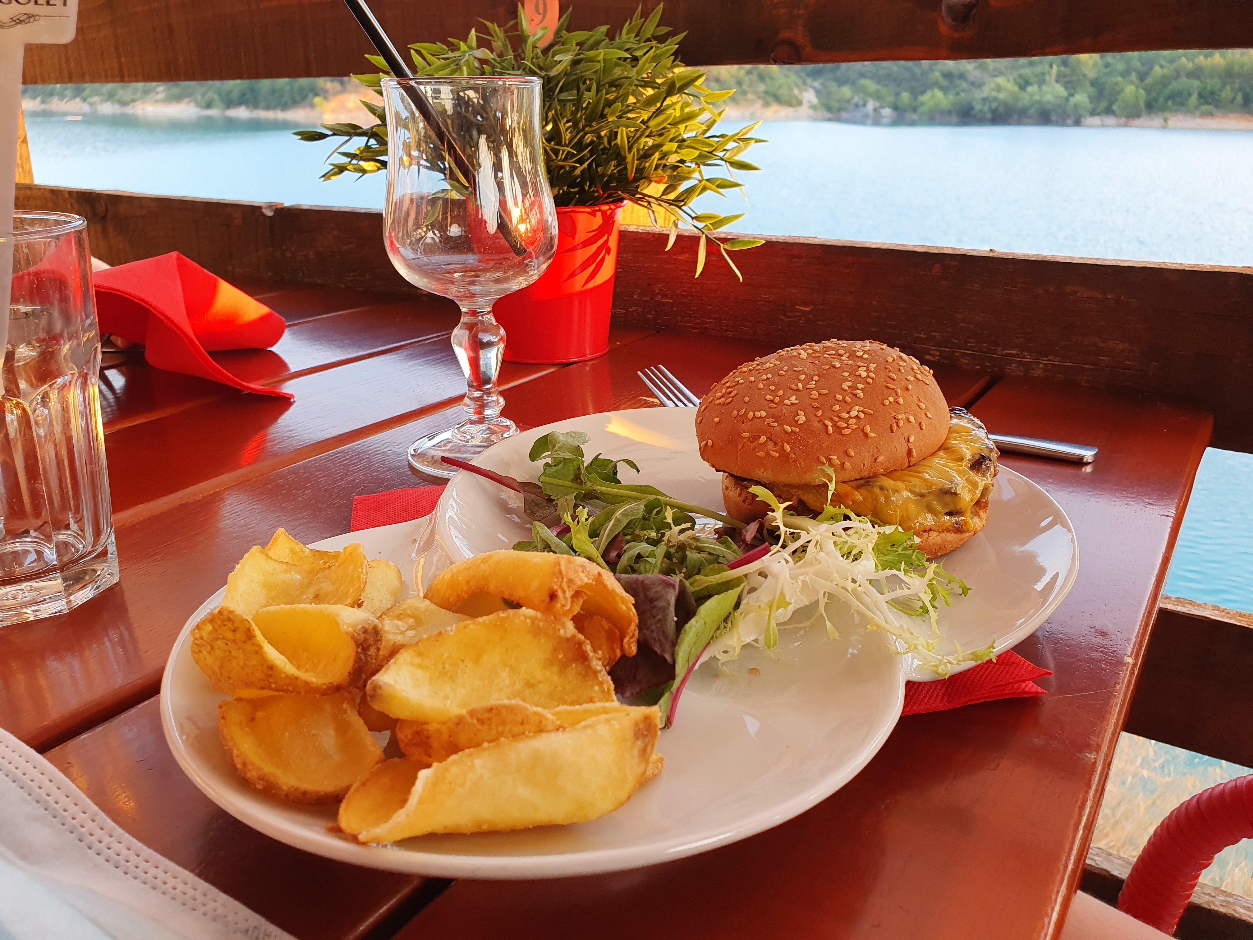 Très joli emplacement avec belle vue sur le lac. Le service pas au rdv beaucoup trop d'attente 45min pour avoir seulement l'apéro que finalement nous n'avons pas pris puisque la faim était bien installé. Nous avons pu constaté des personnes arrivées après nous être servis avant je précise que j'avais réservé. Pour ce qui est du repas l'hamburger à l'agneau de mon ami était très bon mais mon pour mon plat l'andouillette 5 A pas cuite et froide quel dommage, mes frites étaient hyper grillés et minuscules aux vues des photos j'imagine que j'ai eu un fond de plat pas de chance. Moi qui suis habituée à manger sur Bauduen je reste plutôt mitigée sur cet établissement.