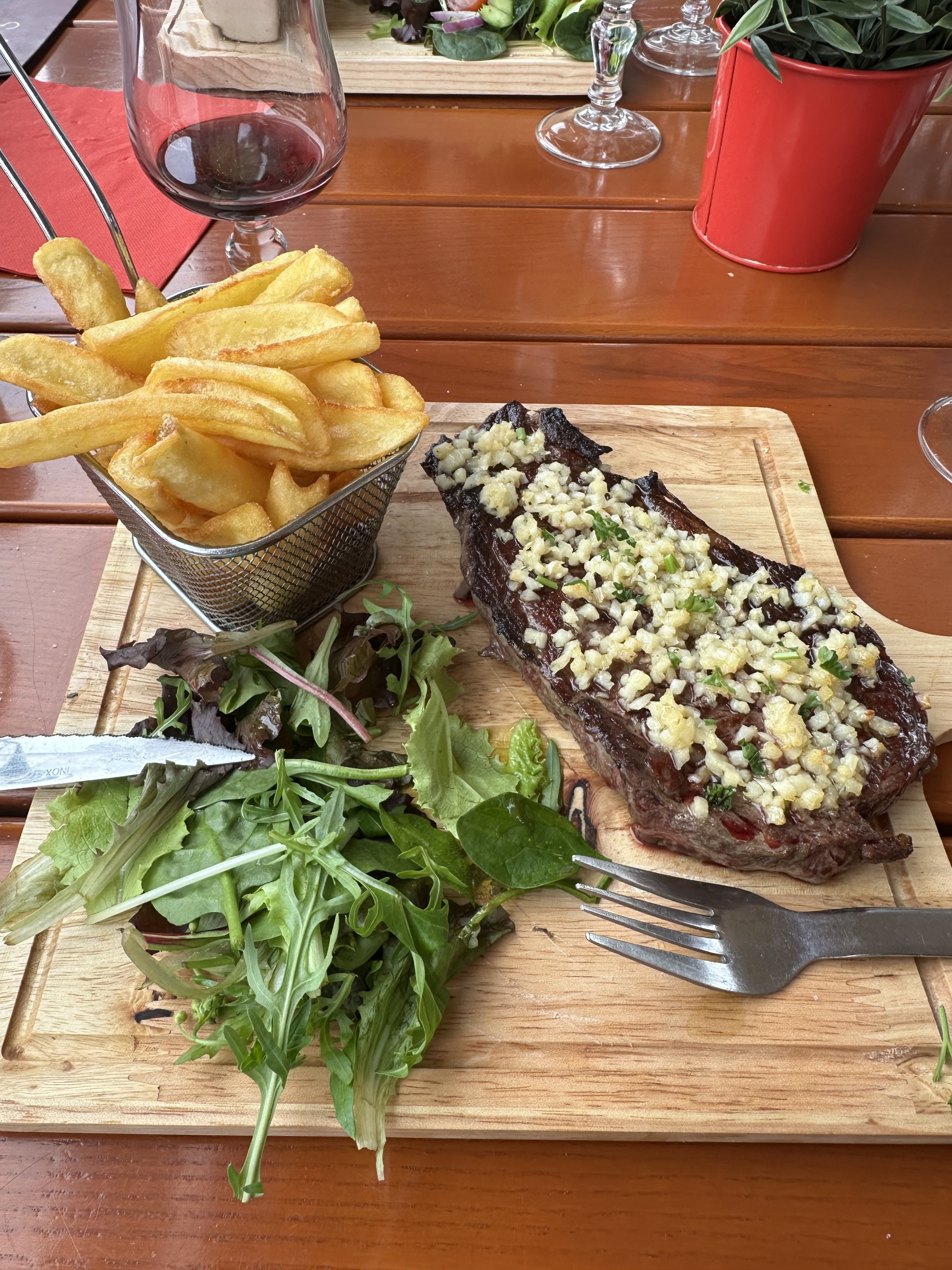 Soirée cata!! Suite à une sérieuse invasion de guêpes à notre table nous avons été obligés de boire nos apéro en express et de prendre notre repas à emporter. Nous avons mangé froid et sans couverts ni serviettes! Pratique pour le Tartare !! ...les frites surgelées ont eu du mal à passer !!! La viande du tartare était nerveuse. Gérante ni compréhensive ni aimable, la moindre des choses aurait été de nous offrir les boissons...