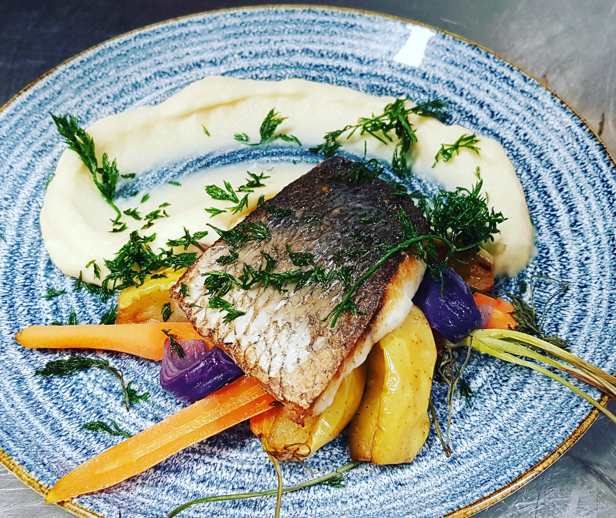 Filet de julienne, mousseline de céleri raves chips de panais et velouté de cresson. Charlotte d épaule d agneau confite caviar d aubergine et coulis de poivrons rouge. Dos de maigre grillé sur peau légume de saison et mousseline de panais.