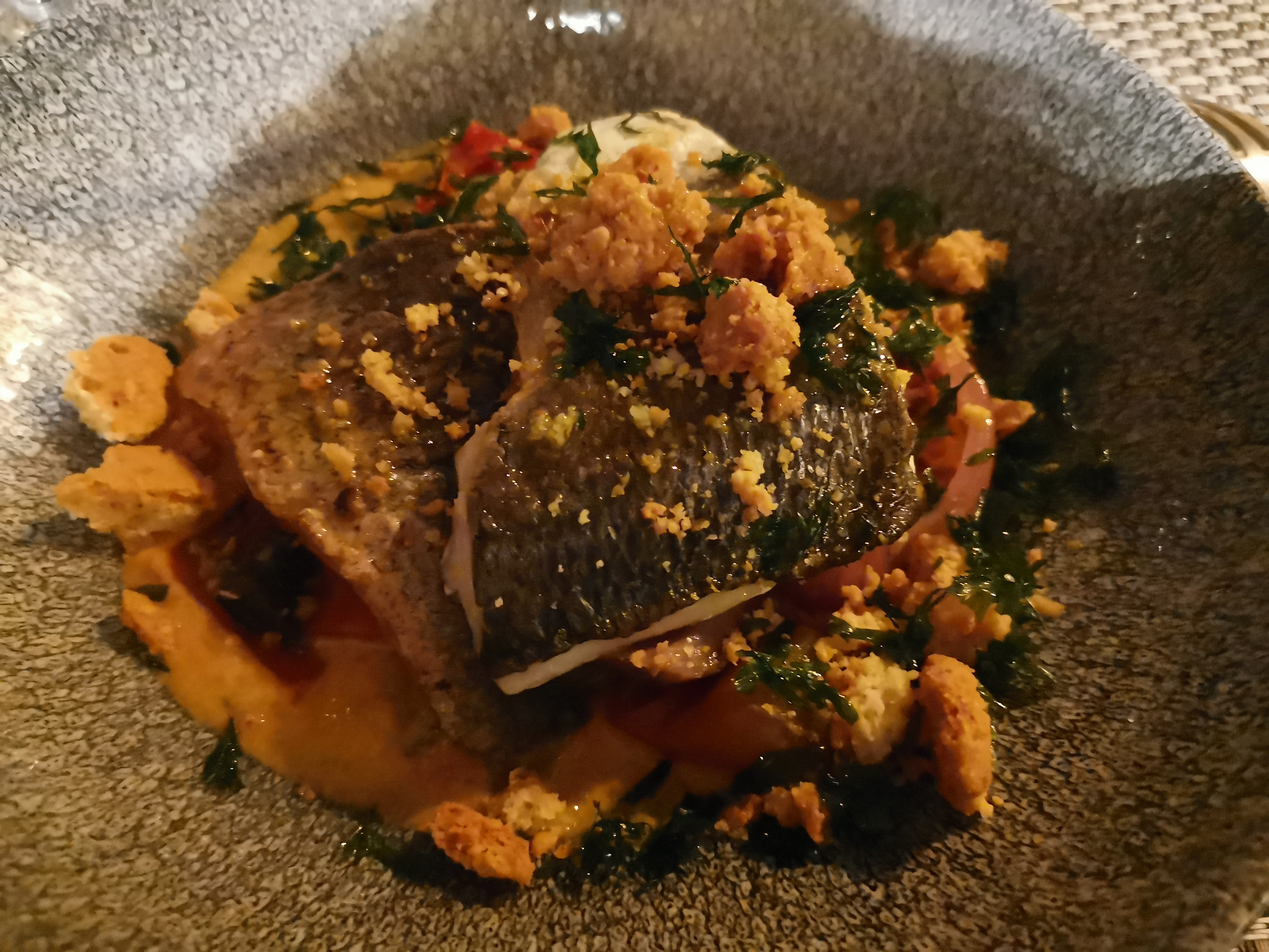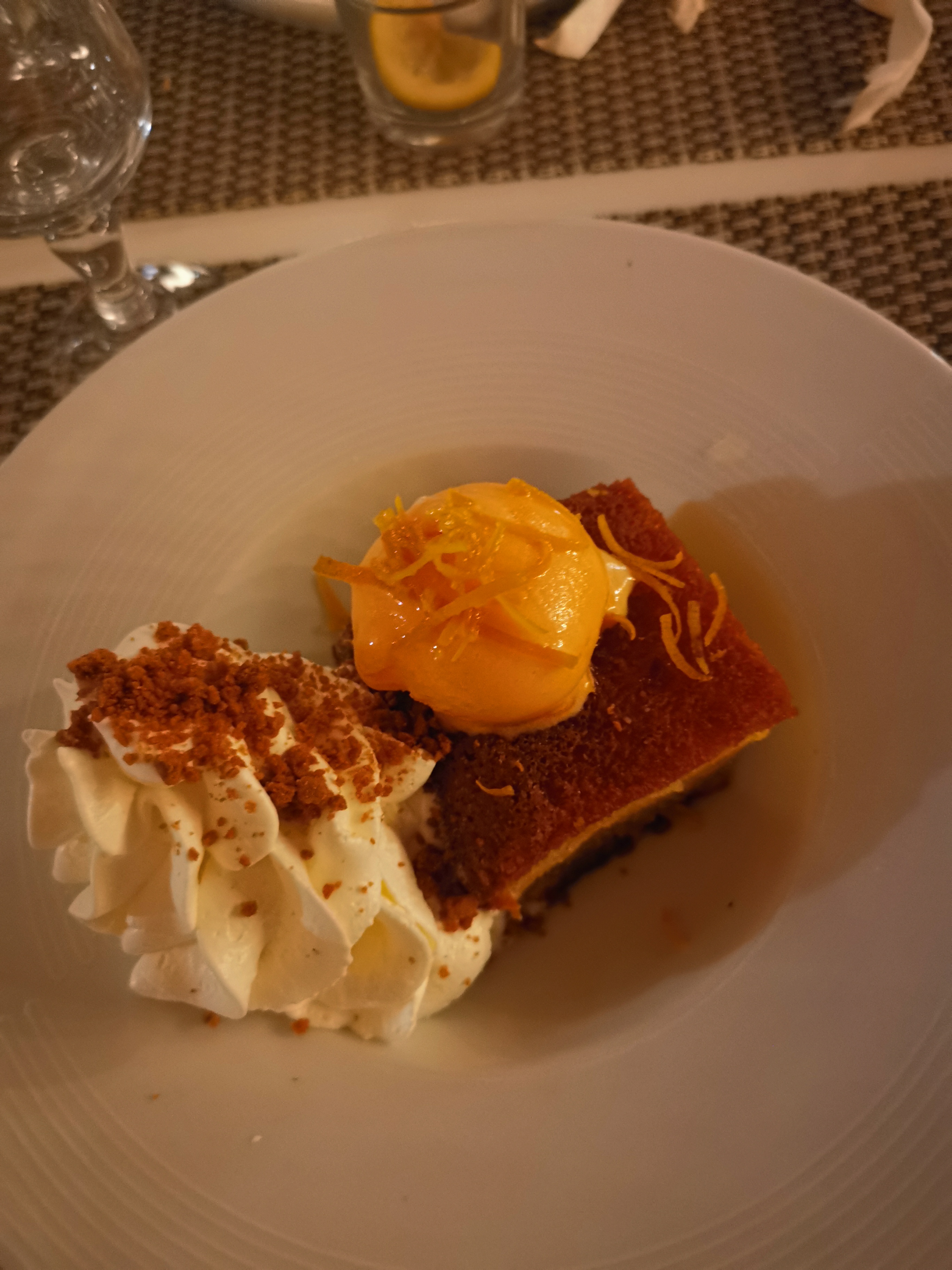 Dîner sur la terrasse couverte, avec vue sur la mer. Cabillaud avec gaspacho, délicieux, parfumé et très healthy. Puis le gâteau à l’orange, parfait, et les pêches verveine rafraîchissantes. L’équipe aux petits soins, un cadre qui vous transporte ailleurs, et un peu de musique : un excellent moment. Pas étonnant que ce resto marche aussi bien en hiver. Les prix sont corrects pour la qualité.