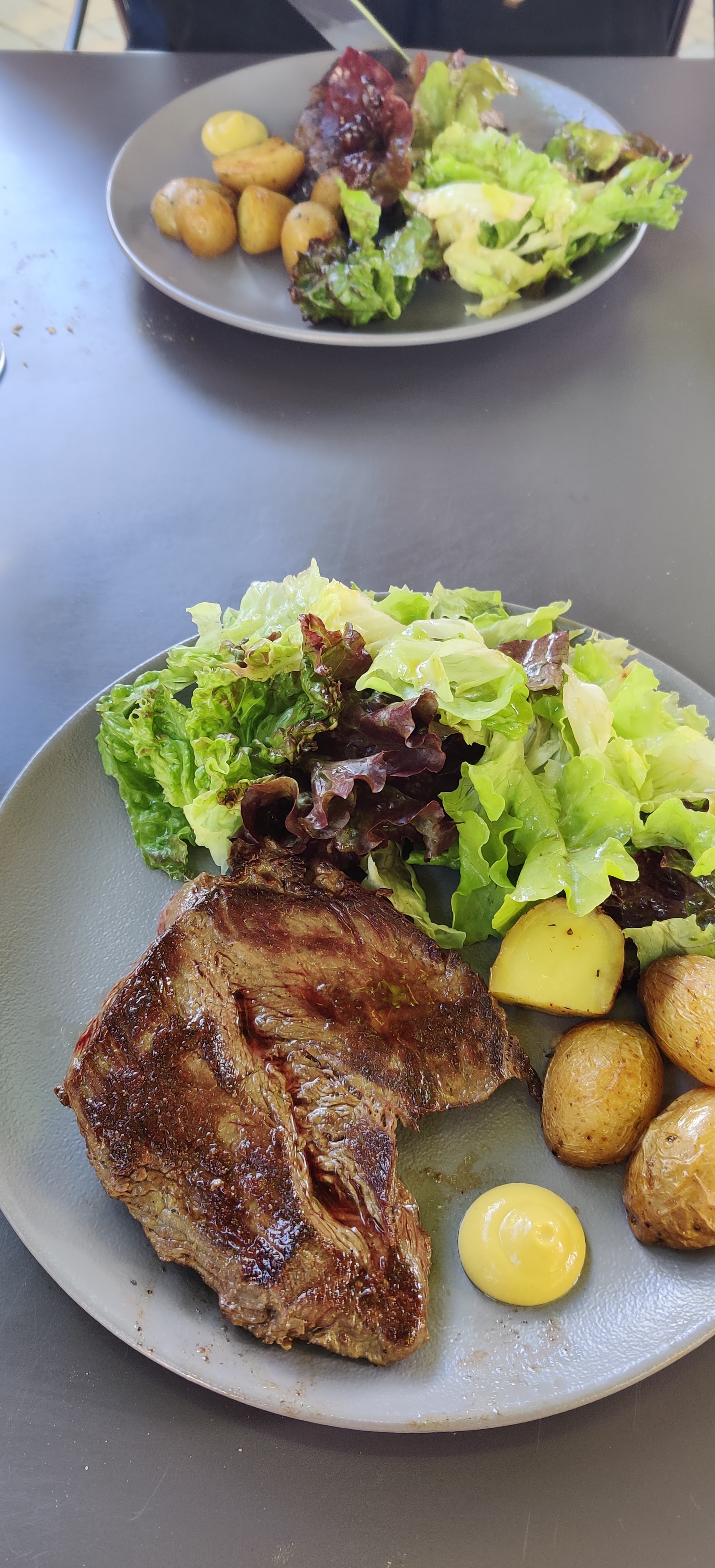Au déjeuner, plat du jour roti à la broche Picana de veau ce jour avec petites pommes de terre,salade et dessert. Vin proposé au verre, endroit sympa pour un repas en toute simplicité et très goûteux.