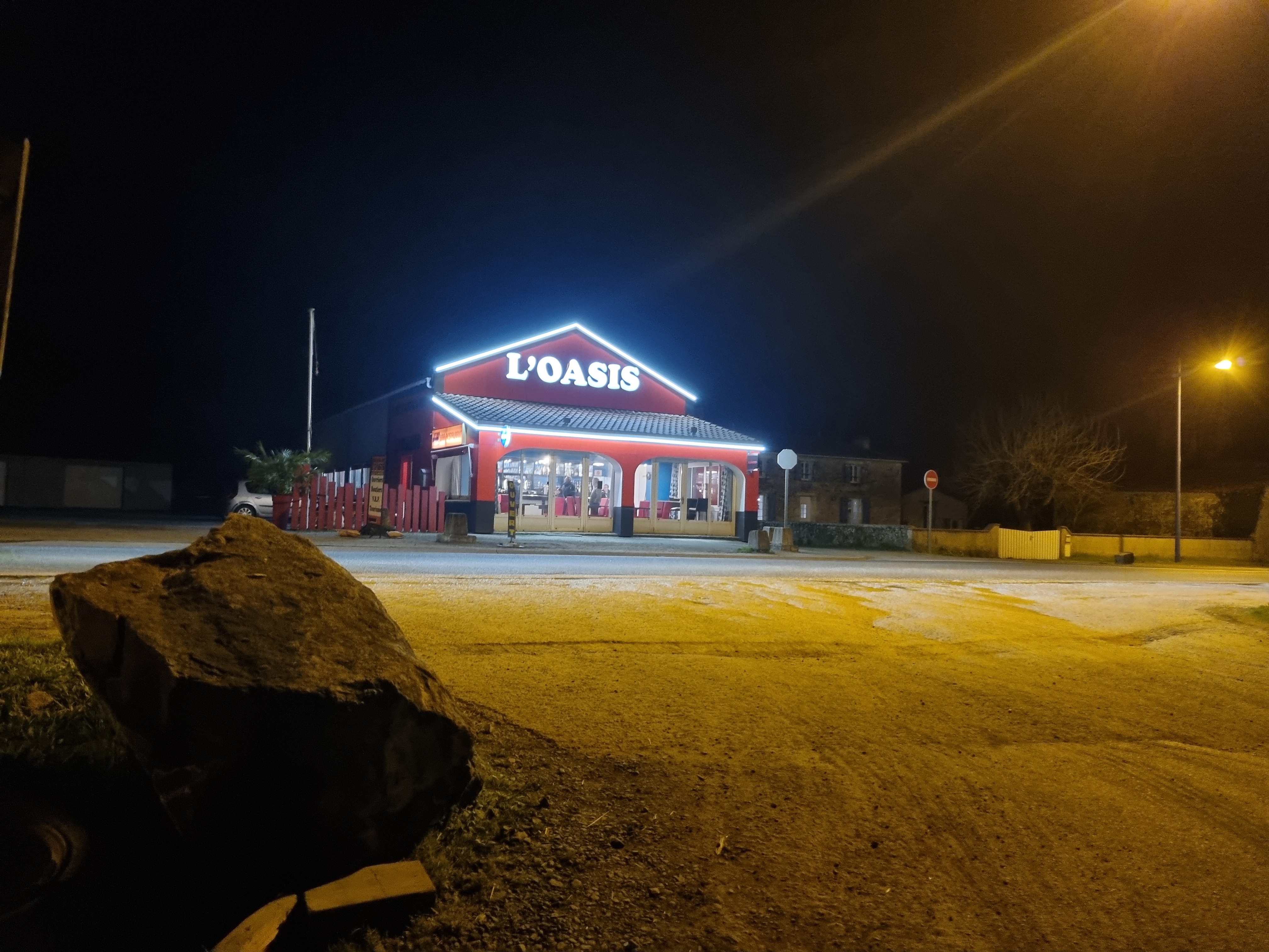 L Oasis a changé de propriétaire depuis cet été. Comme vous pouvez le voir sur la photo le resto a pris un coup de jeune. L intérieur a aussi été repeint et le mobilier a été changé. Il y a maintenant un buffet d entrées. Le repas est à 13 € 30 avec un 1/4 de vin +1 € pour le café. Il y a toujours les 2 grands parkings mais sans les trous ! C est ouvert le soir.