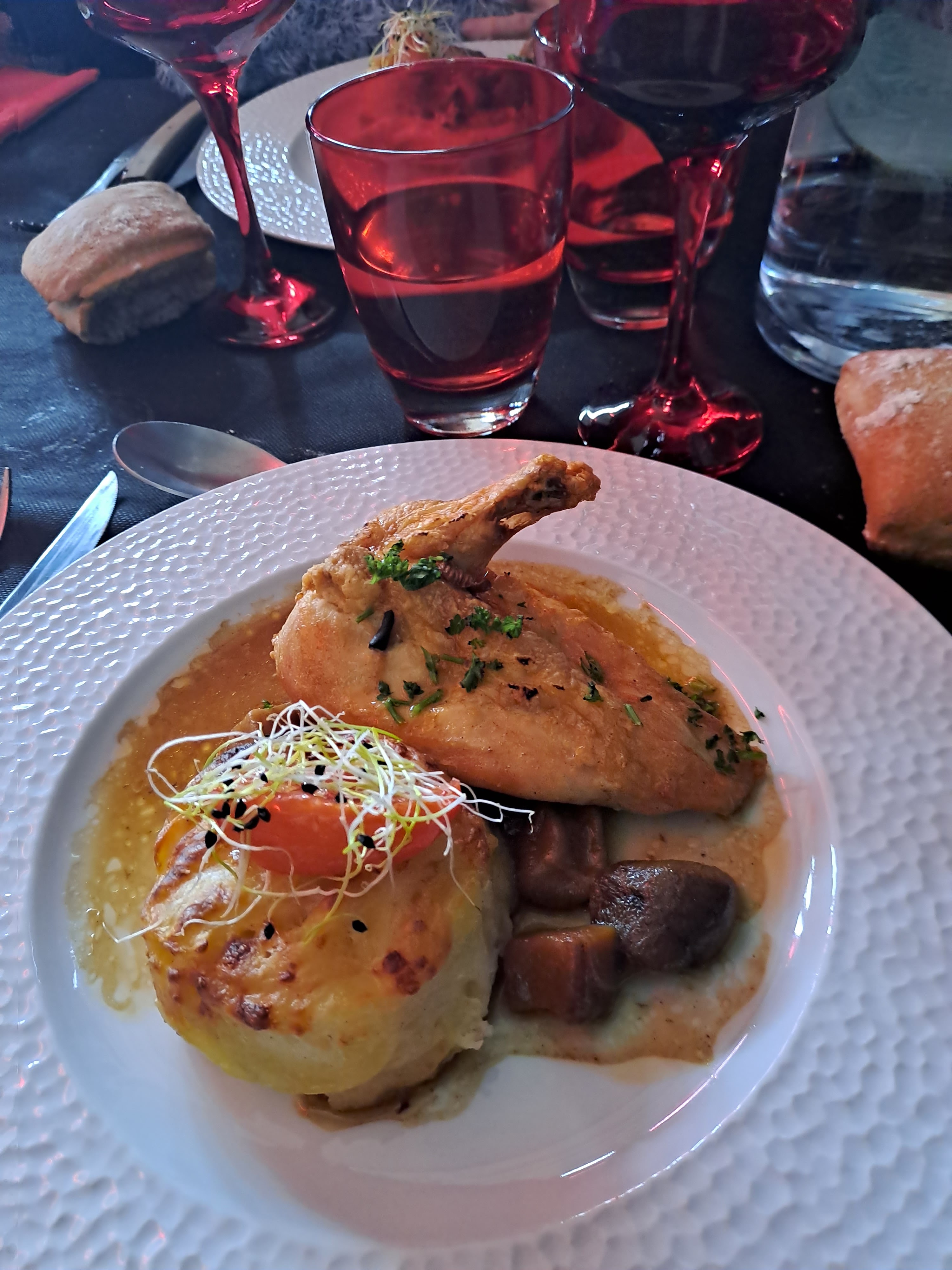 Joli lieu et assiettes non seulement bien présentées, bien remplies et plats bien cuisinés. Un bémol sur les grenouilles ce soir là.