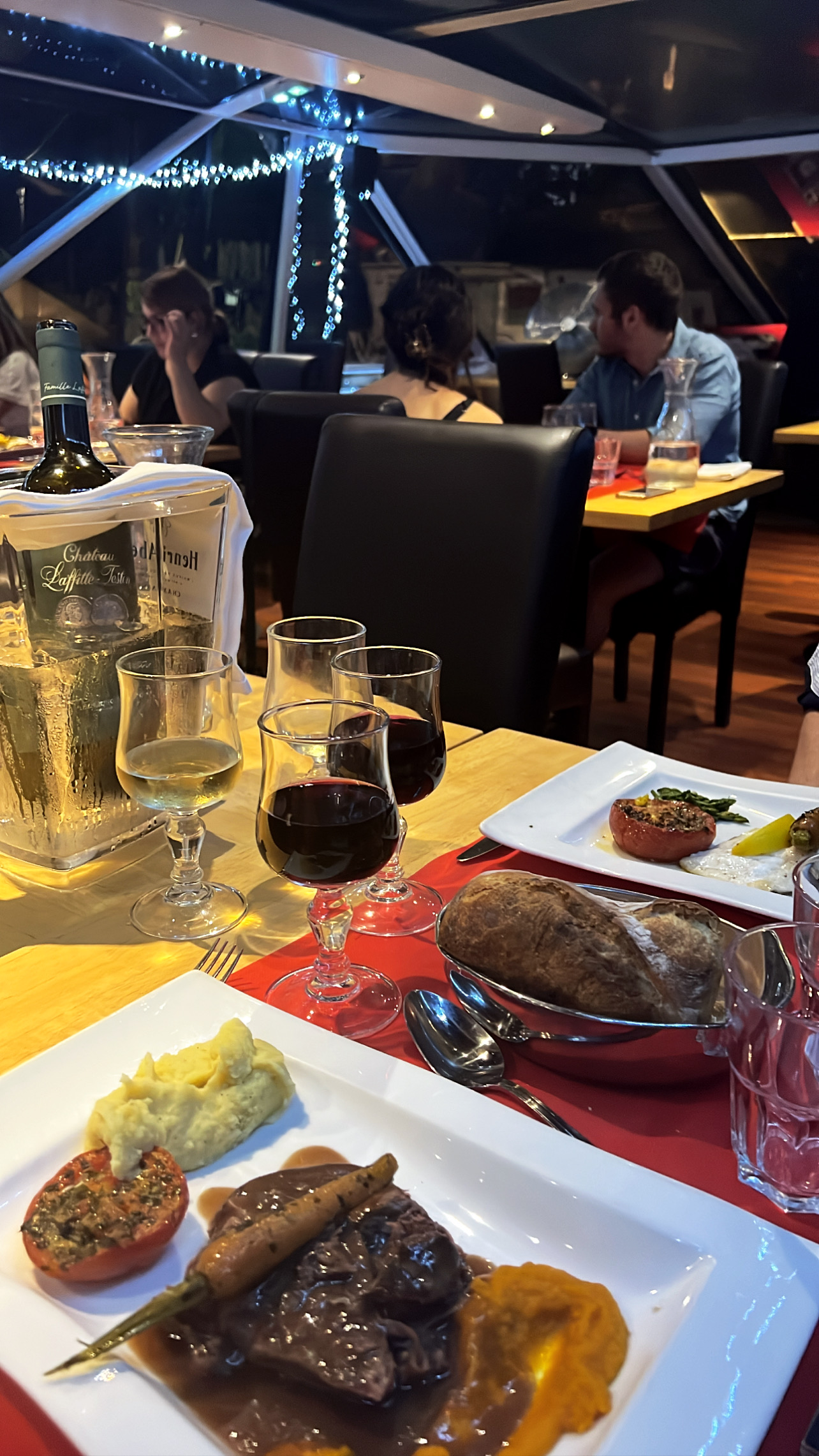 soirée très agréable avec un repas de bonne qualité. Seul regret: un peu froid quand le pilote ouvre les fenêtres pour voir la navigation en marche arrière