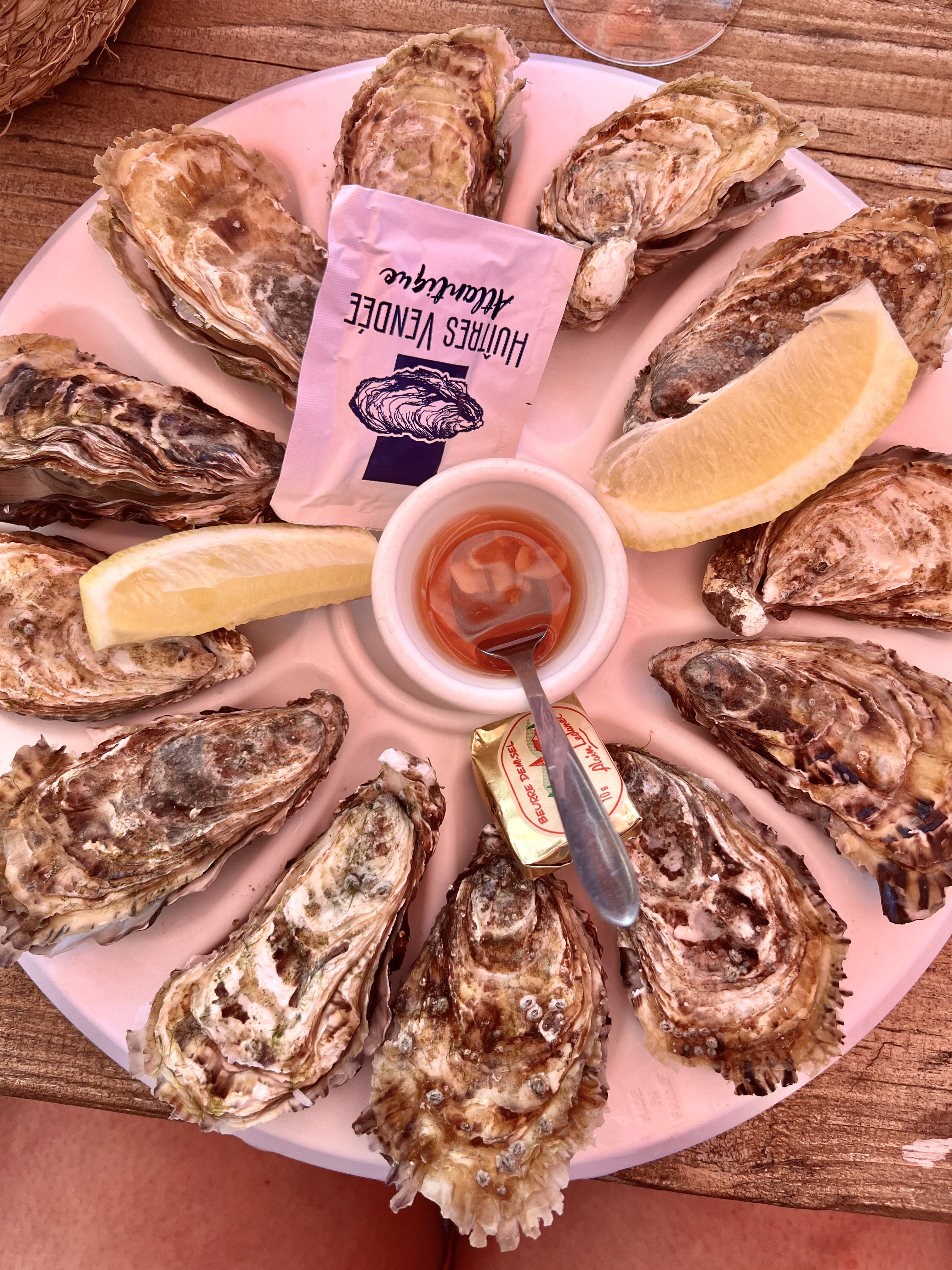 Je vous conseille d'arriver largement avant 20h30 car c'est l'heure de fin de service en pleine saison.... De plus, le monsieur nous précise qu'il n'y a pas de lumière sous la terrasse abritée. Donc nous n'avons pu déguster que les huitres N°3 ( les seules proposées) et les frites (pour la pomme de terre de Noirmoutier il faudra repasser... origine surgelées). Les huitres étaient présentées à température ambiante, avec un petit beurre demi-sel, du pain tranché et une sauce au vinaigre d'échalote (ou est l'échalote ???). Nous sommes déçus de notre passage à l'Océane. Sommes nous arrivés au mauvais moment ?