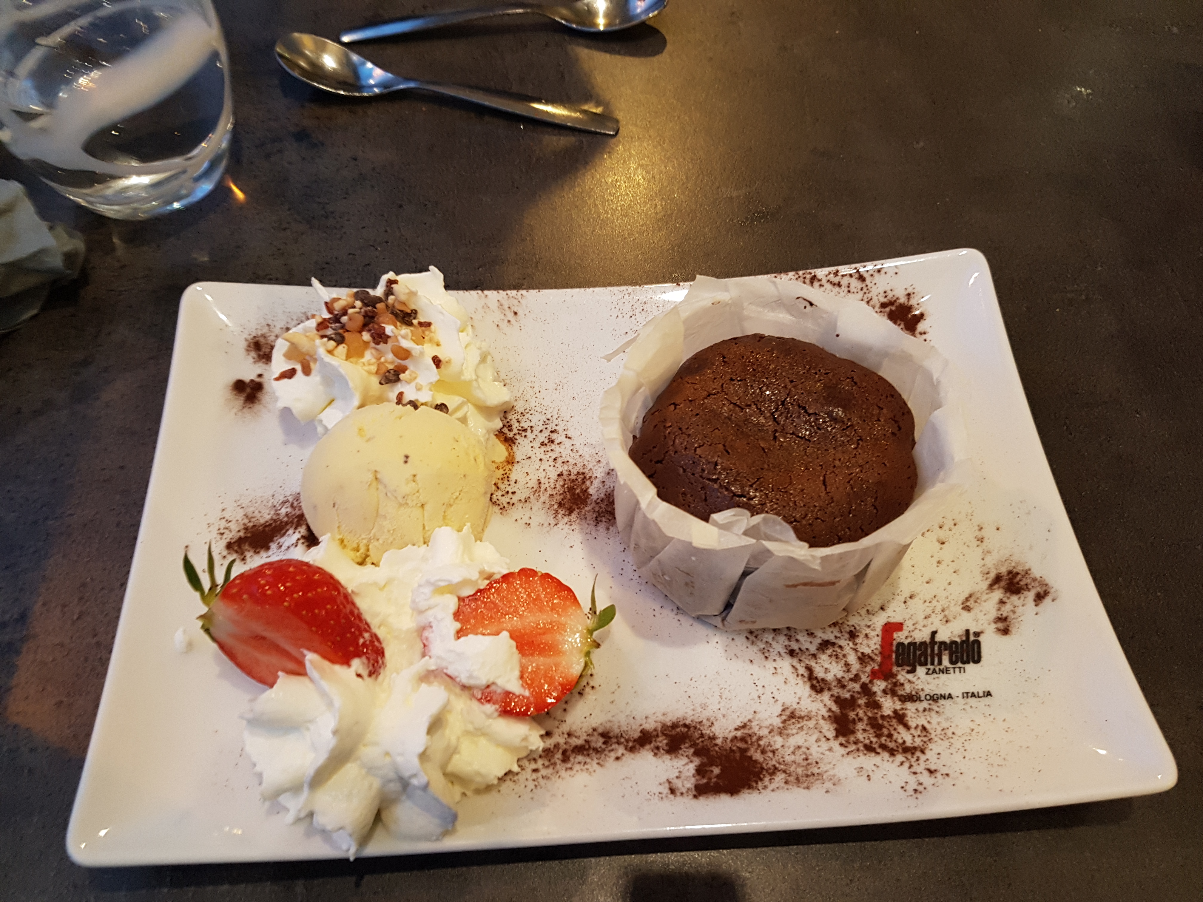 Le plat était plutôt bon par contre les frites bof. Pour le dessert il y a sur la carte moelleux et fondant au chocolat mais en réalité les deux sont des fondants. Un peu cher pour ce que c'est.