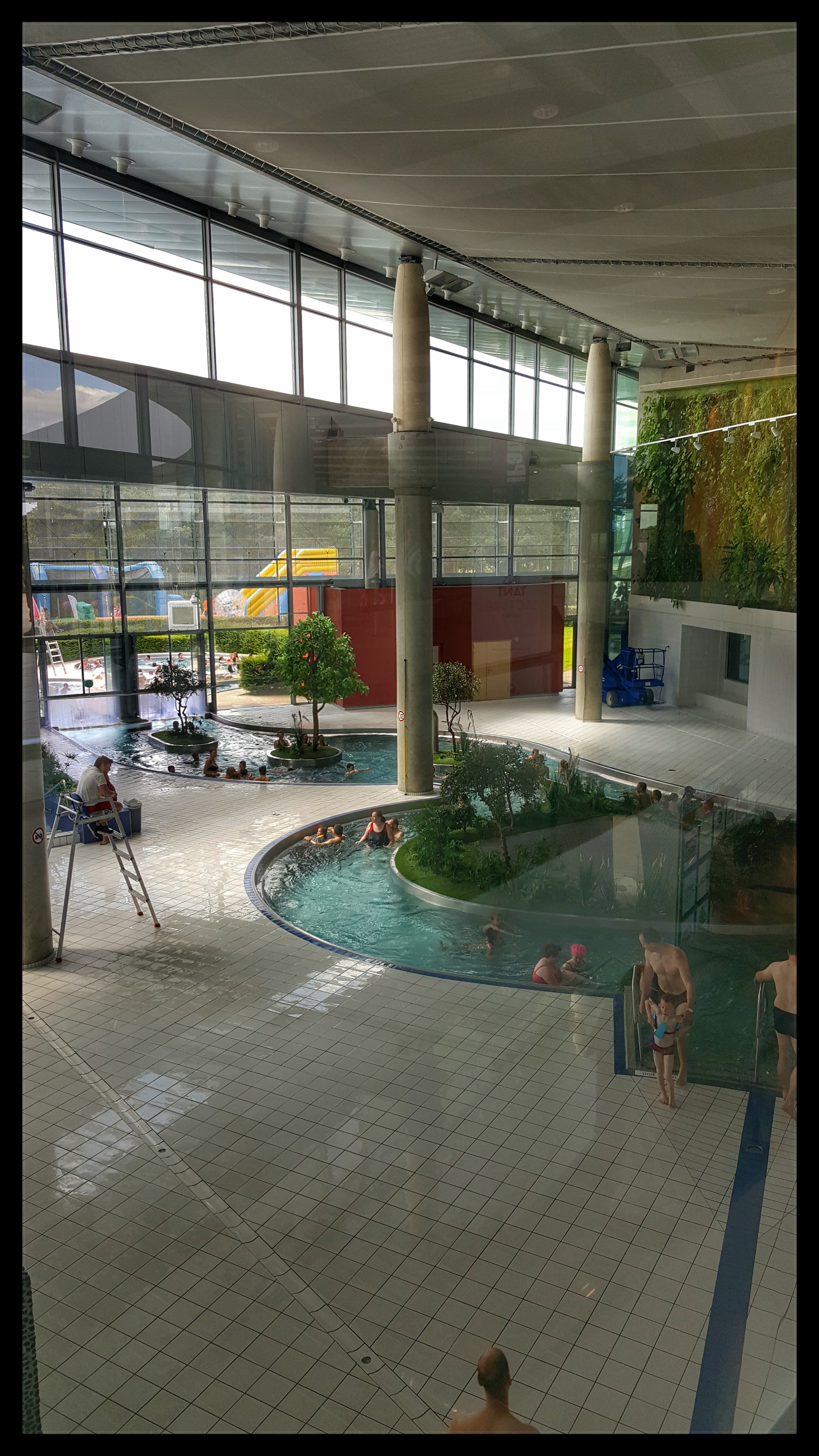 Complexe sympa niveau piscines mais honnêtement à un moment donné se faire reprendre comme des gamins toutes les 5mins pour un oui ou un non ça va bien.t es dans un bassin ou tes enfants ont pied on te prend la tête parceque t es pas dans l eau avec alors que t as tjs un œil sur eux , mon fils se fait reprendre parcequ il tenait la main de ses sœurs pour aller a une piscine (comme si il avait pas de mère) ,j étais juste derrière eux...toboggans honnêtement c est pas des trucs de fou pas avant 8ans seul,tu veux photographier tes enfants tu peux pas...bref t es censé passer un bon moment mais t es fliqué de partout pour pas grand chose je n y reviendrai pas.