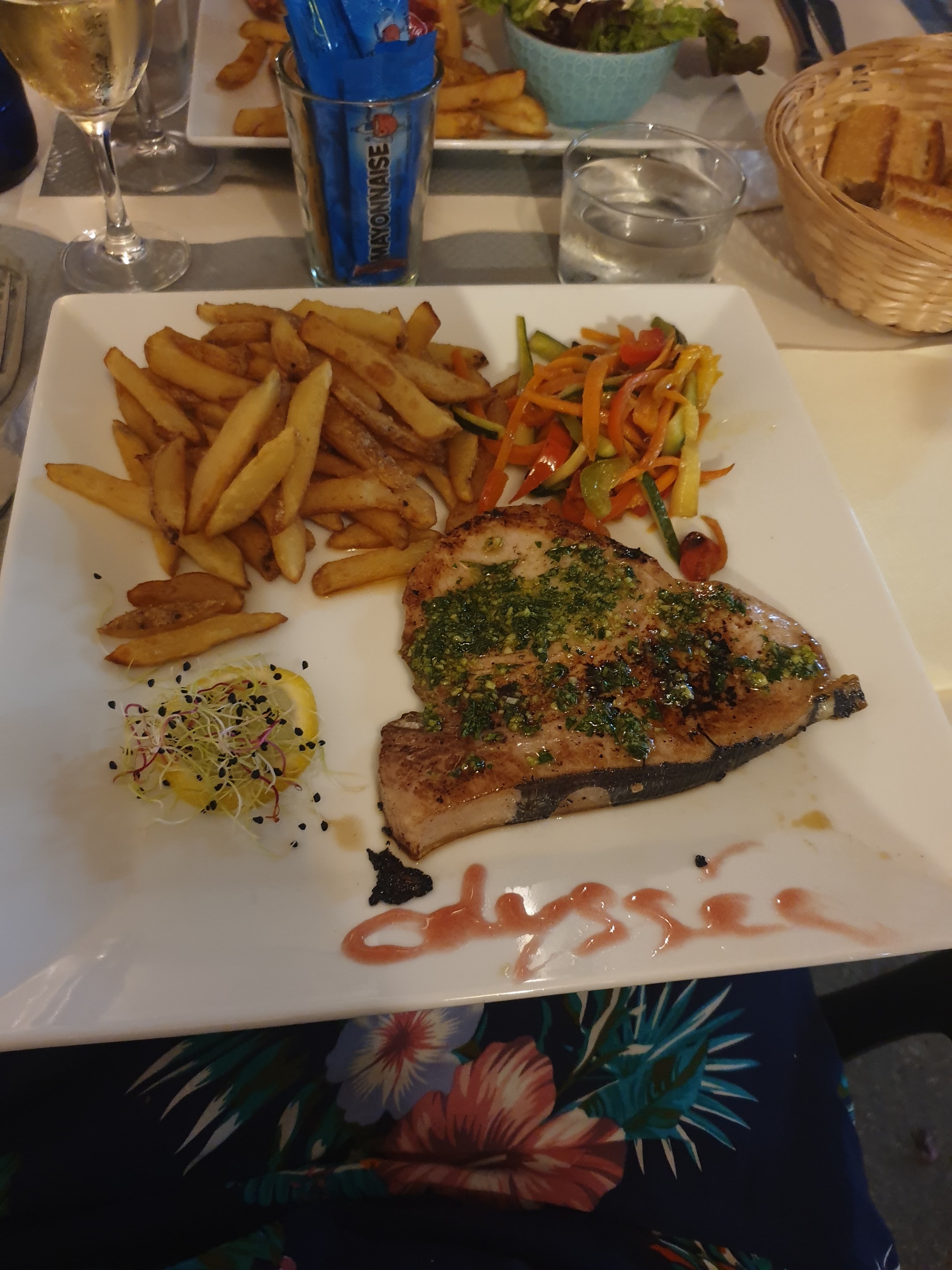 Bonjour, hier soir nous avions une table en extérieure, très agréable moment entre amis. Nous avons commencé par des cocktails très rafraichissants, puis pour ma part une dorade royale accompagnée de frites maison et de légumes. C'était très bon. Les plus gourmands ont pris une grosse coupe de glace ou des crèpes. Très bon accueil, bonne ambiance pour ce restaurant dont c'était une première. Serveuse très gentille.