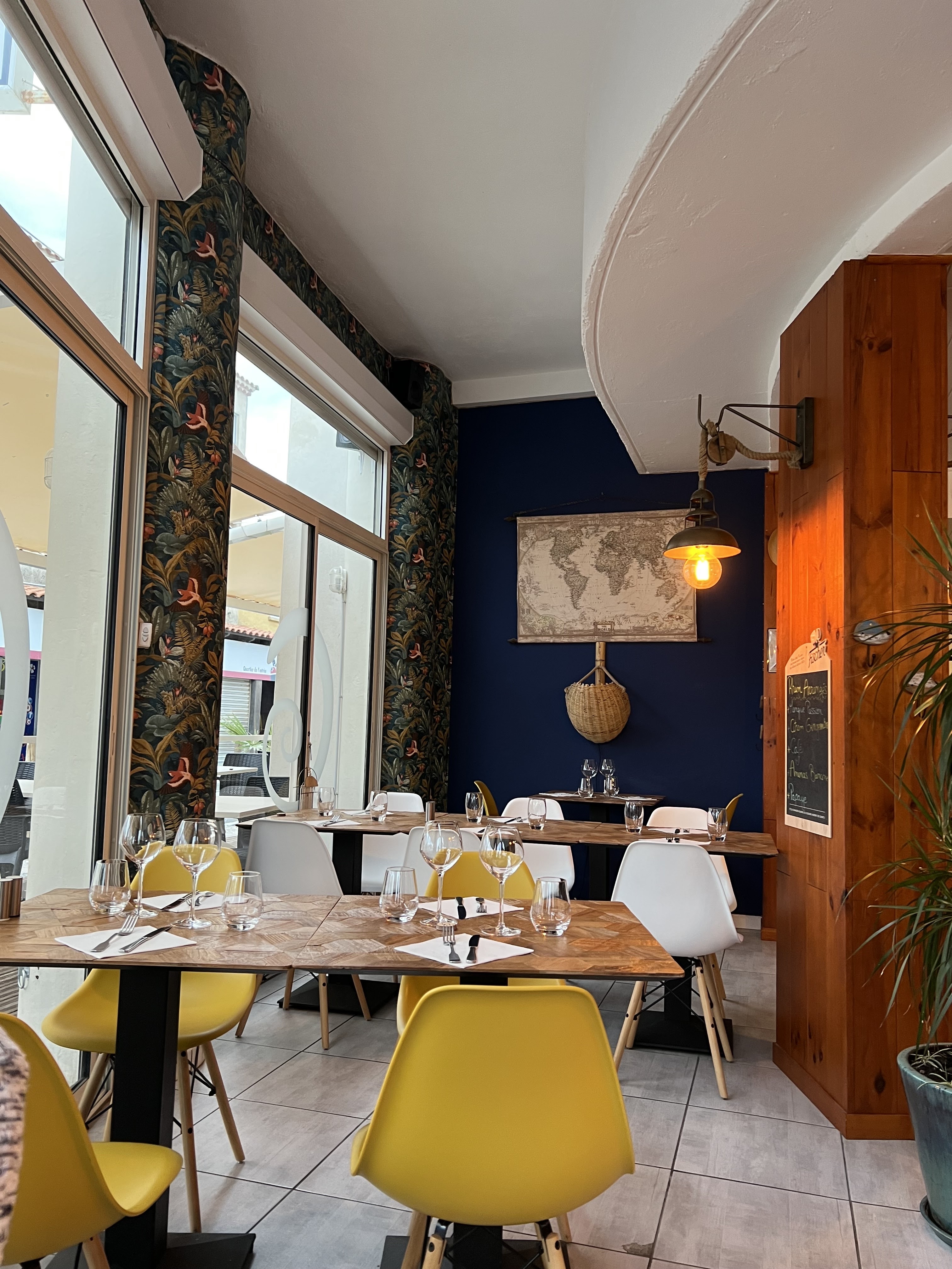 Restaurant, bar à cocktails proche de la plage de Frontignan. Terrasse et salle claire, décorée avec goût dans les tons blancs et bleu roi, style années 60, vintage, qui apporte de la fraîcheur. Les patrons sont accueillants et gentils. Nous étions 6, nous sommes arrivés après 21h et avons été bien accueillis, nous avons pu dîner malgré l'heure tardive. Les entrées sont originales et copieuses. Les plats sont goûteux, les frites sont fait-maison. Les glaces sont artisanales, très originales dans les parfums et bonnes. Excellente musique que nous avons shazamée. Nous avons passé un excellent moment entre amis. À découvrir sans tarder!