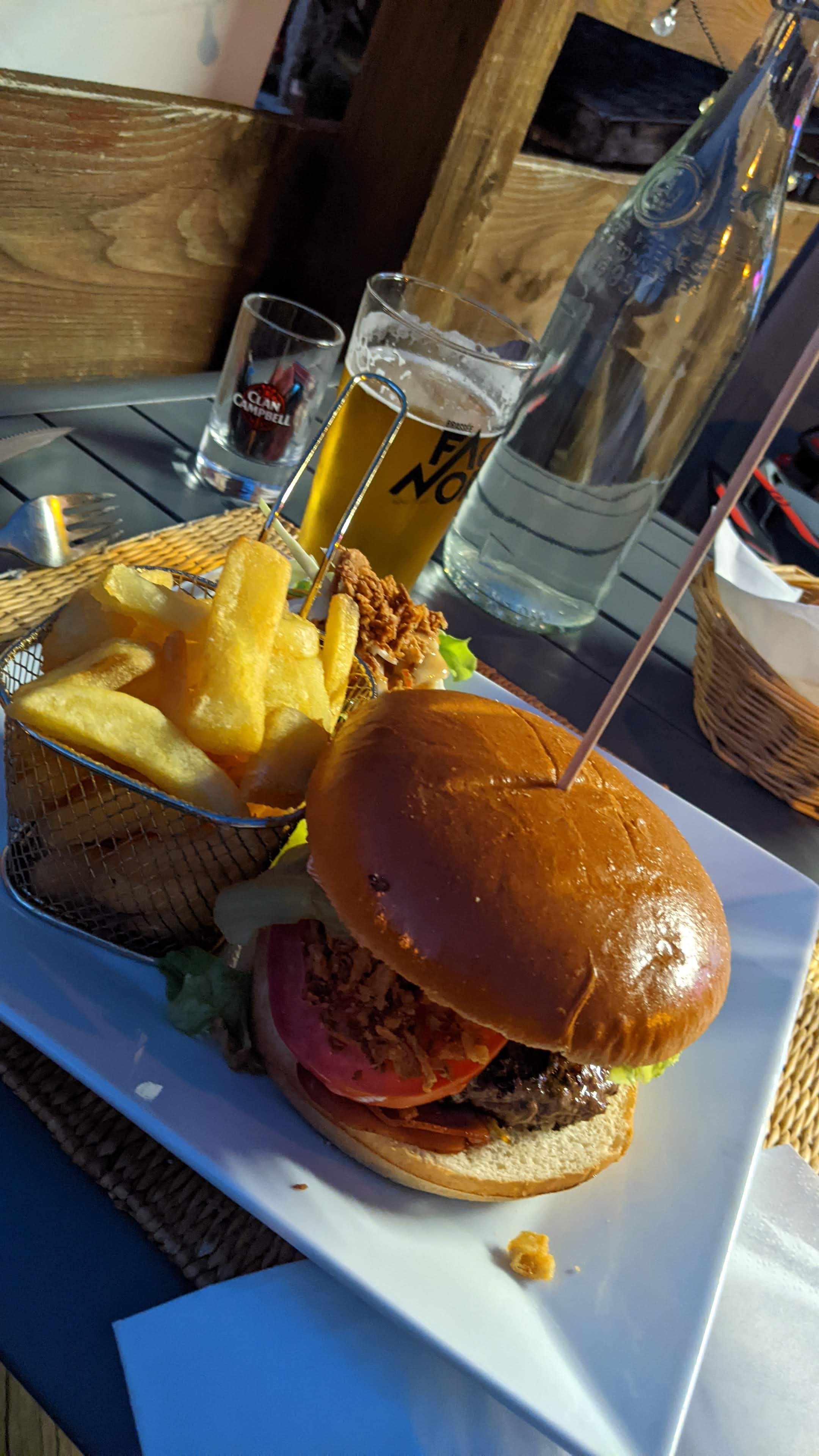 Nous avons pris un bon repas ici. Nos hamburgers étaient bien cuits, moyens comme nous l'avions demandé. Les frites étaient croustillantes et délicieuses. Le vin, comme on peut s'y attendre en France, était juste assez bon ! C'est simple mais bon ici et il ne faut vraiment pas s'attendre à plus. C'est un peu comme un village de montagne. D'après mon expérience, le personnel était très sympathique et si je reviens, je reviendrai ici.