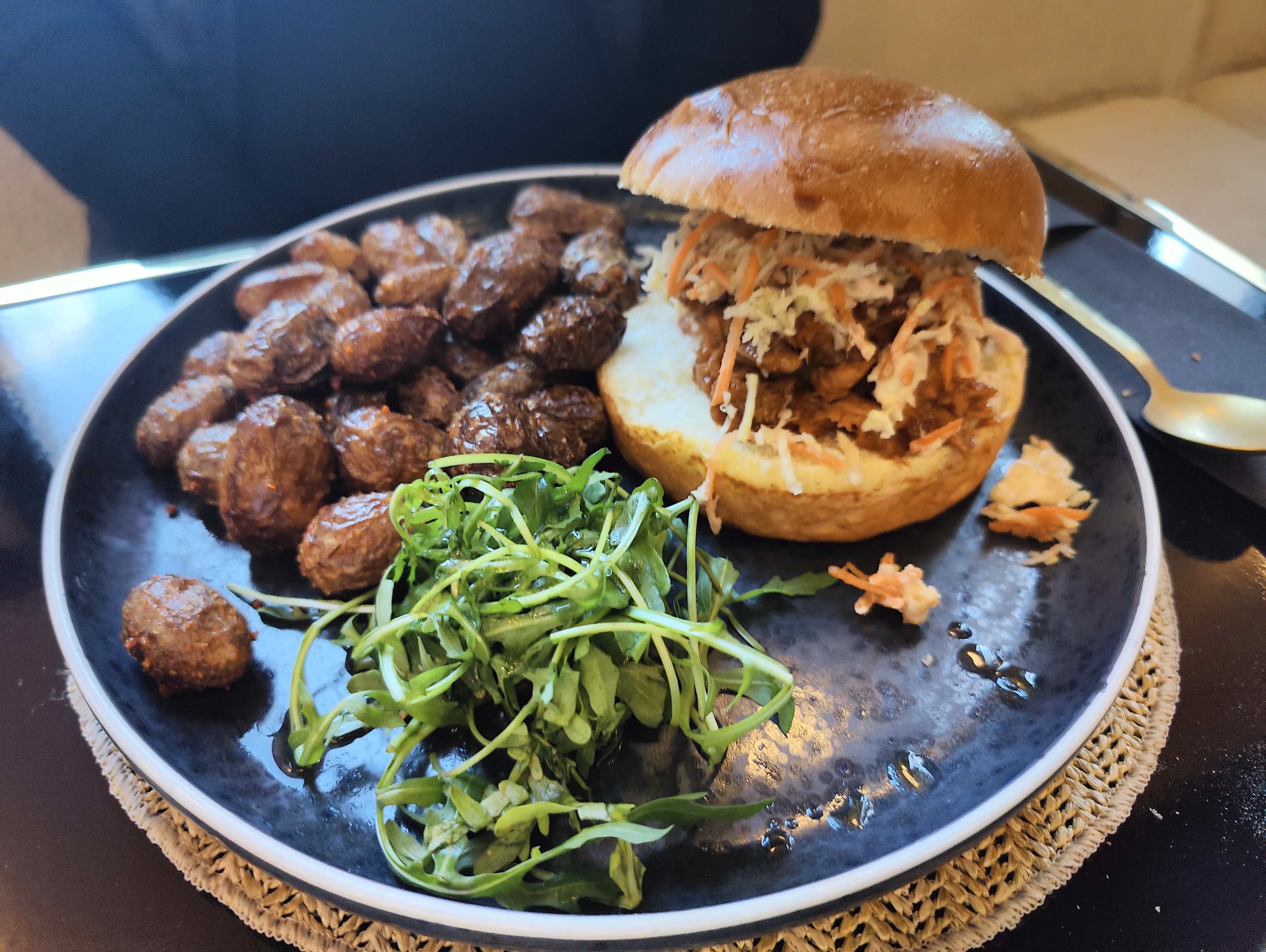 Très bonne pâtes avec du vrai jambon depays et tomates séchées. Bémol sur le clafoutis au pomme. Superbe salle avec des fauteuils ultra confortable