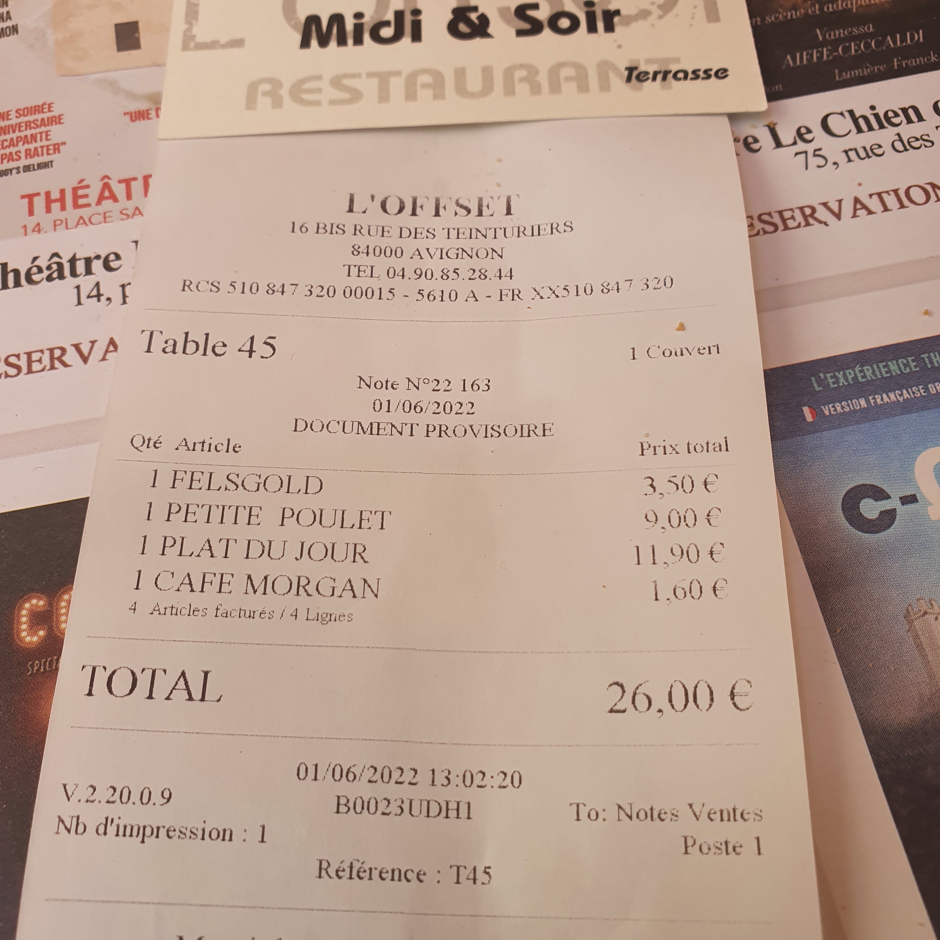 Ce soir je suis allé manger avec mon épouse a l'offset... Une salade caesar commandé ainsi qu'un plat de pâtes sauce tomate et pesto. A partir de là ça se gâte... Arrive une salade carton avec une sauce vinaigrette qui n'est pas maison. Bon ok il y avait bcp de salade mais pas trop d'assortiments. Pour les pâtes, je pensais être dans un gastronomique tellement je comptais le nombre minime de pâtes... Je le fais remarquer à la jeune serveuse visiblement gênée. Bien évidemment, après ces 2 plats, inutile de commander des desserts tellement je pense que l'on se serait fait arnaquer ! Comme je ne suis pas un lâche, je fais mes remarques directement au patron au moment de payer et lui assure de mon juste avis sur Google. Désolé mais on ne récolte que ce que l'on sème ou plutôt ce que l'on cuisine... Ok je veux bien que ce soit le festival d'Avignon mais apparemment je ne suis pas du tout le seul à avoir des doutes sur ce restaurant !!!! Tant pis. Merci de lire ce post pour vous éviter des aigreurs d'estomac dues à votre future ire !!