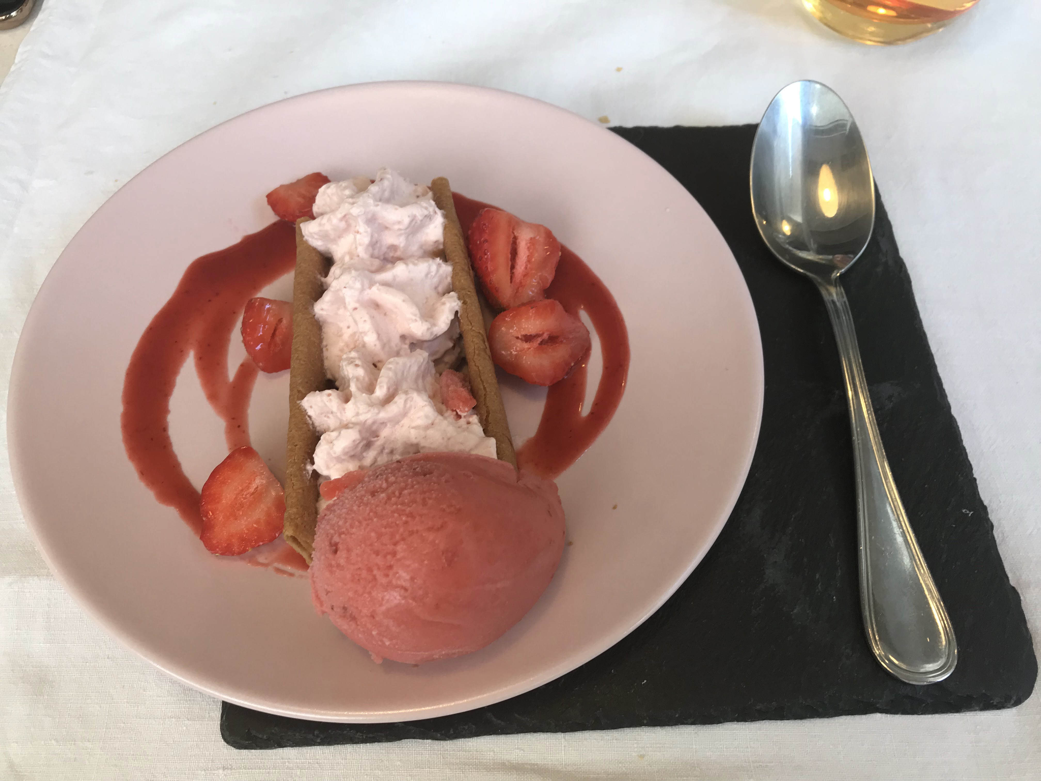 Malgré les rigueurs dues au covid et à la météo ( déjeuner en terrasse, température autour de 10/12°) nous avons beaucoup apprécié l'accueil et surtout le repas. 25€ entrée,plat, dessert 1 verre vin rouge, café. Quel délice ce sablé breton , basé de la compotée de rhubarbe & mousse fraise.... Nous reviendrons.
