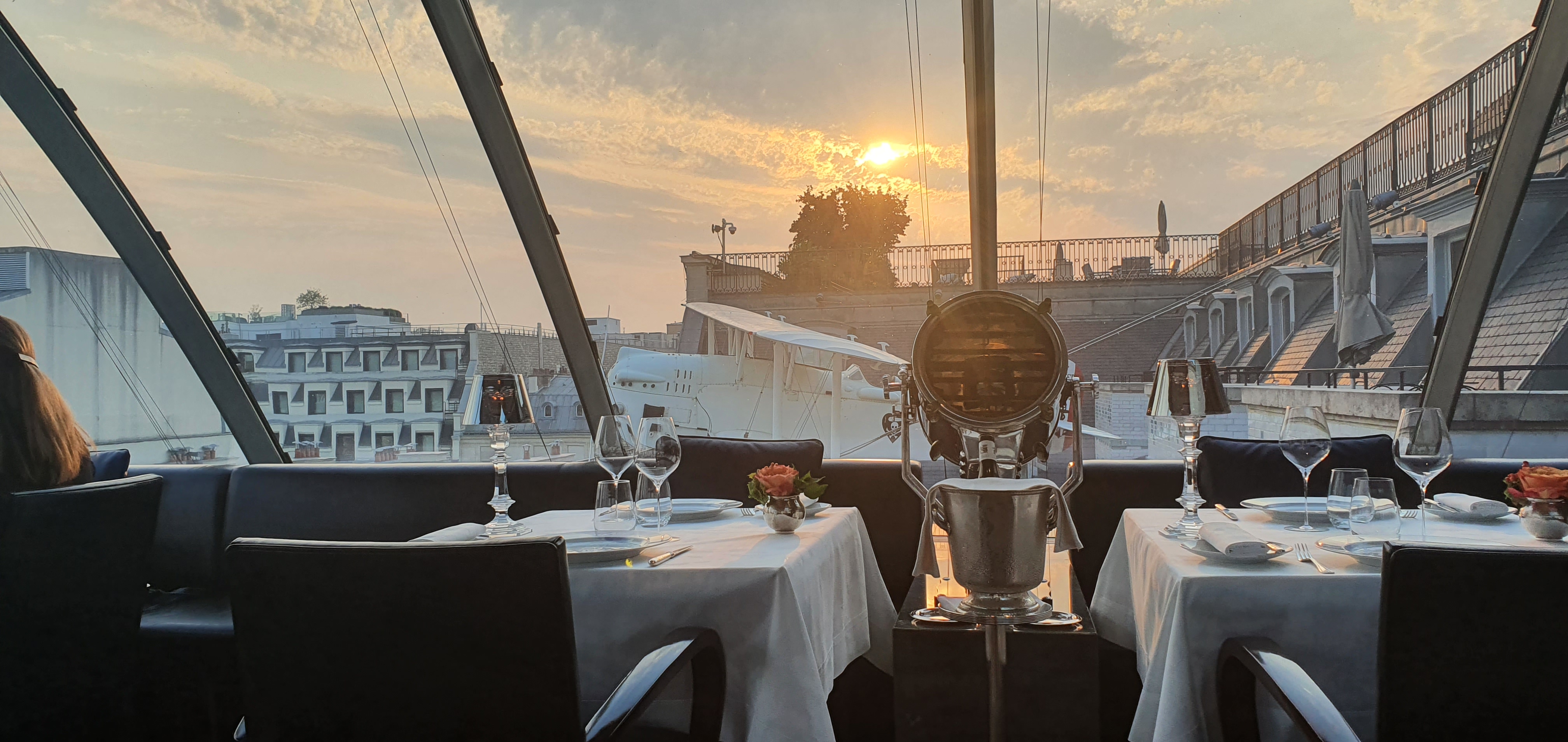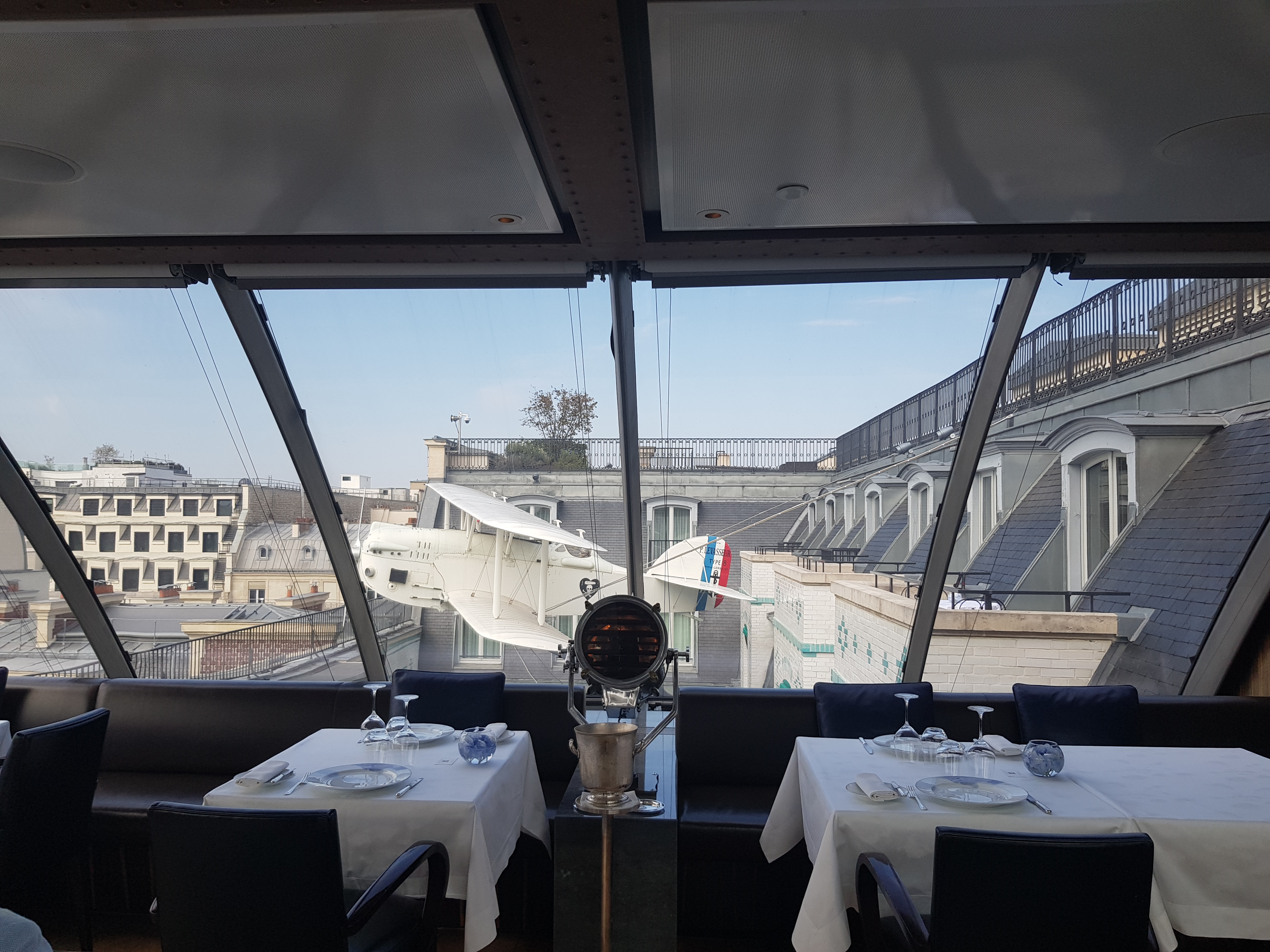 Lieu magique tout en haut de l’hôtel Peninsula.. Belle vue sur la tour Eiffel et au loin le Sacré-Cœur. Tout le décor du restaurant a été crée pour reproduire l’intérieur d’un avion. Cuisine gastronomique, mets raffinés,service impeccable. C’est un endroit charmant, l’été il y a une grande terrasse. Je reviendrai avec plaisir
