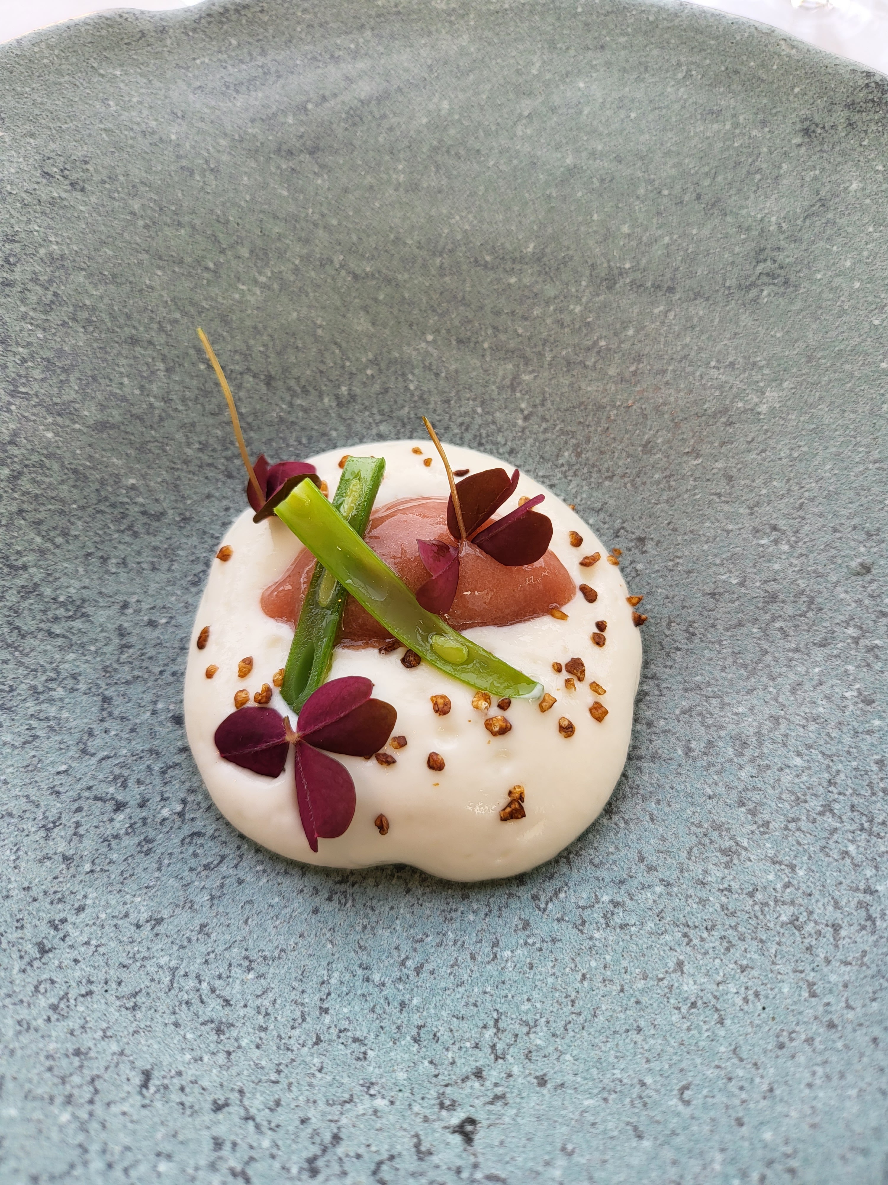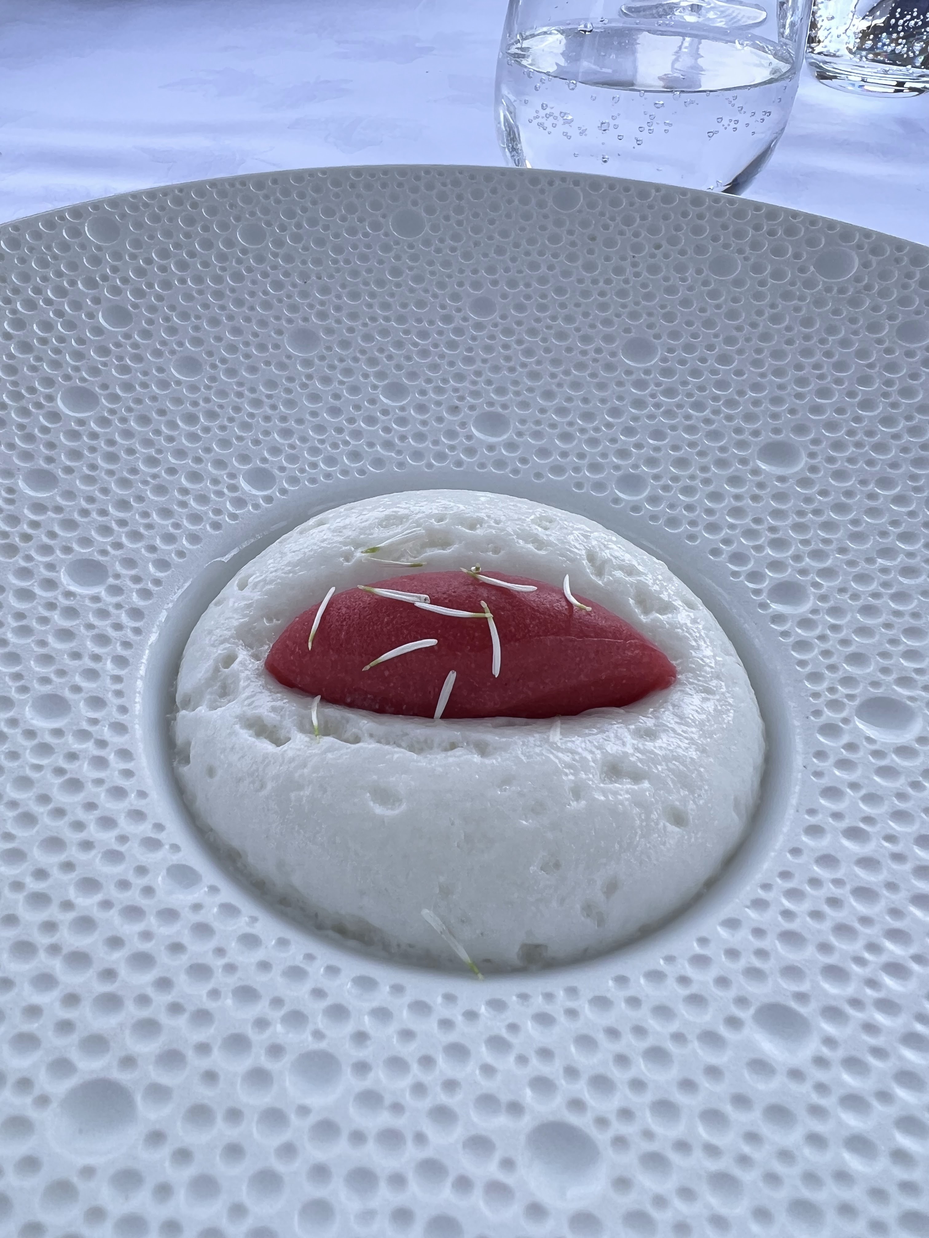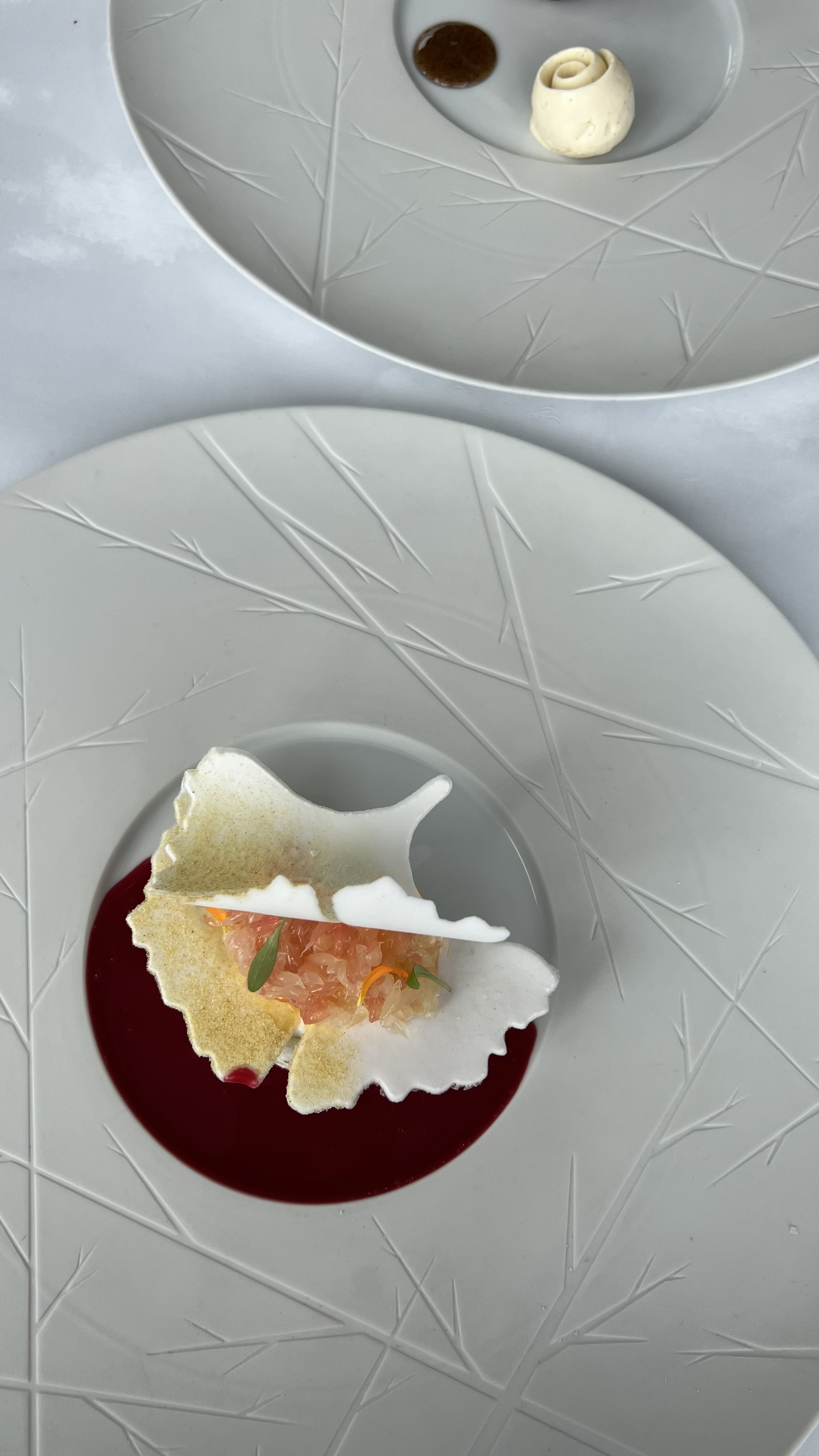 Un peu déçu de notre déjeuner d'aujourd'hui. Entree:Carpaccio de diamant noir, 95 euros, il fallait chercher le foie gras. On dirait une déco printanière dans l'assiette. Plat : turbot à la feuille de châtaigne très bien, l'ensemble est harmonieux. Mais l'autre plat quand l'océan percute la terre est une catastrophe. Il faut revoir ce plat qui n'est ni terre ni océan avec une sauce assez salée qui cache le vrai goût de produits. Les fromages sans intérêts, le dessert kiwi végétal, original, mais ça reste jolie à voir. Le café espresso 13 euros sans miniadises (un oubli ?) me paraît très cher. Le service laisse à désirer : pas de ramassage de miettes avant le café ? Pas digne de 2 étoiles. Côté positif, très jolie vue avec ce beau temps et une décoration originale.