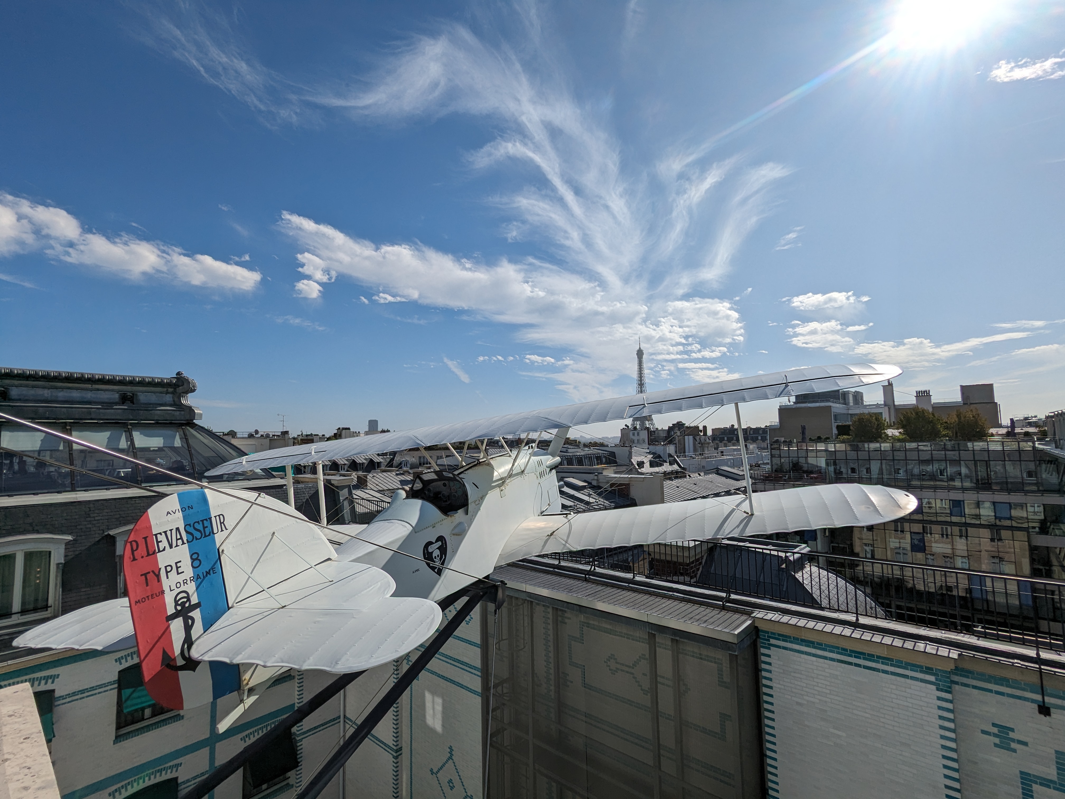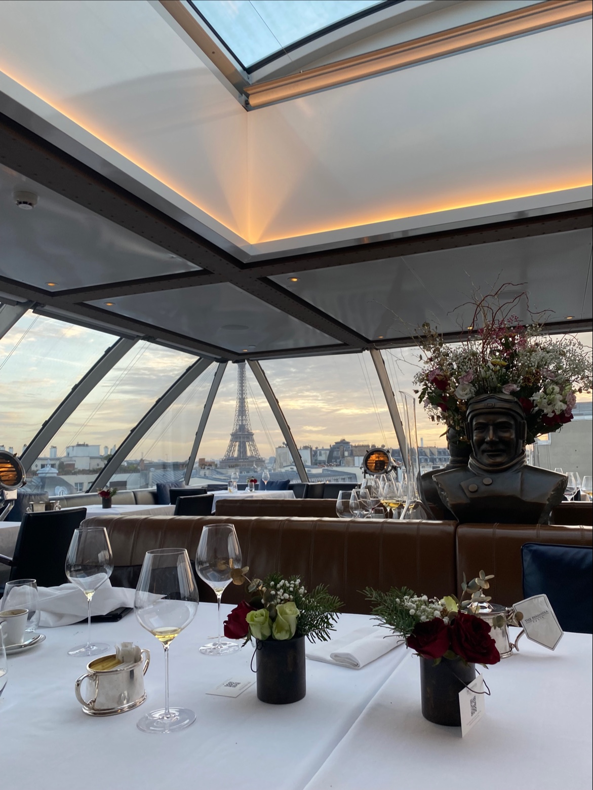 Tout y est exceptionnel ! Nous y sommes allés pour l’anniversaire de mon mari, passionné et expert en aéro. Comme sollicité à la réservation, notre table lui a permis de dîner face à « L’oiseau blanc » … (et face à moi aussi quand même 😊 !). Ce n’était que le début de la magie ! La suite nous a comblé des gentilles attentions durant le service jusqu’à la vue sur la Tour Eiffel et, bien sûr, en passant par l’assiette, autre star du lieu. Le service est remarquable, le cadre parfait, la carte originale et la qualité des mets exceptionnelle. Une cuisine raffinée offrant un plaisir pour les yeux d’abord, une explosion de saveurs en bouche ensuite. Sur les conseils du sommelier, vins en parfait accord. Bref, un instant inoubliable, suspendu sur les toits de Paris. Les prix tout à fait raisonnables pour la qualité du lieu. Un grand merci !