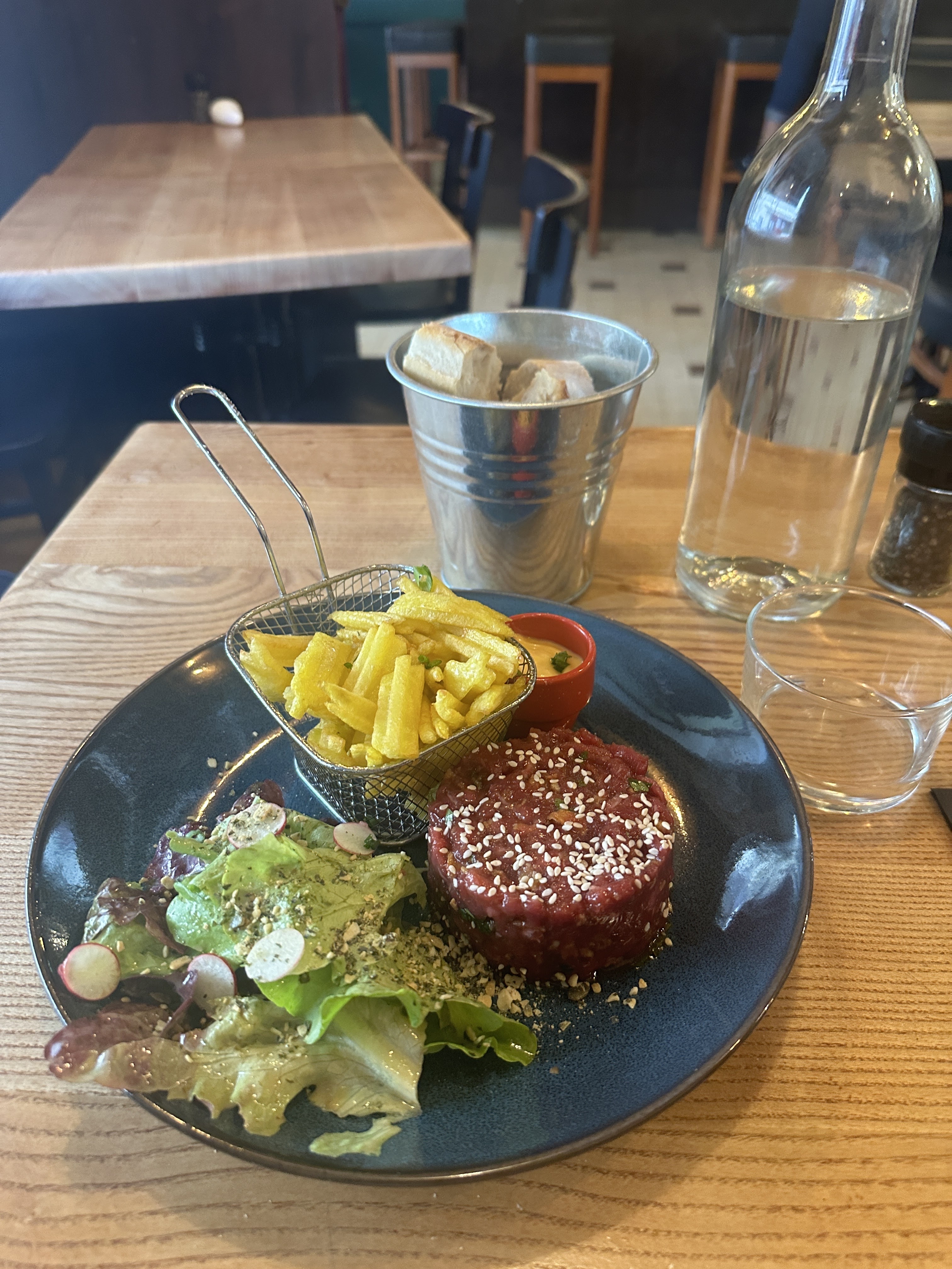 Deuxième passage et toujours aussi impressionnant. Du goût de la mâche et beaucoup de fraîcheur. Le tartare est toujours aussi surprenant et une entrée improvisé avec un boudin fondant. Une cuisine à l'ardoise on peut passer plusieurs fois, et manger toujours différents. L'aile de raie de ligne me donnant envie, mais j'ai préfèré regouter le bon tartare frais et gourmand. Équipe accueillante. Carte courte et cuisine du jour. Un joli tartare et plein d autres plats à goûter.