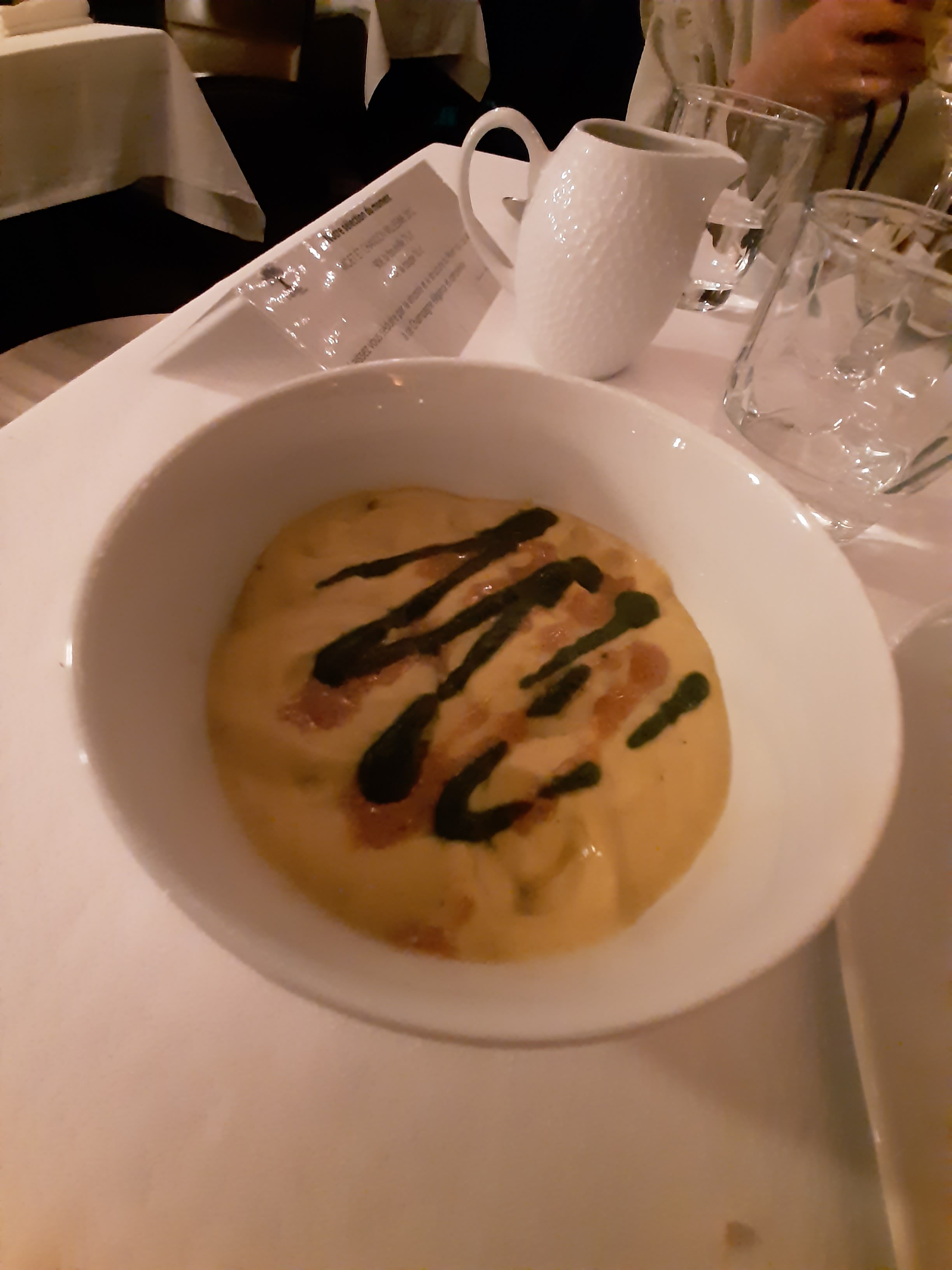 Cadre agréable Apéritif servi sans accompagnement et dépôt au fond du verre de porto Pas avertis lors de la réservation que le menu était unique Ambiguïté entre mise en bouche et entrée (et sans saveur) Poisson correct mais pâtes trop cuites Couverts sales Dessert industriel trop sucré Néanmoins , geste commercial de l'établissement