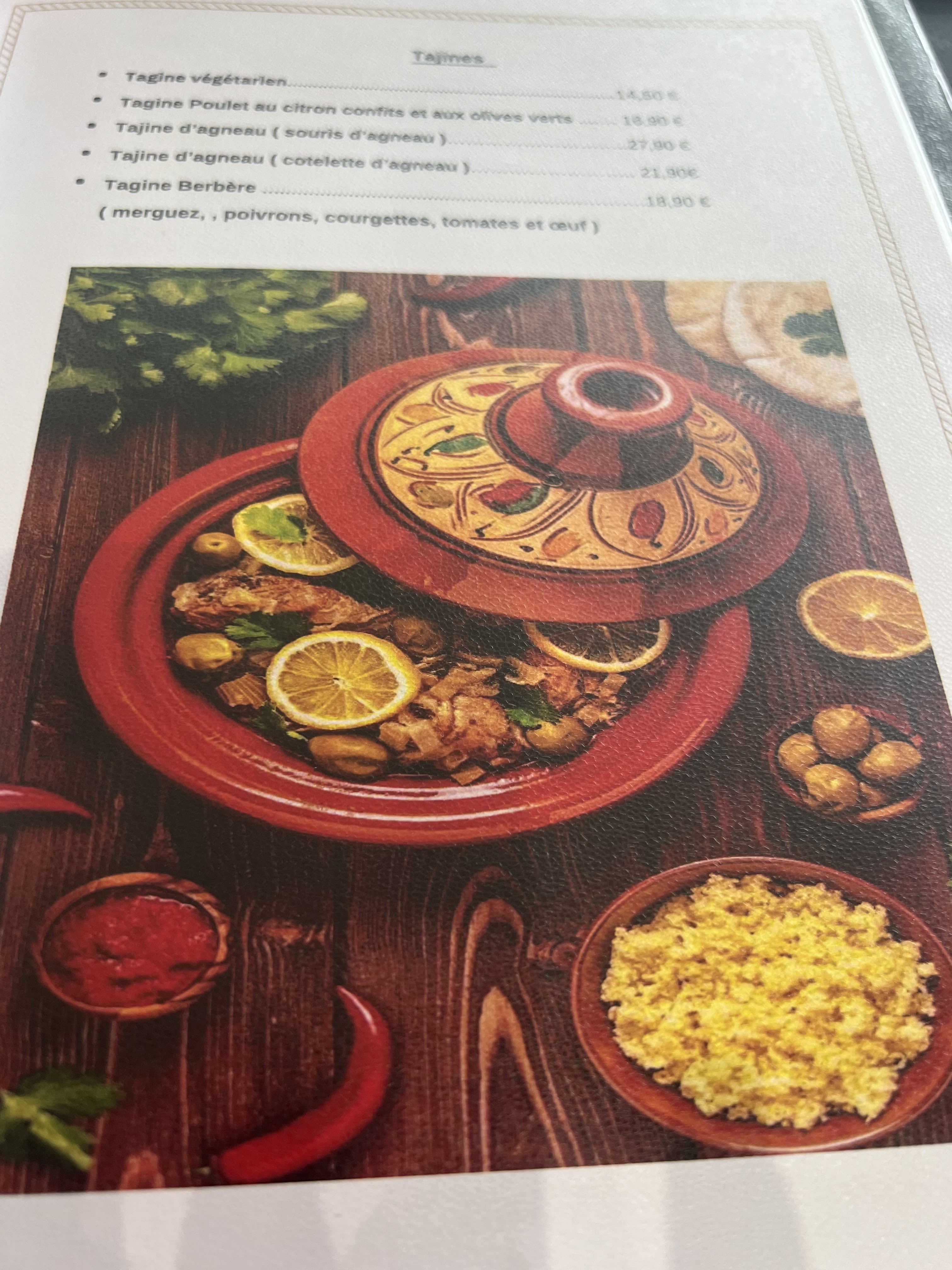 Le 27 mai l'assoc s'est fixe cette date pour découvrir ce nouveau restaurant. Il faisait assez froid suite à une pluie continuelle. Tout de suite nous fûmes reçus par un très bon thé à la menthe. Les entrées commandées avait l'air de plaire + à certains.. Le humour n'était pas bon, bcp de grumeaux, pas de goût. Bref. Plat principal nous avions pris du couscous, pas mal je dois dire. Le service était très bien je pense qu'ils doivent encore s'améliorer