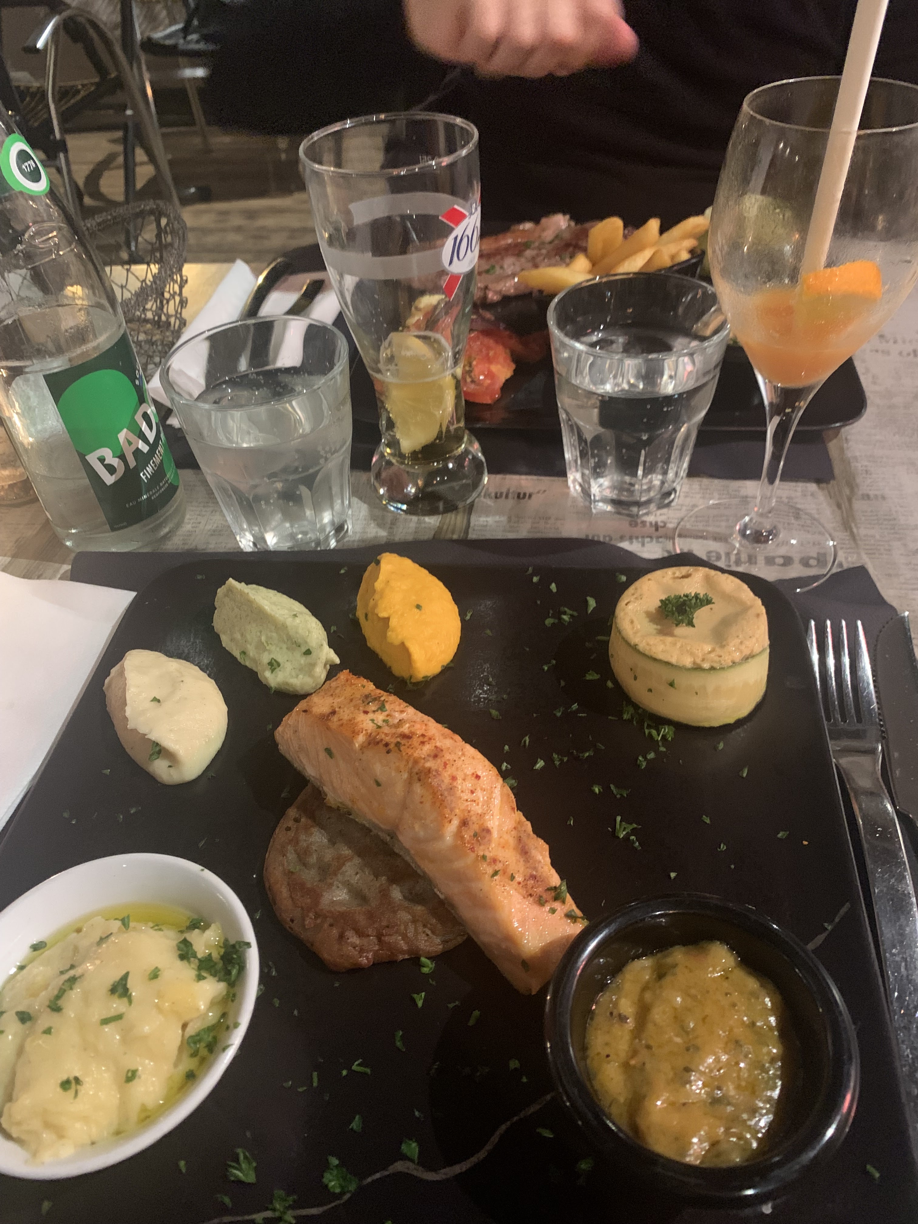 En entrée nous avons pris une crème brûlée au camembert (très bonne) et le St Marcellin pané (les tomates non de saison ne faisaient pas envie et visuellement ce n'était pas élégant). En plat nous avons pris un faux-filet avec des frites. Le faux-filet n'était pas grand et les frites baignées dans l'huile.. elles brillaient de mille feux ! Les desserts étaient très bons (fondant au chocolat et tatin d'abricot). Même si gourmande que je suis aurait aimé une touche glacée pour accompagner la tatin (glace ou crème).