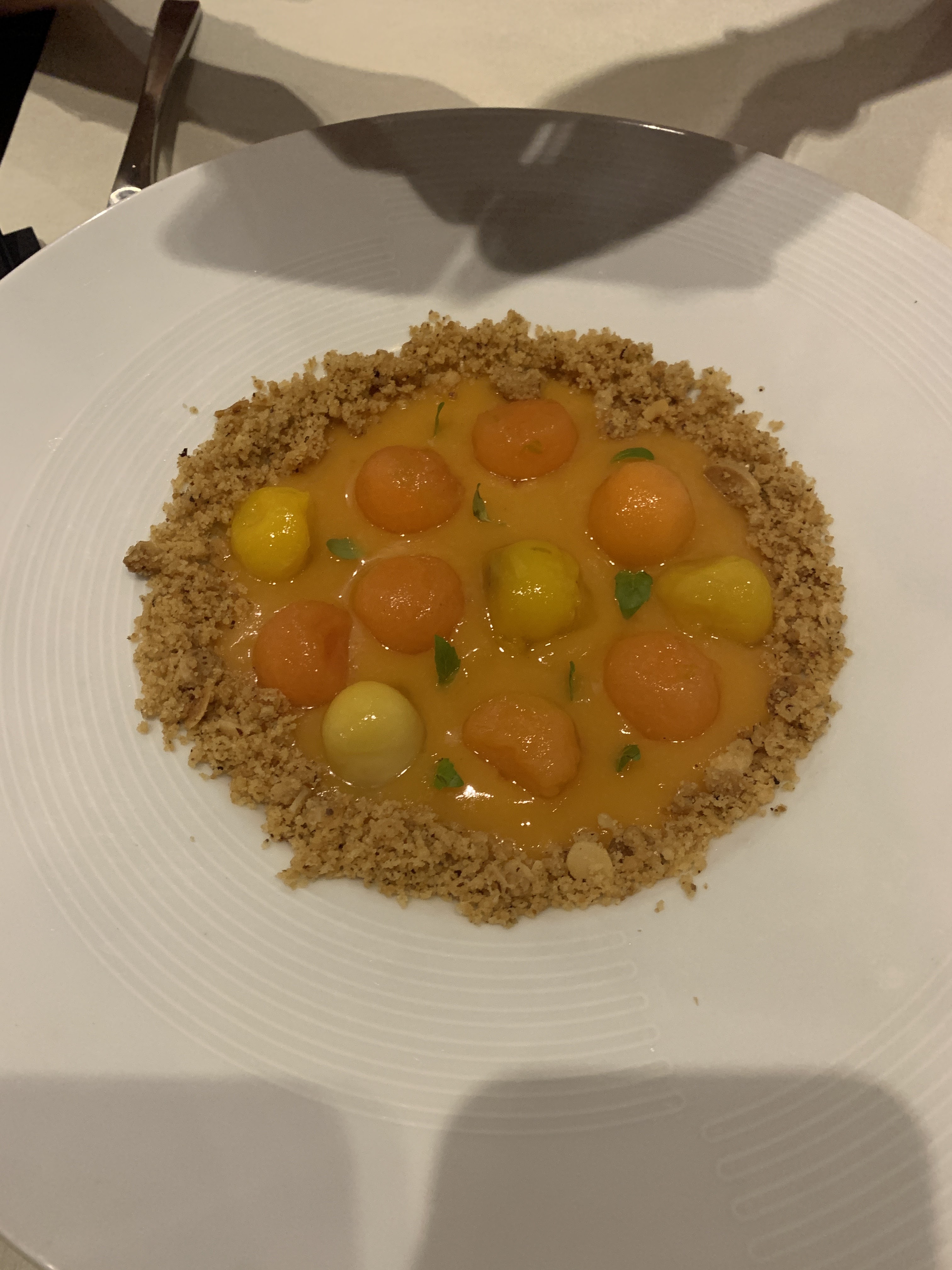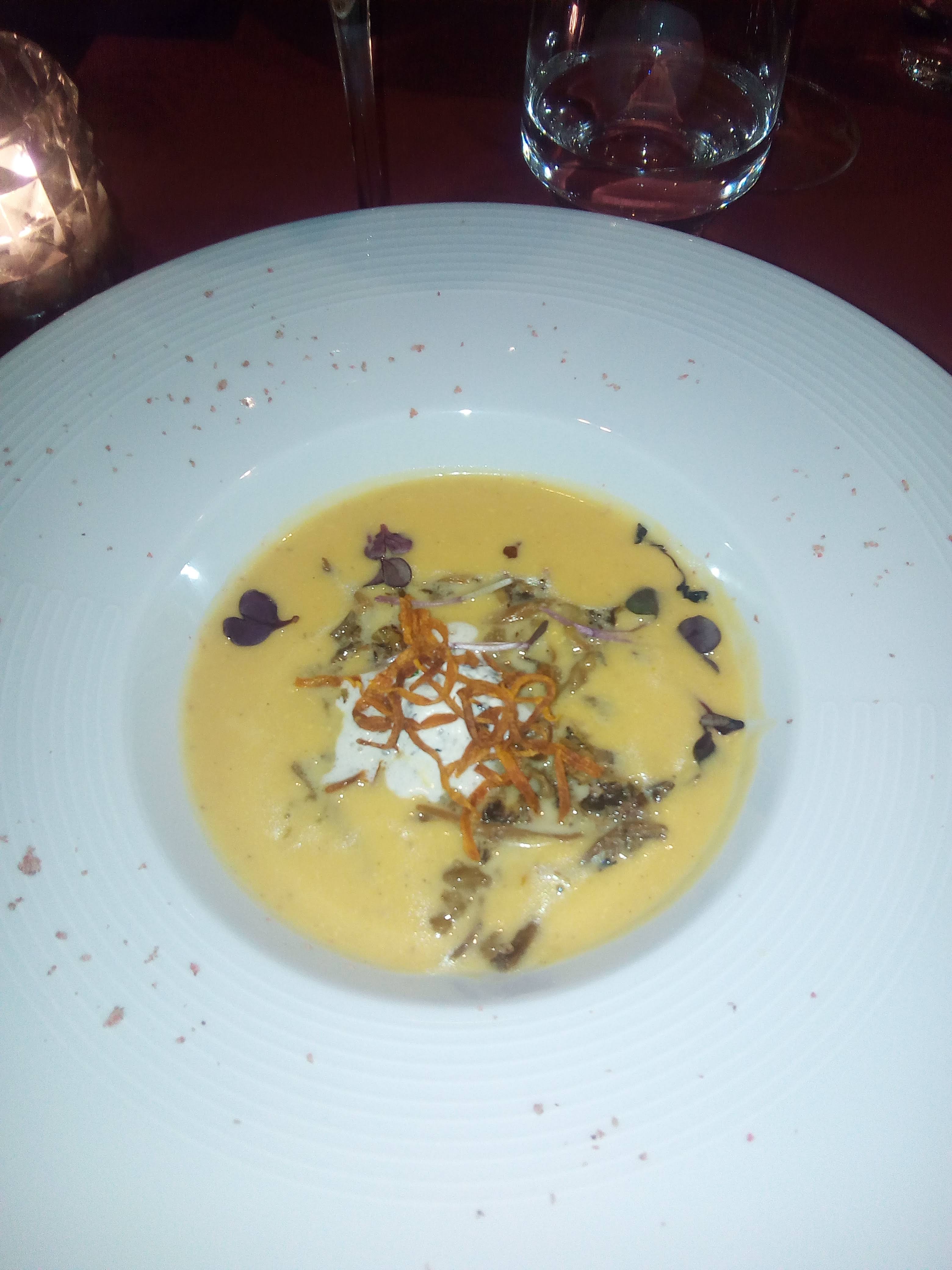 Petites portions mais qualité excellente, bouchés aux fromages excellentes ( même si on aurait voulu en avoir plus qu'une par personne ;)) la soupe au potimarron, marron glacé et noisette : un délice, l'agneau en plat principale est fondant à souhait, petit bémol pour le dessert à l'ananas que je n'ai pas trouvé transcendant.