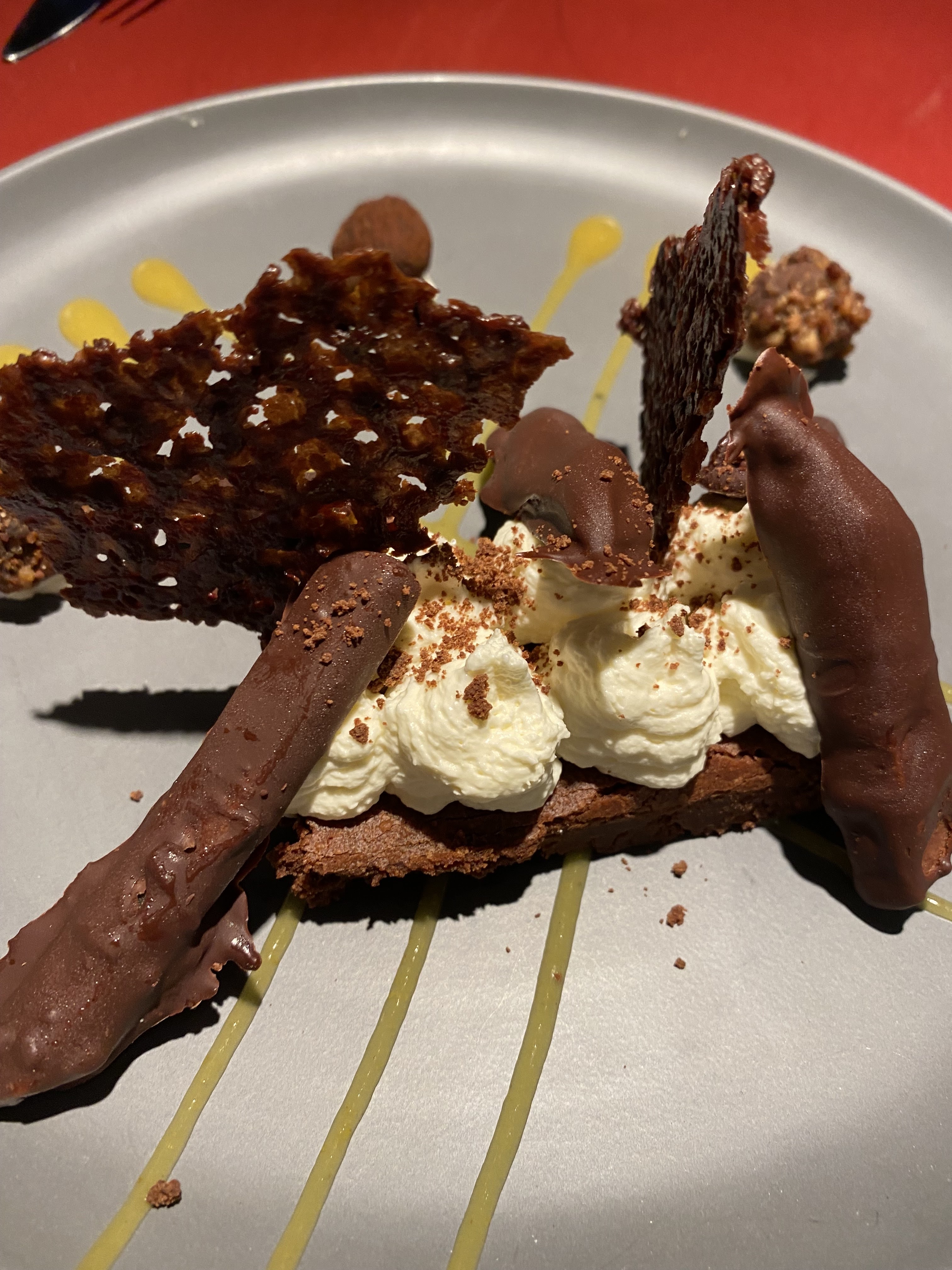La viande était succulente, tant grâce à sa qualité qu'à sa cuisson. Et l'accompagnement (mousseline de patate douce à la cardamome) à tomber par terre. Le vin rouge suggéré pour accompagner le plat était tout à fait adapté. On est bien ici dans un bistronomique de qualité, pas de doute
