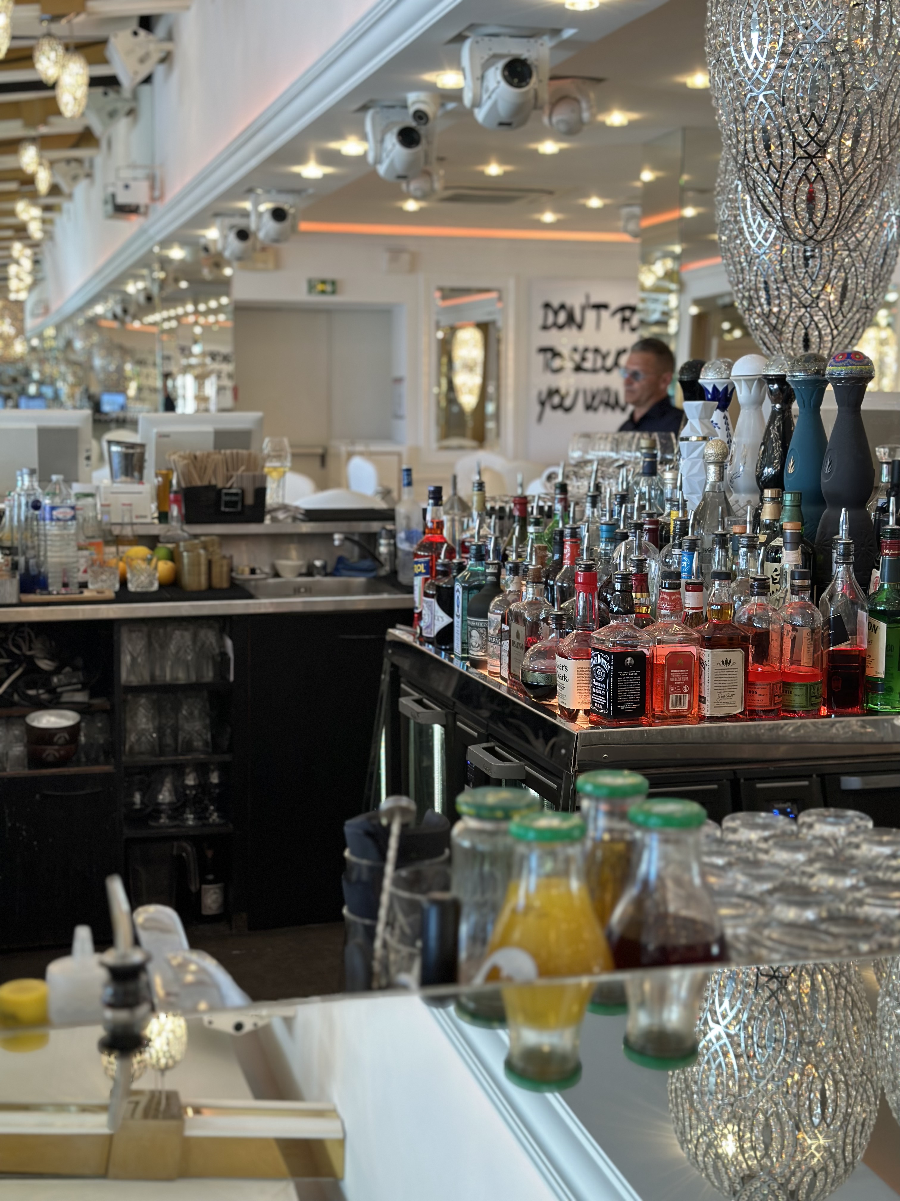 Joli cadre et jolie terrasse mais.. si vous ne souhaitez pas prendre leur magnum de champagne à 1500e mais d'autres bouteilles, vous n'avez pas le droit de rentrer danser mais uniquement de rester sur la terrasse, a votre table (a 1200e tout de même). Et on n'oublie pas de vous le rappeler (en anglais car le vigile ne fait même pas l'effort de parler la langue du pays). Bref notre soirée a La Gioia était beaucoup plus agréable, pour des prix plus corrects et surtout un accueil beaucoup plus agréable.