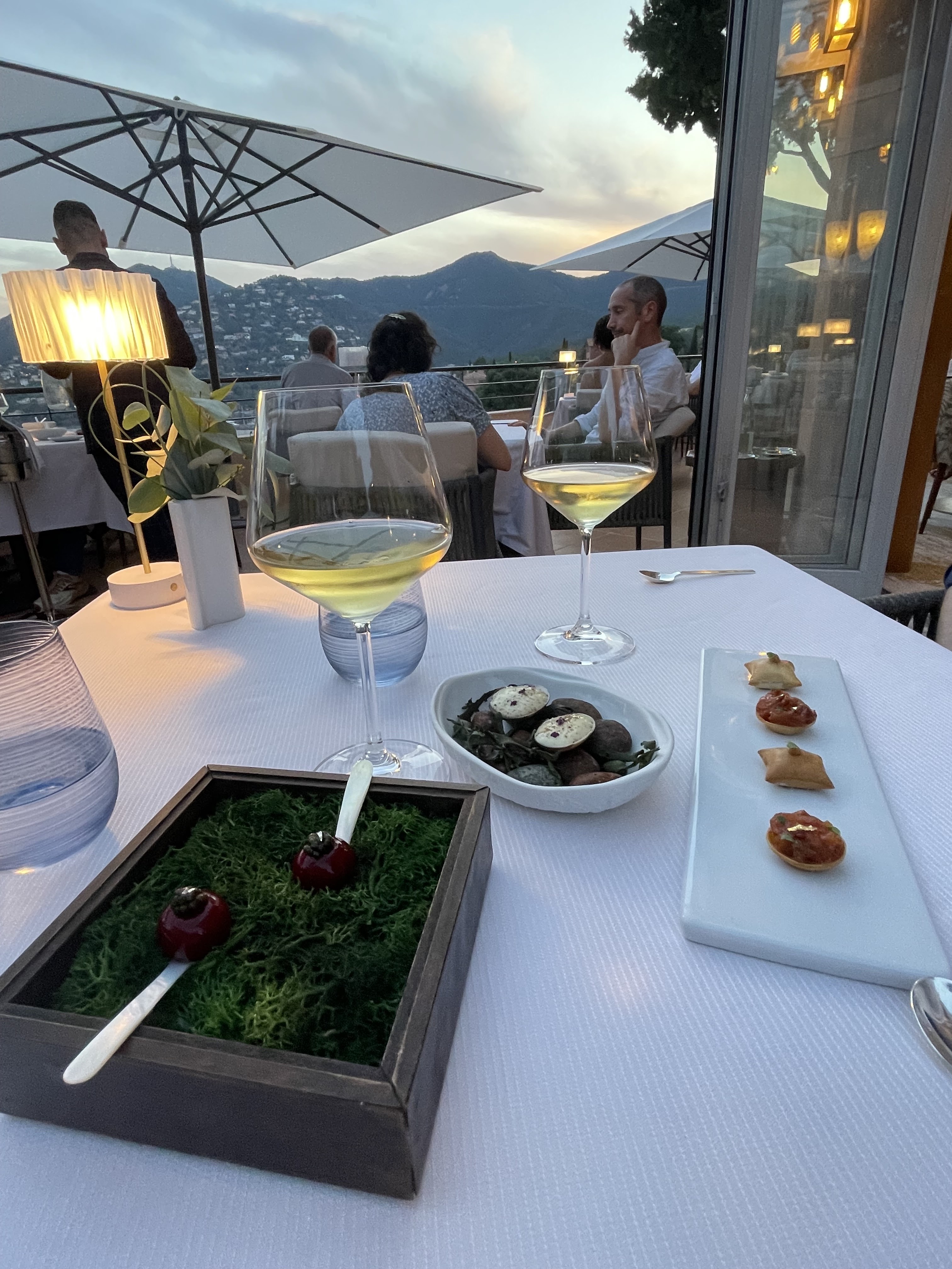 Une soirée d'anniversaire plus que réussie, tout était parfait, exquis, une très belle vue sur le massif de l'Estérel avec le coucher du soleil. La salle de réception est magnifique, les serveurs sont aux petits soins et très discrets. Nos restrictions alimentaires ont été prises en compte. Nous avions pris le menu en 4 services, toutes les propositions étaient divines, les différents pains proposés étaient tous très bons. La proposition de fromage était excellente. Le chef est même venu voir en salle si tout se passait bien. Vraiment tout était parfait, merci !