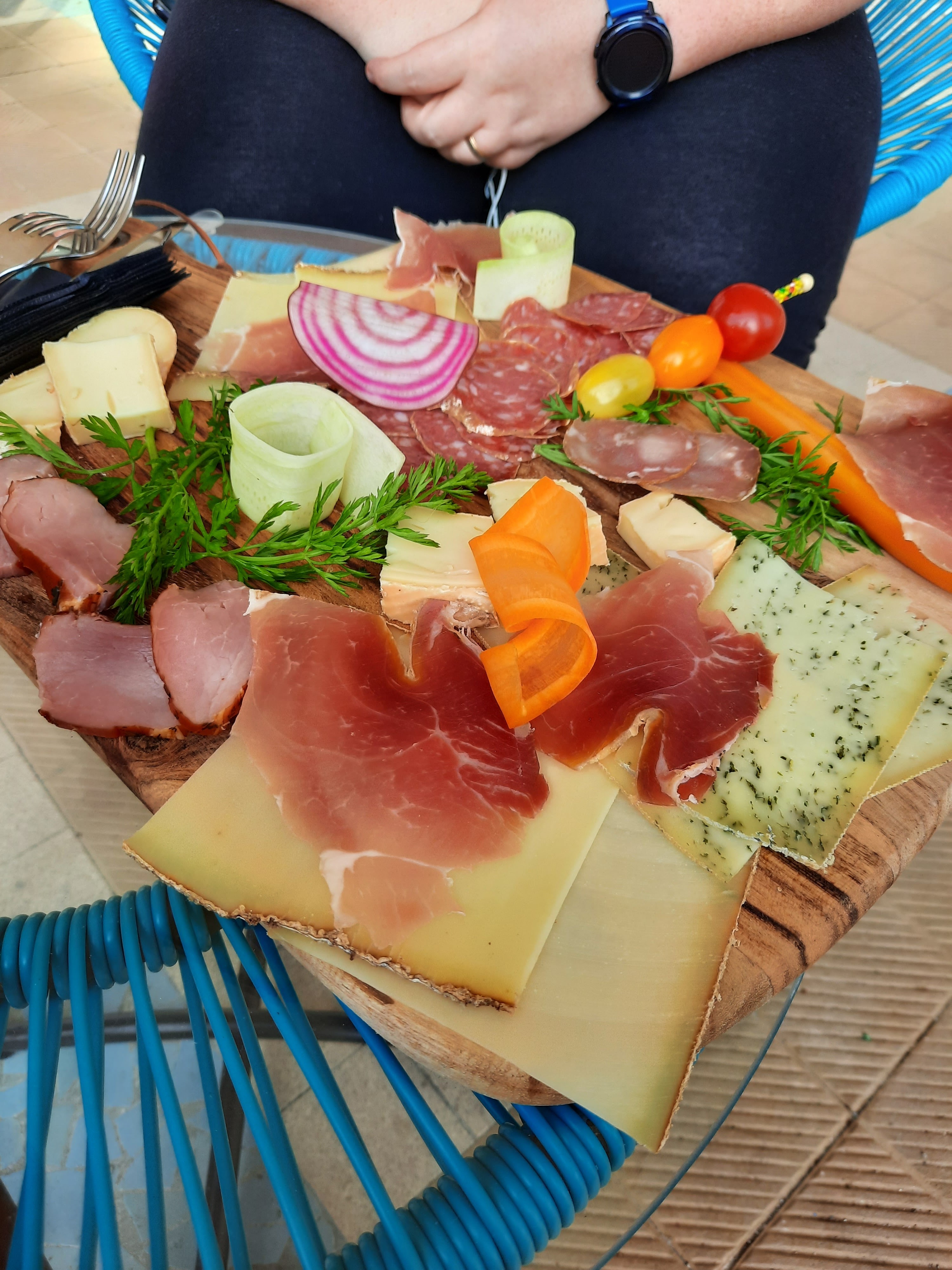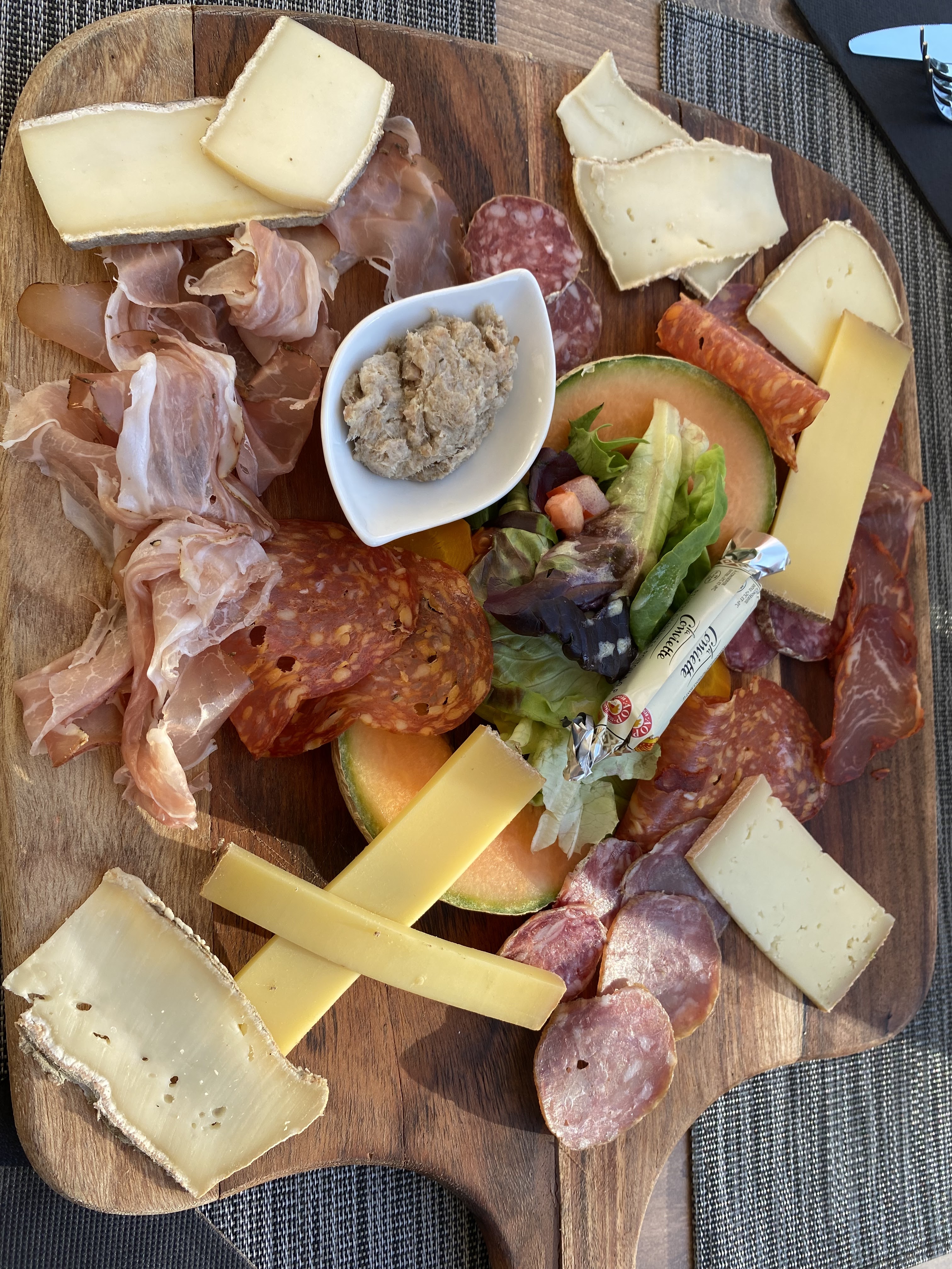 11,50 € pour une planche de charcuterie : une minuscule tranche de jambon fumé, une tranche de mortadelle et 2 de saucisson, la salade, elle, était en quantité...heureusement il y avait le beurre de la cantine et du pain ! Déçus