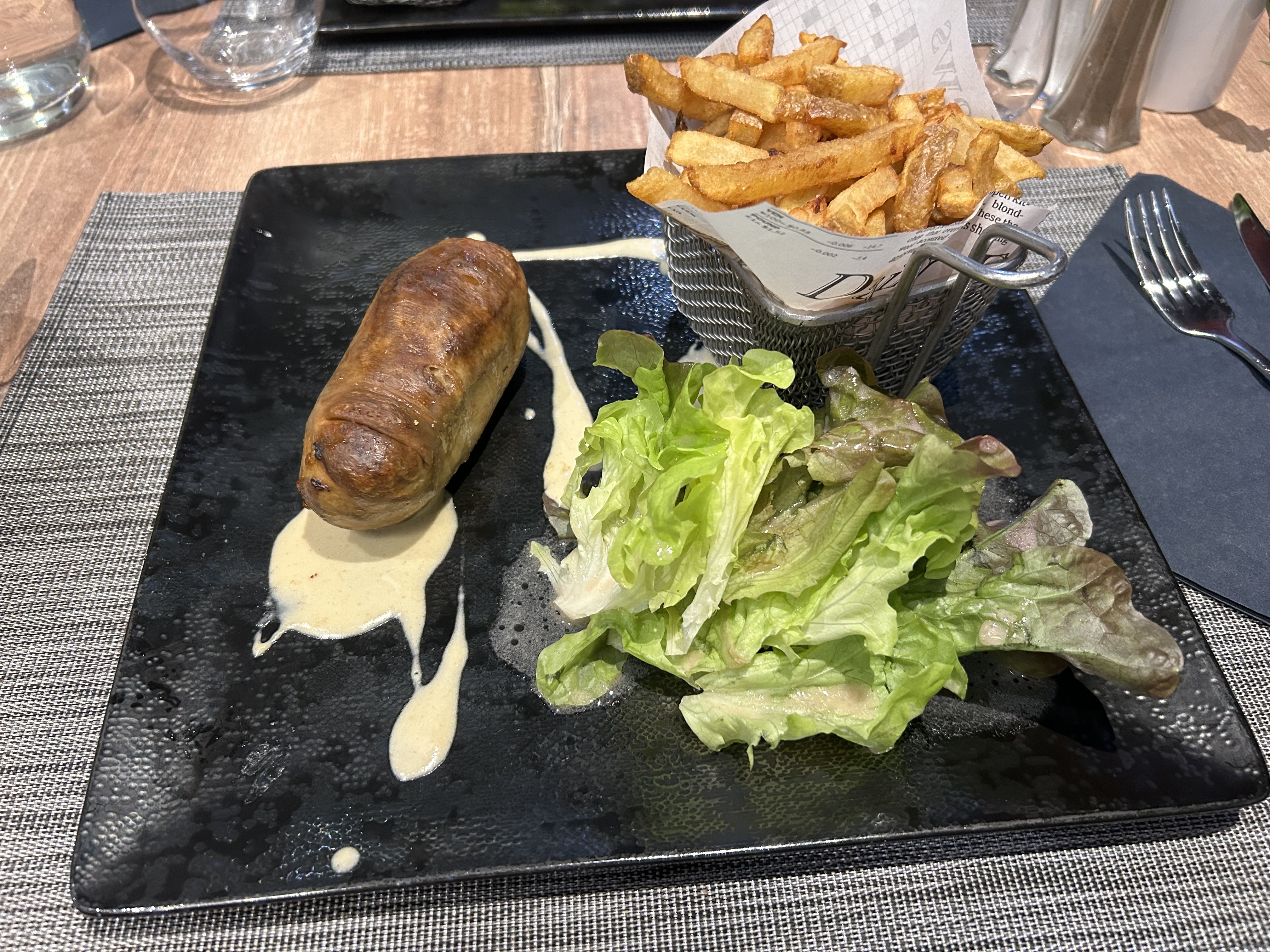 C’est le repas le pire et le plus déplaisant qu’on m’ait servi au cours de mes 80 ans. Un morceau de tendons et de graisse provenant d'une partie indéterminée d'un bœuf accompagné de frites brûlées, qui avaient la consistance de spaghettis. Je n'ai jamais rien vu d'aussi immangeable à l'intérieur des terres, en Afrique ou en Haïti, sur les étals locaux. Une insulte à notre égard et une insulte à la gastronomie française. Je n'ai aucune explication à cela et je ne peux pas croire que cela puisse être une réaction car nous avons indiqué lors de la commande qu'aucun produit à base de porc ne pouvait être utilisé dans la préparation. Mon français n'est pas très bon, mais « dégoutant » me semble être une bonne description.