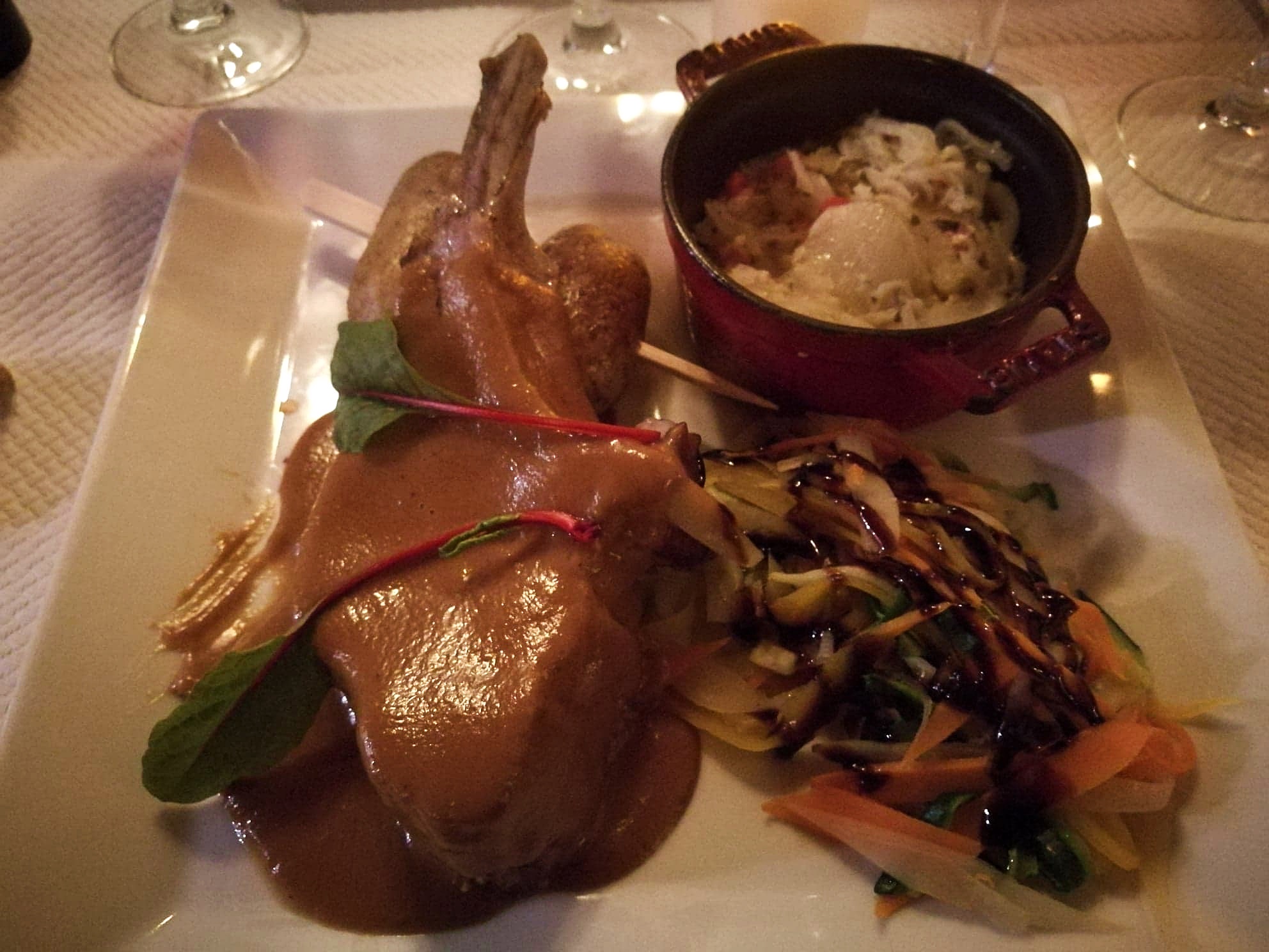 Nous y sommes allés le samedi 25 novembre. Arrivée 13:30. Premier plat servi à 14:30. Avons commandé magret et agneau. Viande bonne mais PAS DE SAUCE et 3 pauvres pommes de terre en guise d'accompagnement pour le magret et de la purée pour l'agneau. Bref je fais la même chose chez moi. Vu les prix ça pourrait être un peu mieux travaillé.