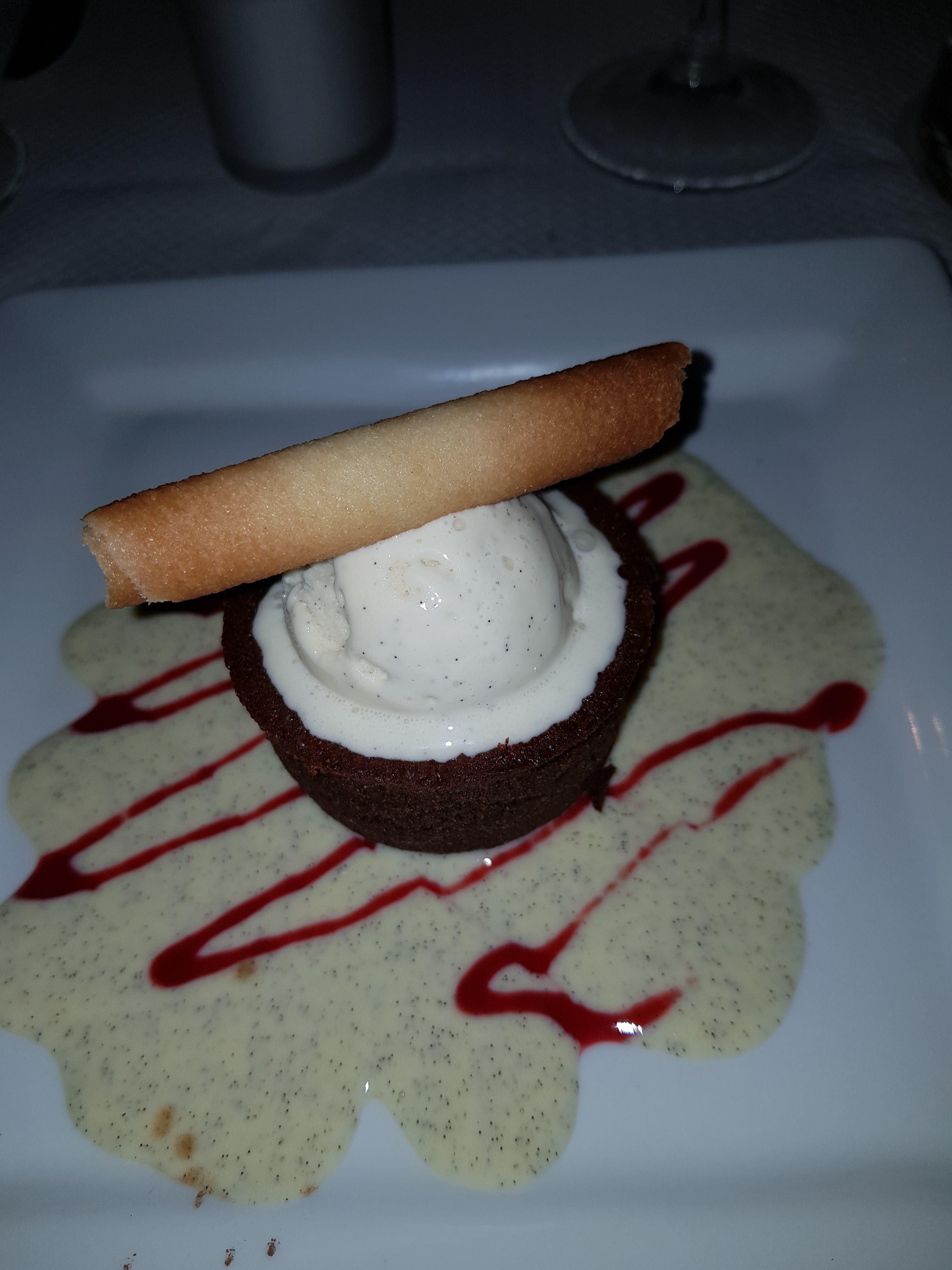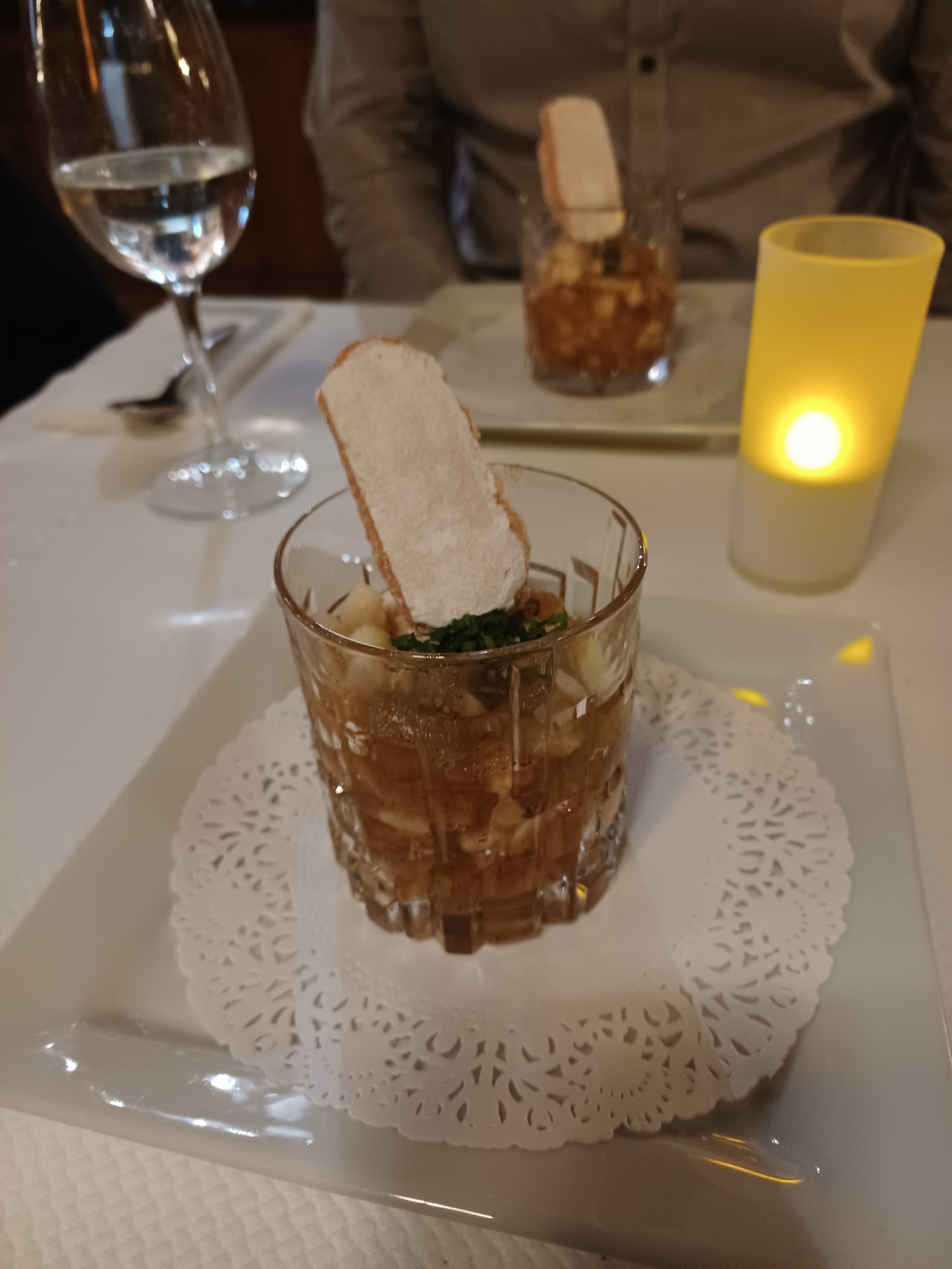 J'ai commencé par casser un verre en rentrant... Le personnel n'a rien laissé transparaître :) Pour le reste, excellente soirée, nous avons très très bien mangé. Et alors le dessert, argh, une merveille : un merveilleux justement. Il porte vraiment son nom :)