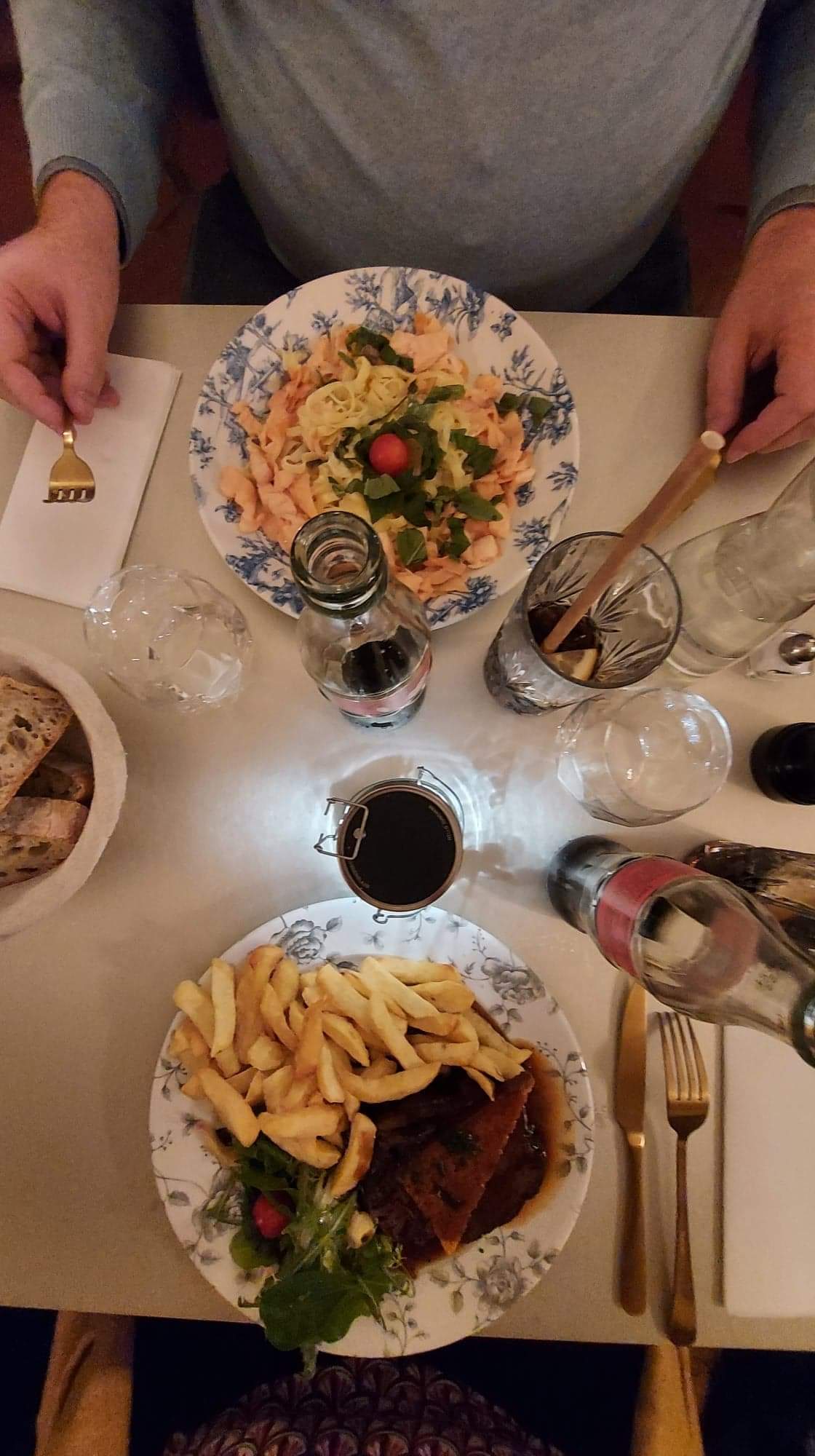 Le repas était bon, la carbonnade excellente et le waterzoï de poisson bon, bien qu'un peu léger (il me semble que c'est servi avec des pommes de terre normalement ? Là non). Et nous avons été surpris que personne ne vérifie notre pass sanitaire...