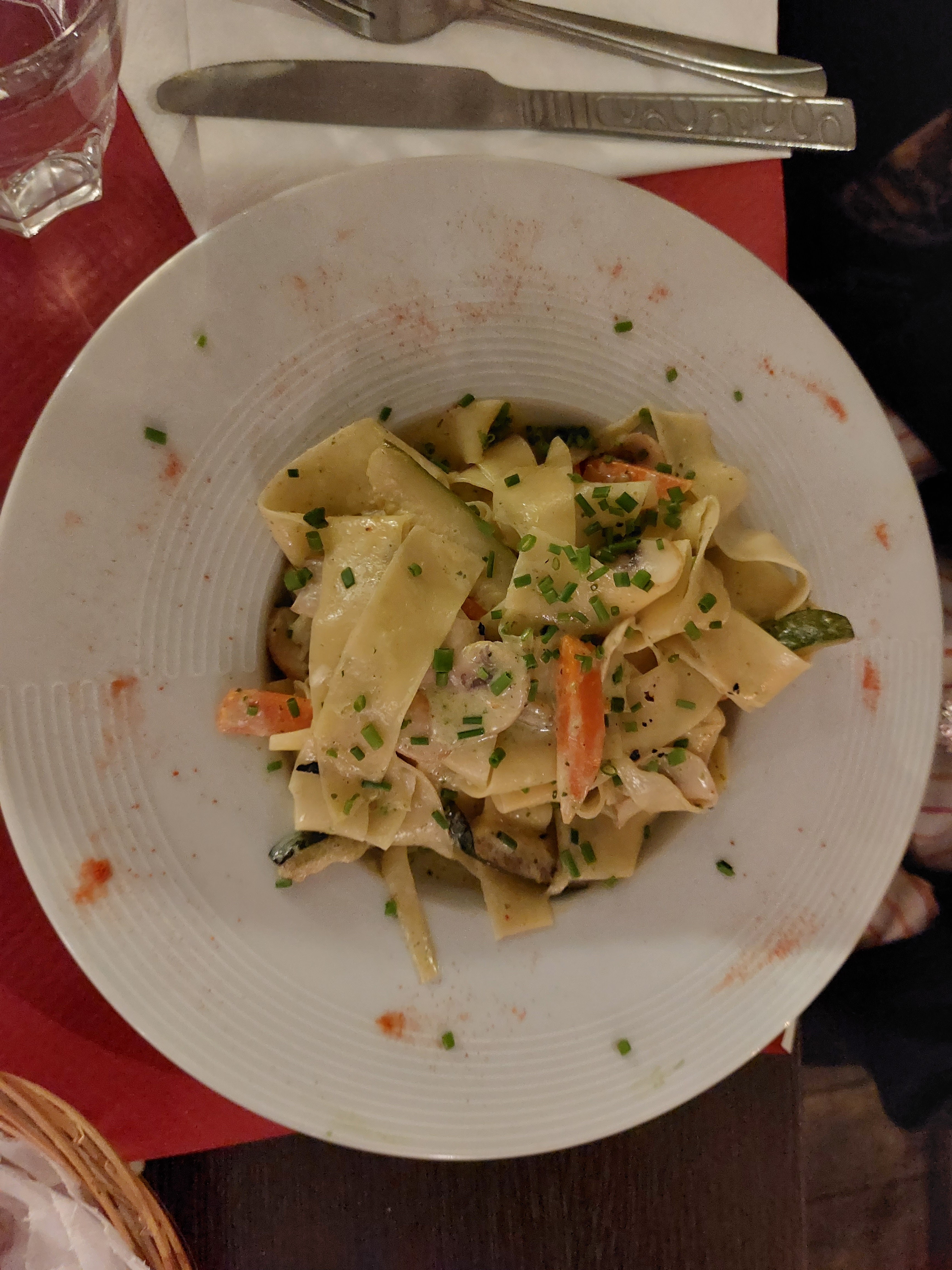 La cuisine est bonne, sans être excellente mais tout semble être fait maison. Mention spéciale pour les tagliatelles végétariennes qui étaient excellentes. Nous avons passé un bon moment. Le gérant est au four et au moulin mais nous n'avons pas attendu entre les plats.