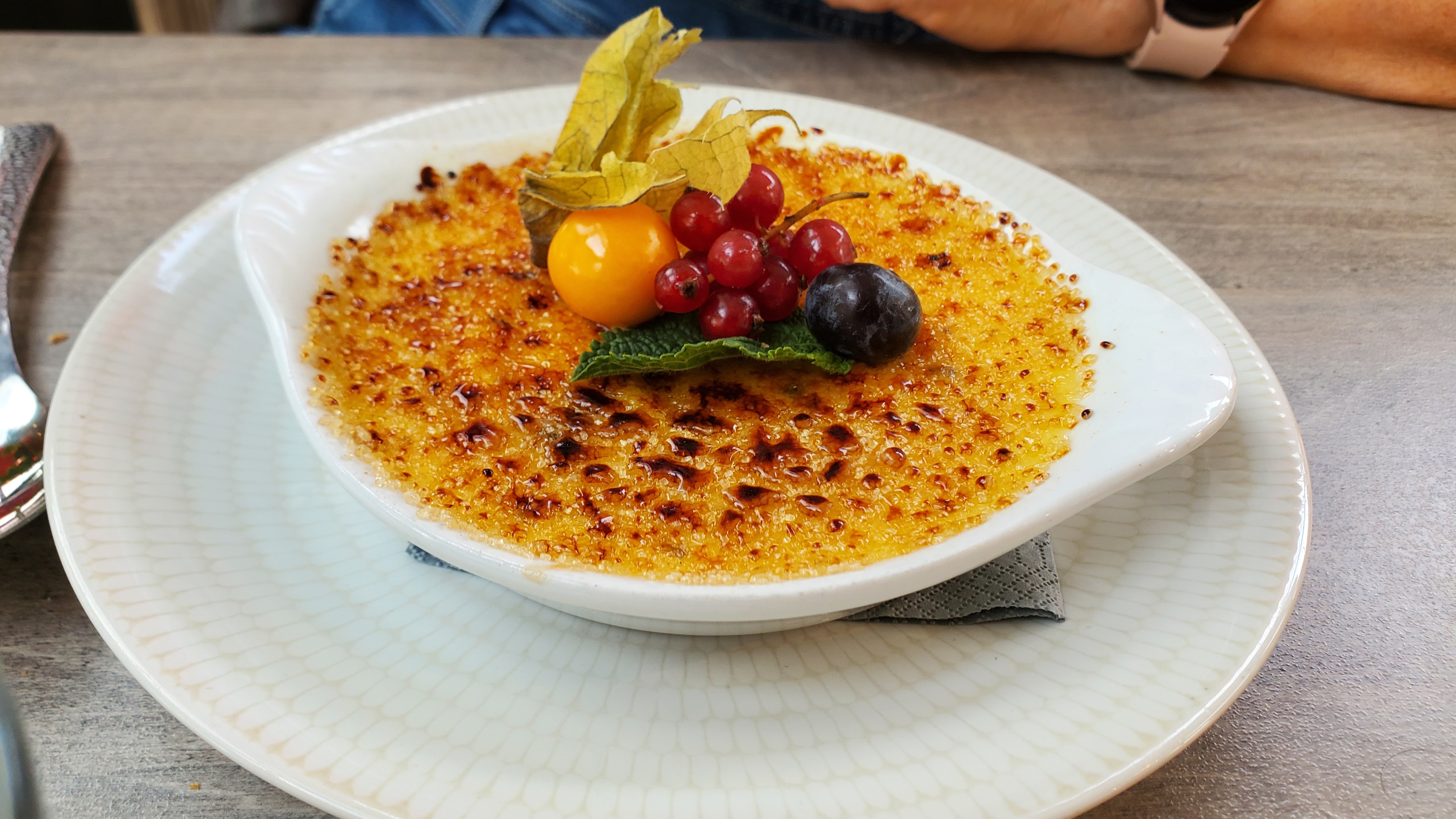 la satisfaction des nourritures terrestres (le bien manger) après le plaisir des nourritures culturelles (le bien visiter) : excellente souris d’agneau puis délicieuse et généreuse crème brûlée : bravo à la cheffe et merci au sympathique serveur