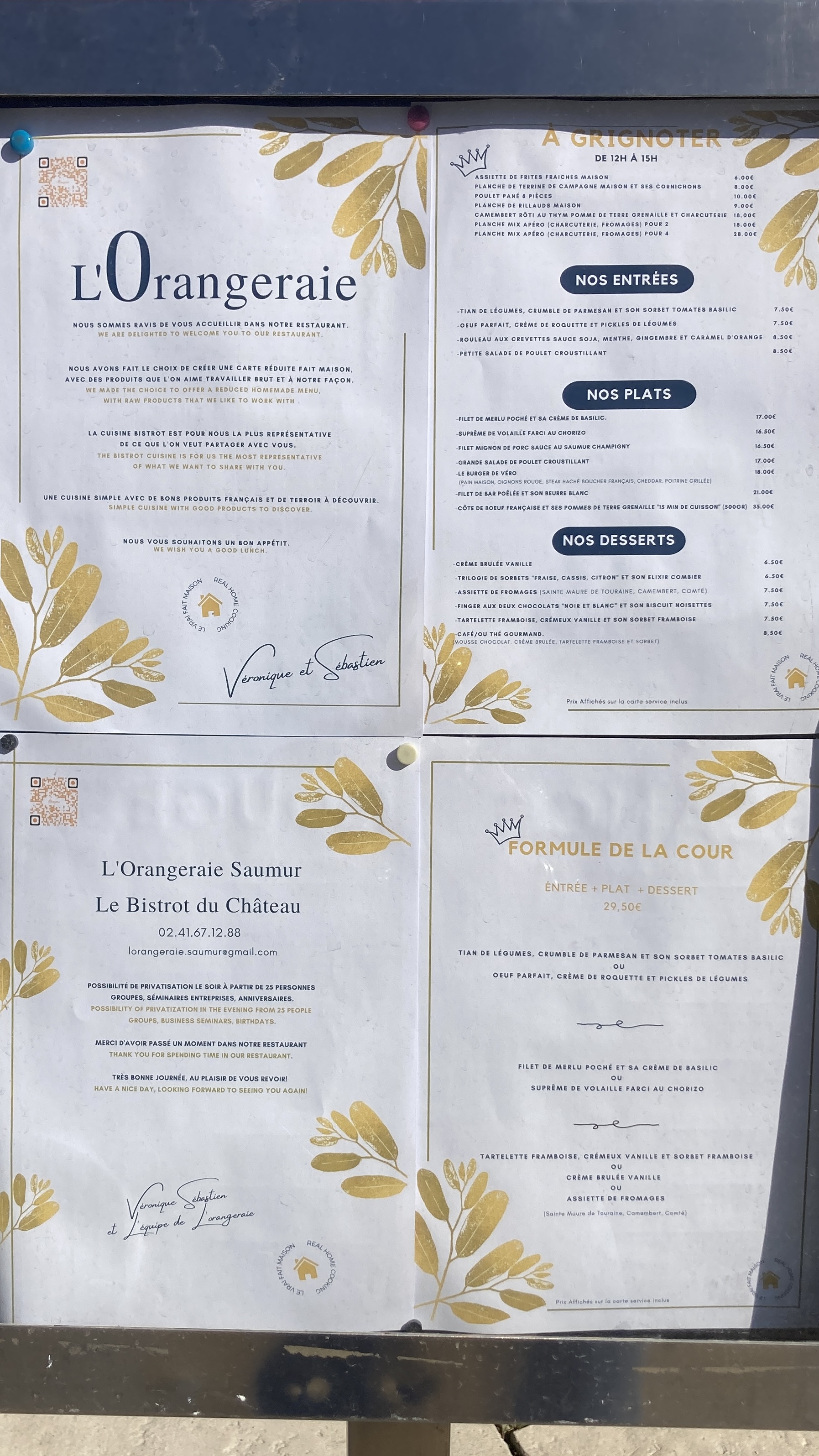 En visite sur Saumur, nous avons été invité en surprise à l'orangeraie. Très belle découverte avec un rapport qualité/prix impressionnant. Nous avons pris l'entrée petit pois avec œuf parfait et entrée saumon chèvre sablé parmesan:un régal pour les deux. Pour les plats: joue de porc et pêche du jour (dos de cabillaud), excellent. Les plats sont de qualités, en bonne quantité et avec une très belle présentation digne d'un restaurant. Un serveur très sympathique viens compléter ce beau tableau. Nous recommenderons vivement cette adresse et reviendrons à l'occasion !!