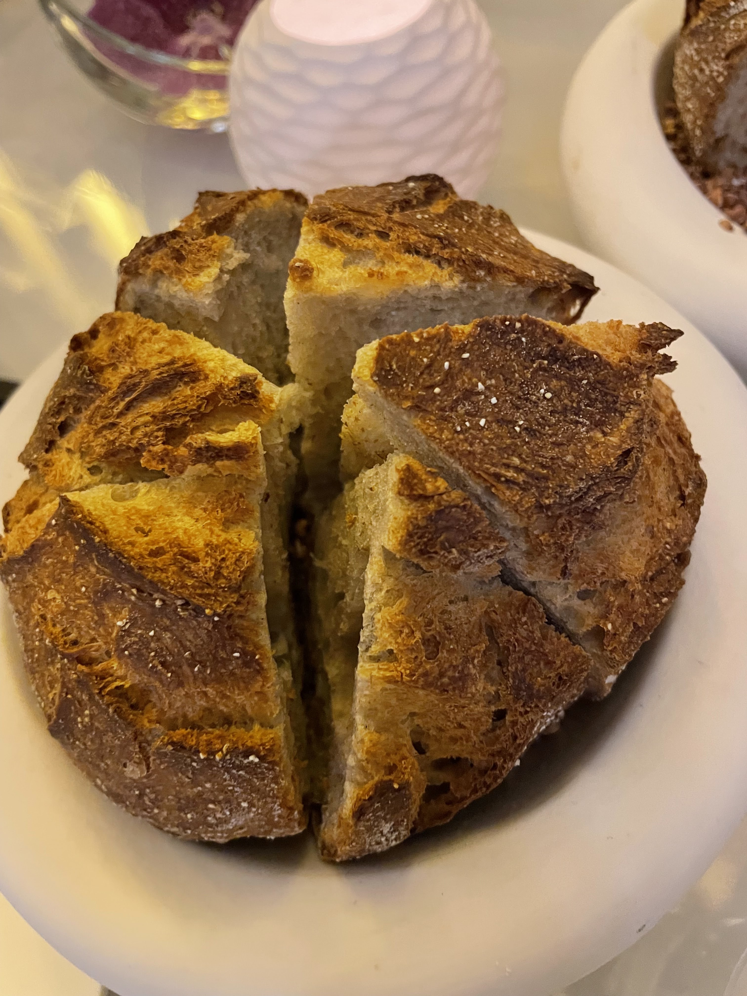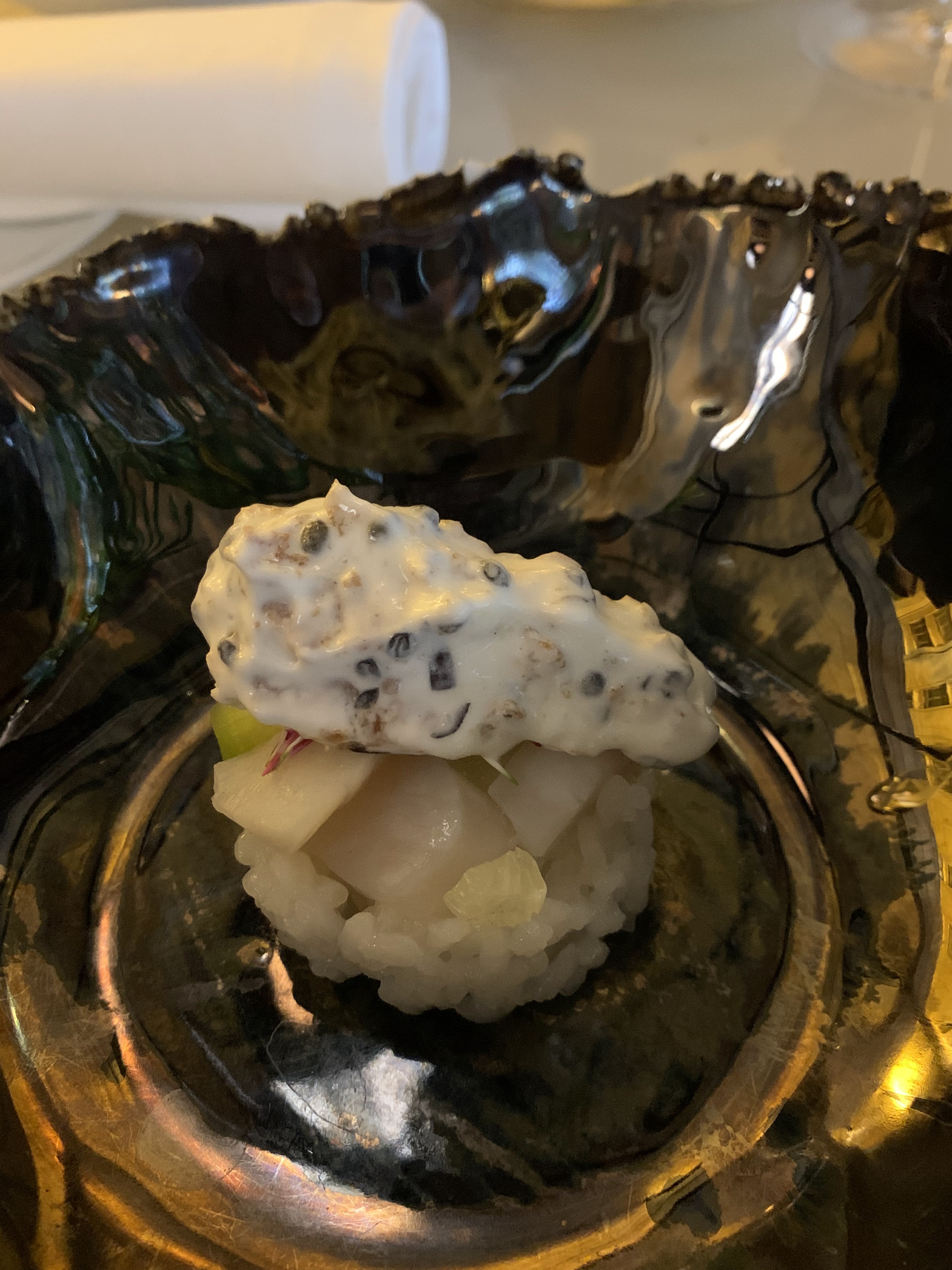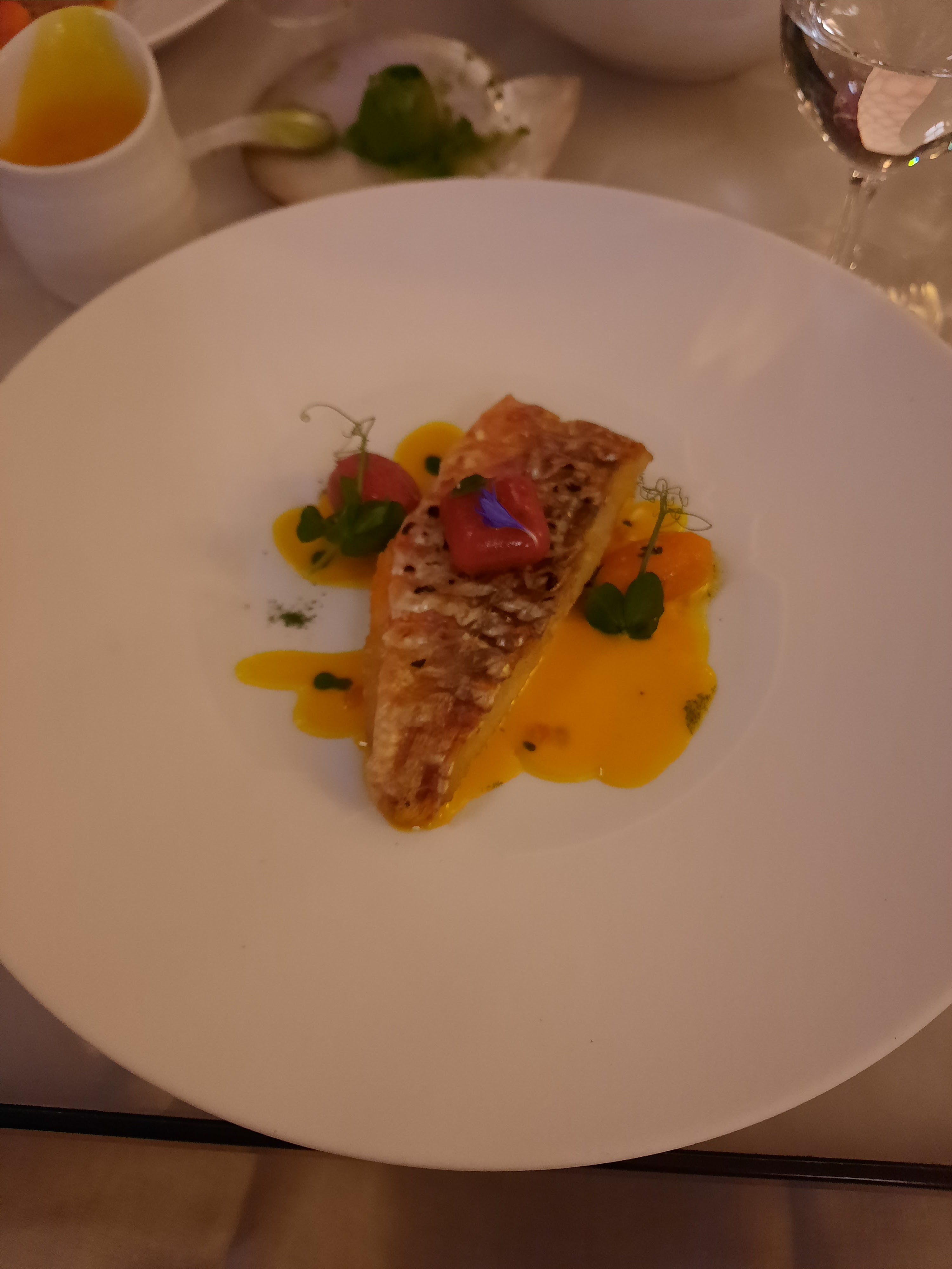 Excellente présentation et bonne nourriture, le service global est bon mais manque un peu quand ils sont occupés tout au long de la soirée. En particulier, un plat destiné à mon partenaire lors de notre menu dégustation n'a pas été expliqué du tout et a simplement été déposé devant lui. Ce n'est pas un problème majeur mais ce n'est pas ce que l'on attend d'un restaurant étoilé Michelin. Le sommelier était super et nous avons choisi une bouteille de champagne Bollinger millésimé 1995 pour accompagner les plats du soir. Cela s'est très bien passé avec notre nourriture. Nous avons tous deux convenu que le restaurant devrait avoir plus d'une étoile Michelin et nous avons été ravis de découvrir le lendemain de notre visite qu'il avait obtenu sa 2 e étoile. Un immense bravo 👏👏 Le beurre de graines avec leur pain était remarquable à mon avis. Je n'ai pas apprécié l'un de mes plats qui était un peu trop écrasant à cause de la truffe qui n'est que ma préférence personnelle. C'était si riche que je ne pouvais pas manger plus qu'une bouchée et mon partenaire l'a terminé pour moi. Nous avons ensuite pris un autre verre au bar de l'hôtel.